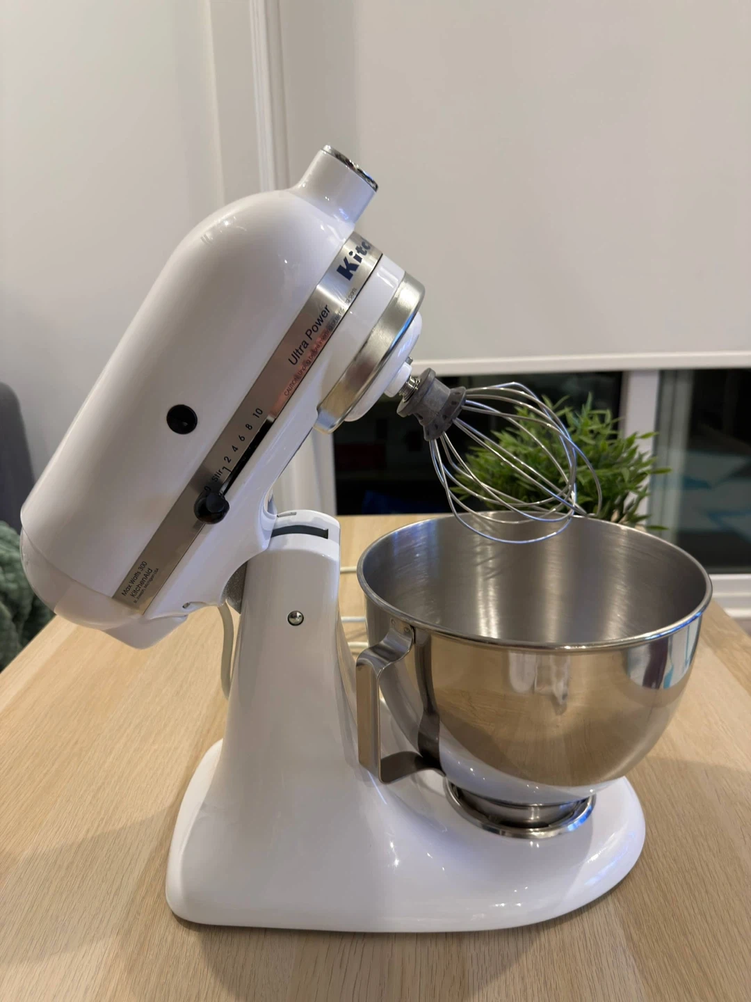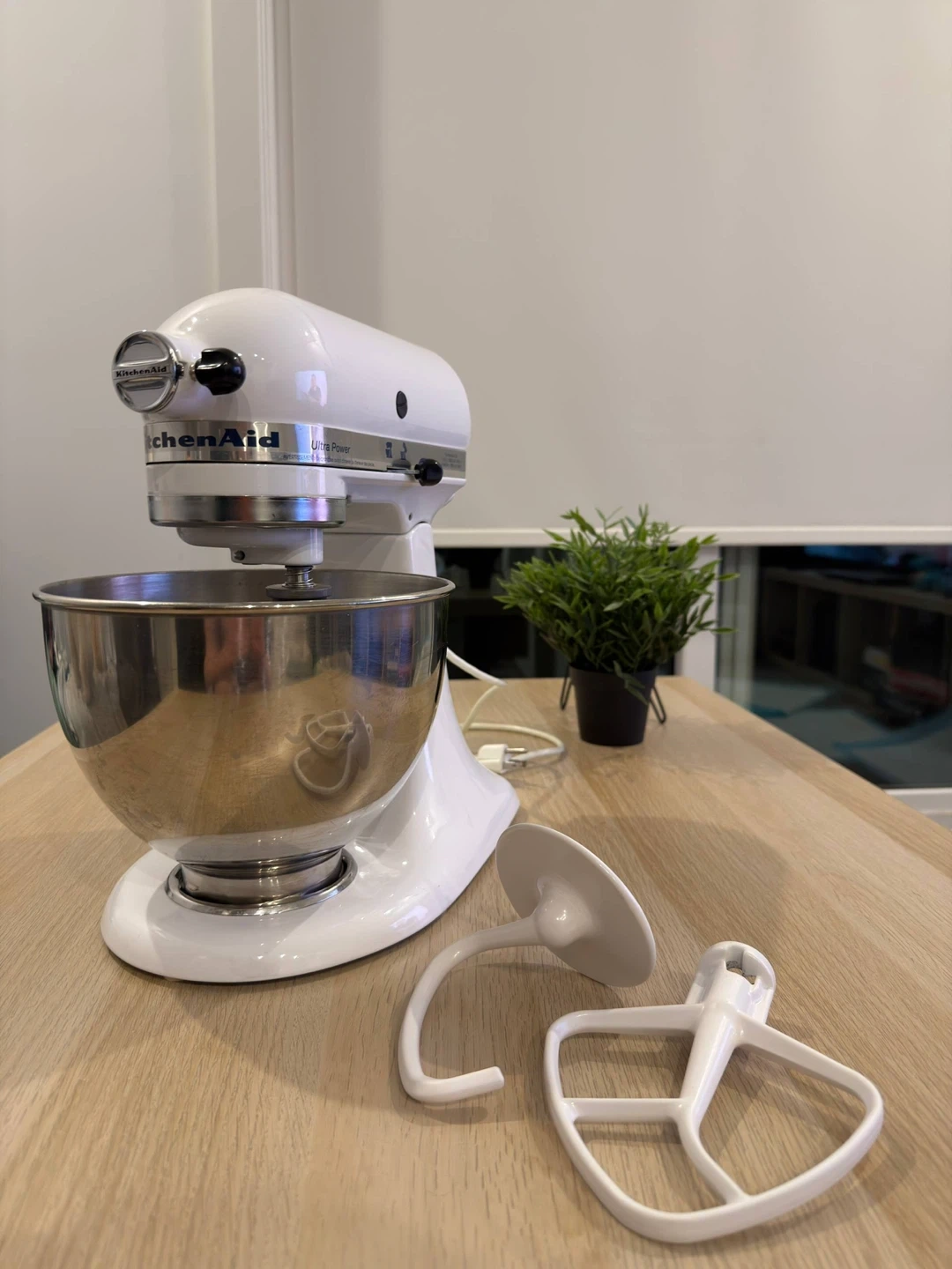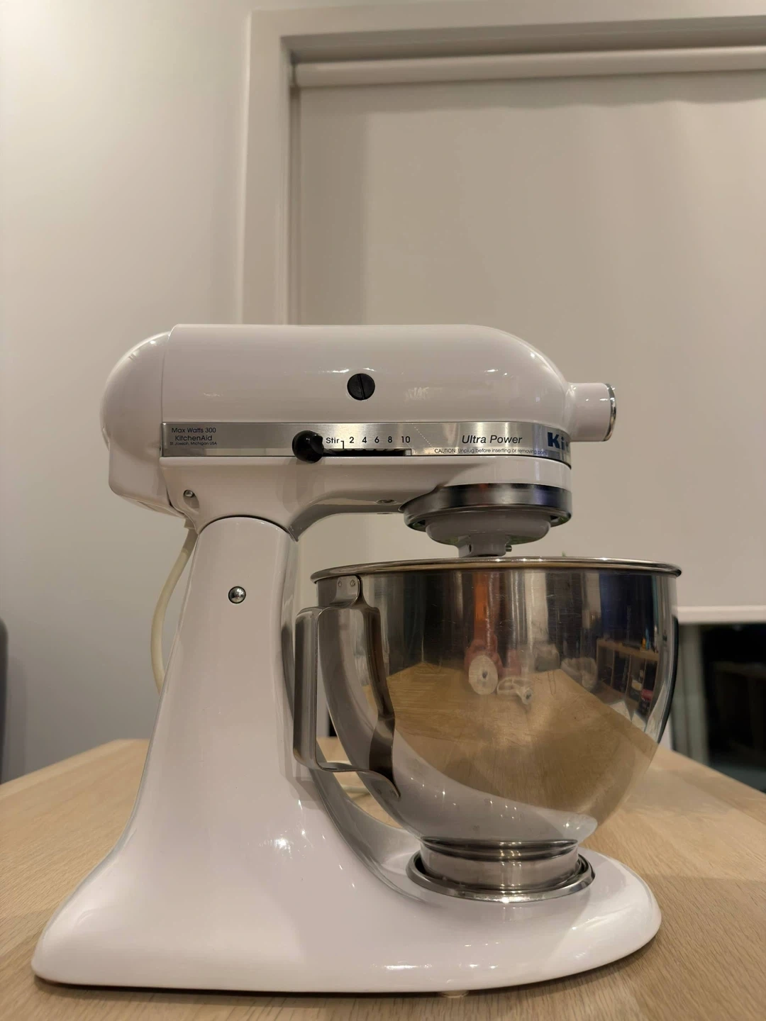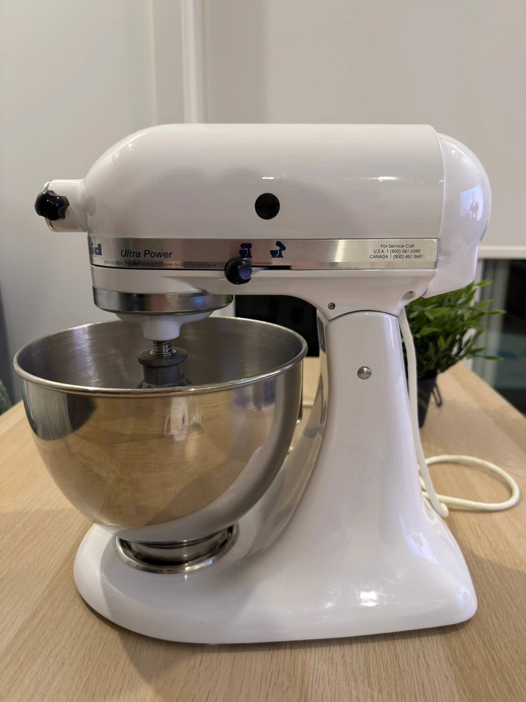 Looking to sell my KitchenAid Ultra Power stand mixer in white. It comes with the stainless steel bowl and several attachments, including the whisk, dough hook, and flat beater. This mixer is perfect for all your baking needs!