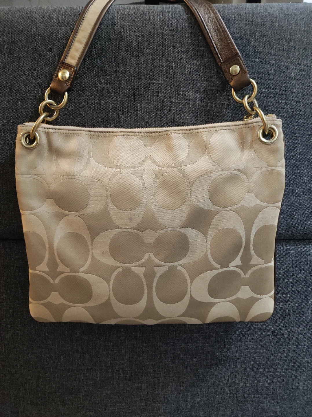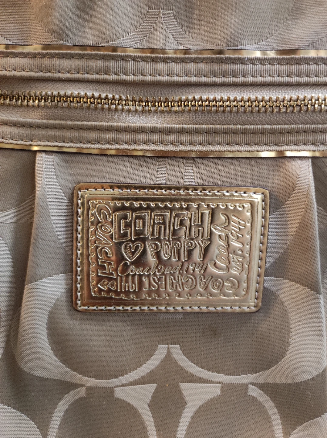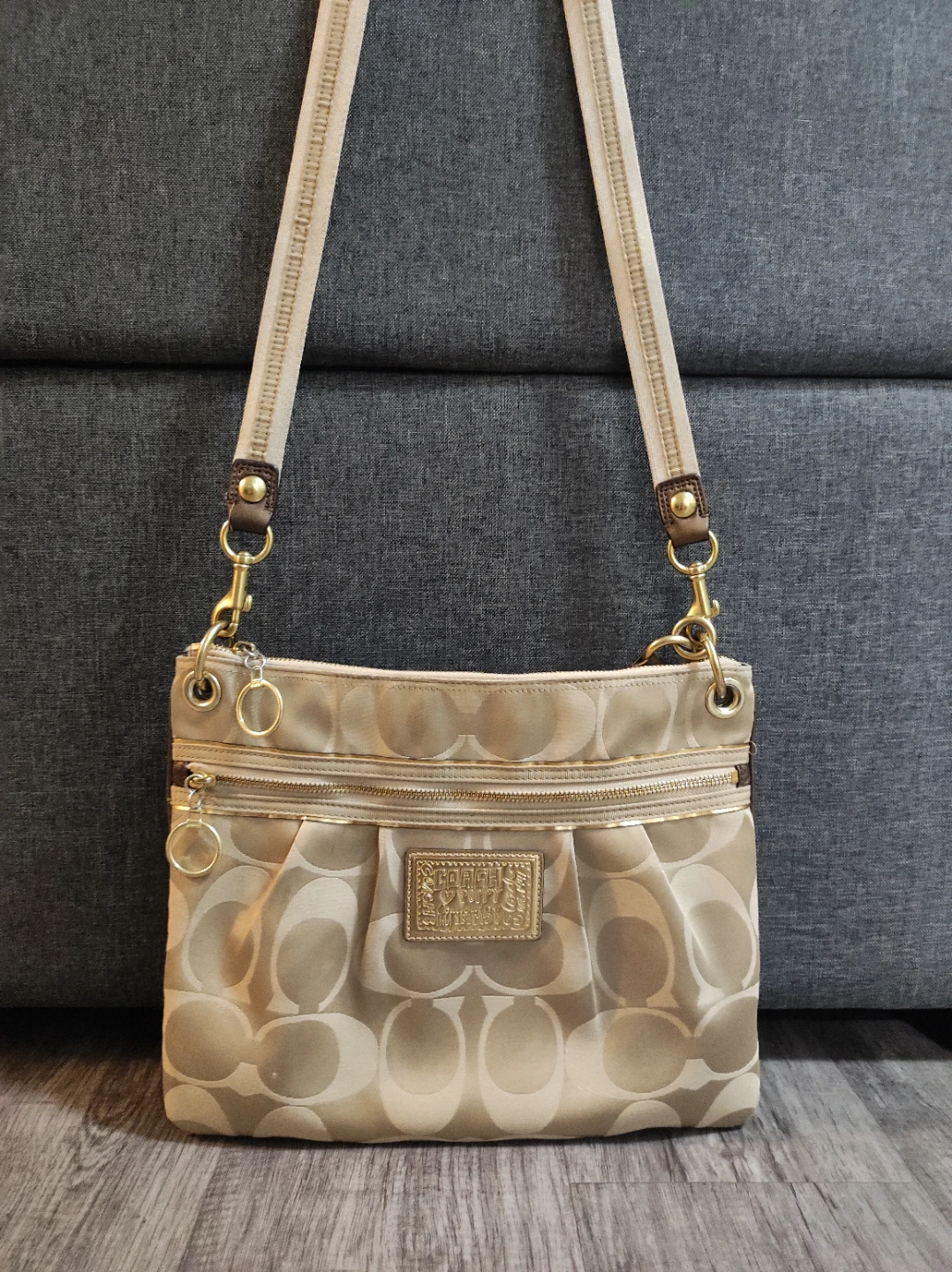 Classic Coach Poppy bag. Can be worn on the shoulder or crossbody. Classic C signature fabric with gold logo plate and hardware. Brown leather trim.