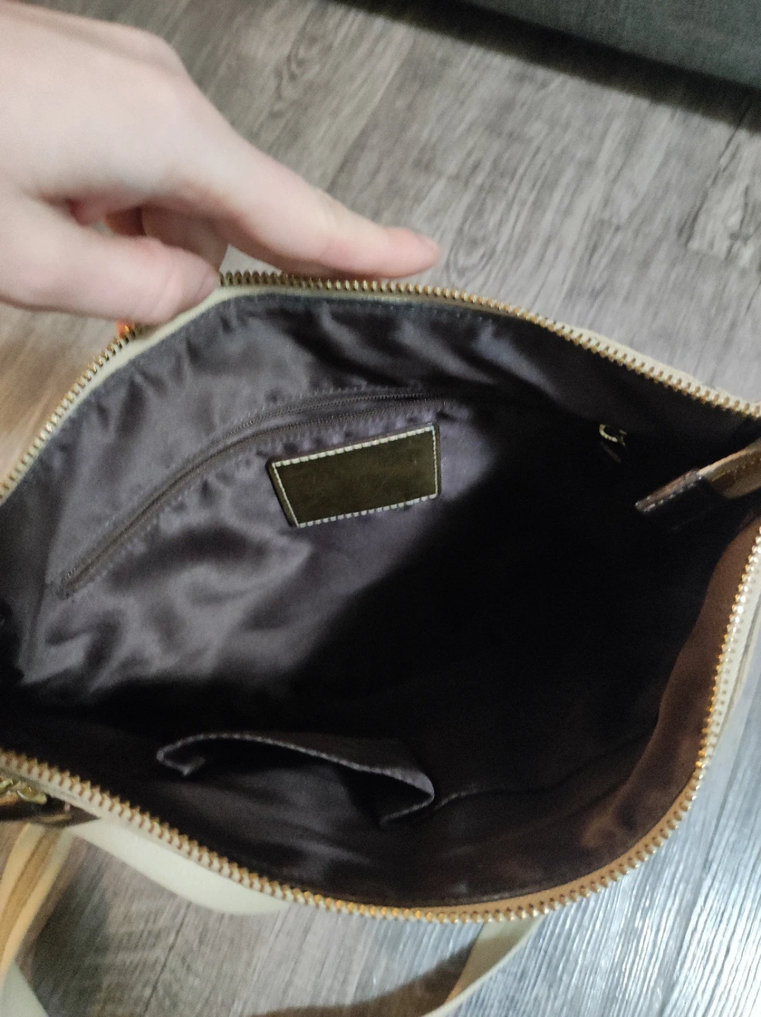 Zipper closure. One zipped front pocket. Interior has 3 pockets, one with zipper.
