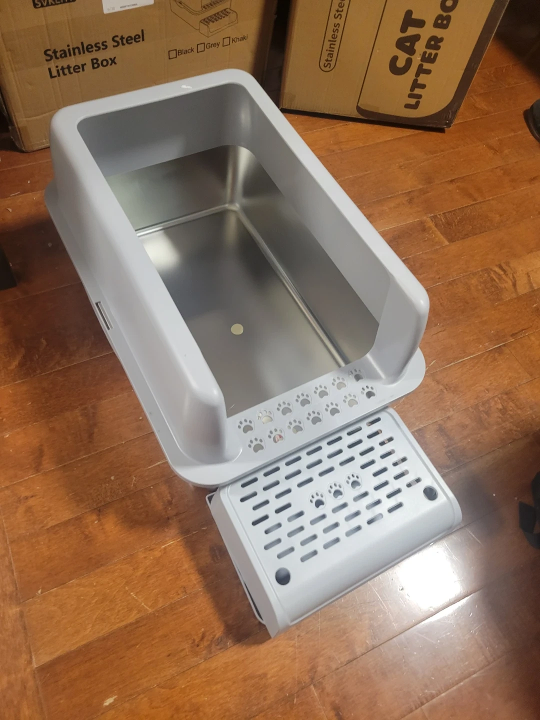 Selling a stainless steel cat litter box in grey! It's in great condition and ready for a new home. The box includes a stainless steel interior and a paw-print step to help keep things tidy