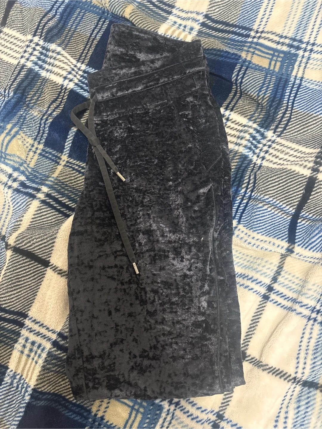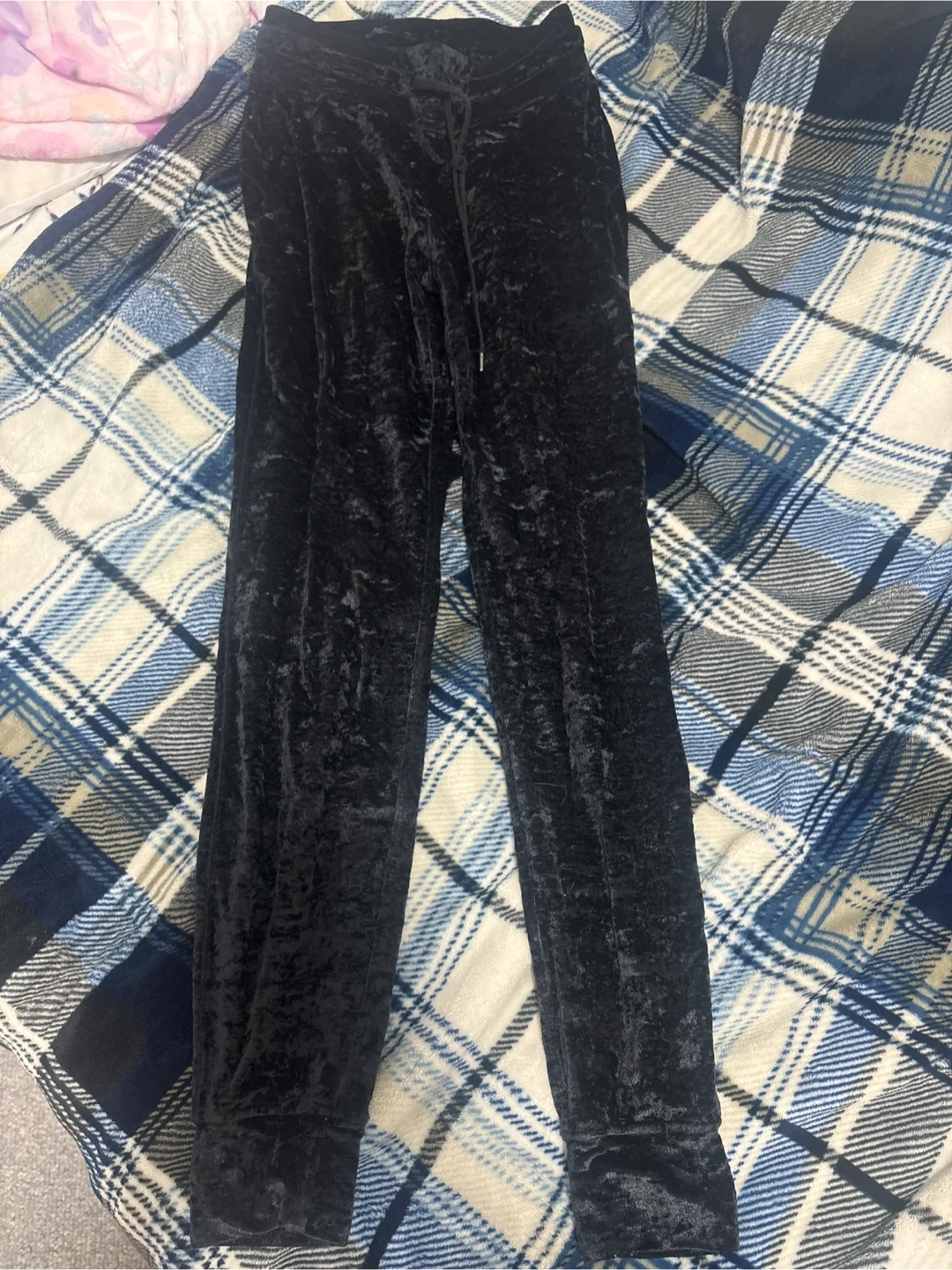 Selling a pair of comfy black velvet jogger pants! They have a soft and luxurious feel, perfect for lounging or casual wear. The joggers feature a drawstring waist for an adjustable fit. They're in great condition and ready for a new home! Size 4 pick up cash only