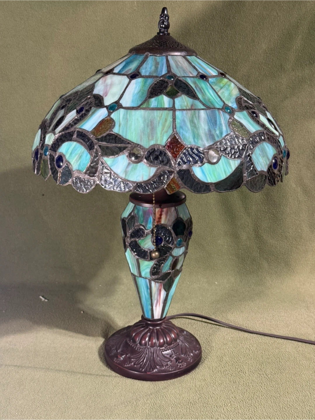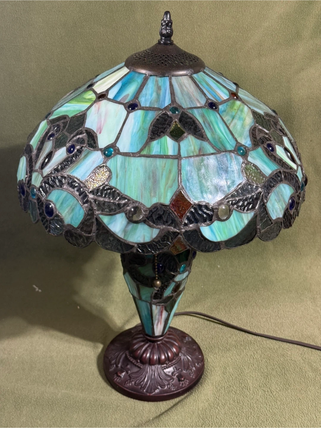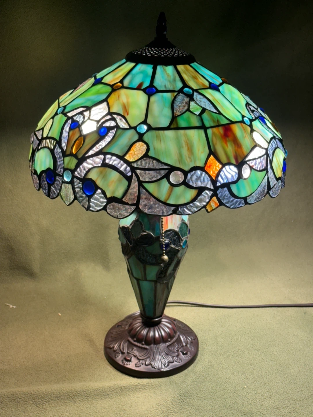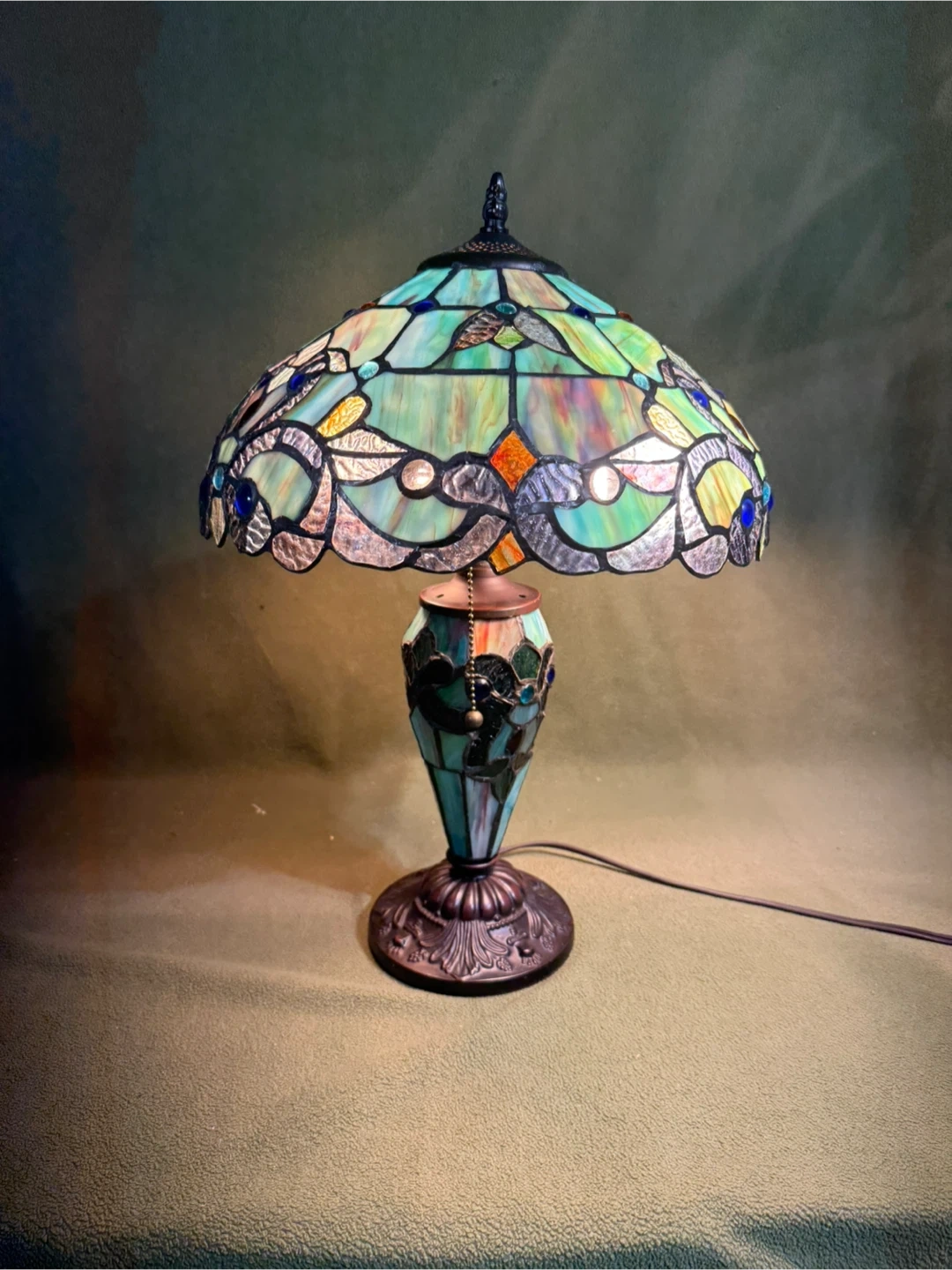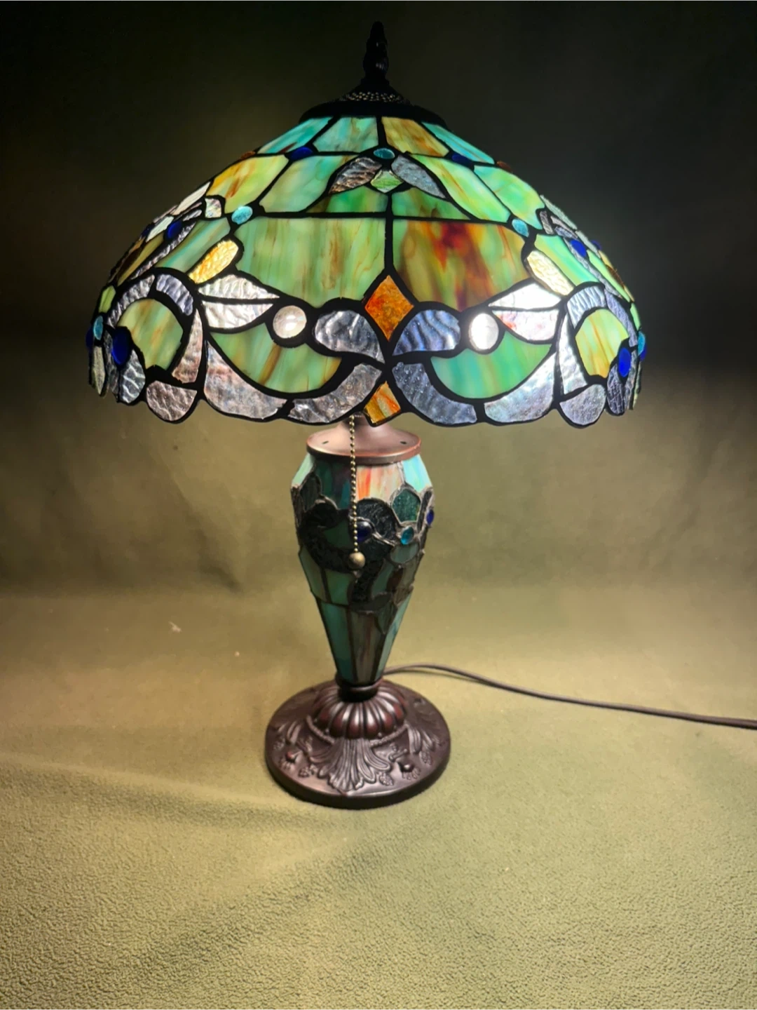 Illuminate your space with this exquisite Tiffany Style stained glass lamp, showcasing vibrant greens, blues and amber hues that create a warm and inviting ambiance. This lamp features a beautifully crafted stained glass shade and an intricately designed base, adding a touch of vintage elegance to any room. This is a used item, but in excellent condition.
