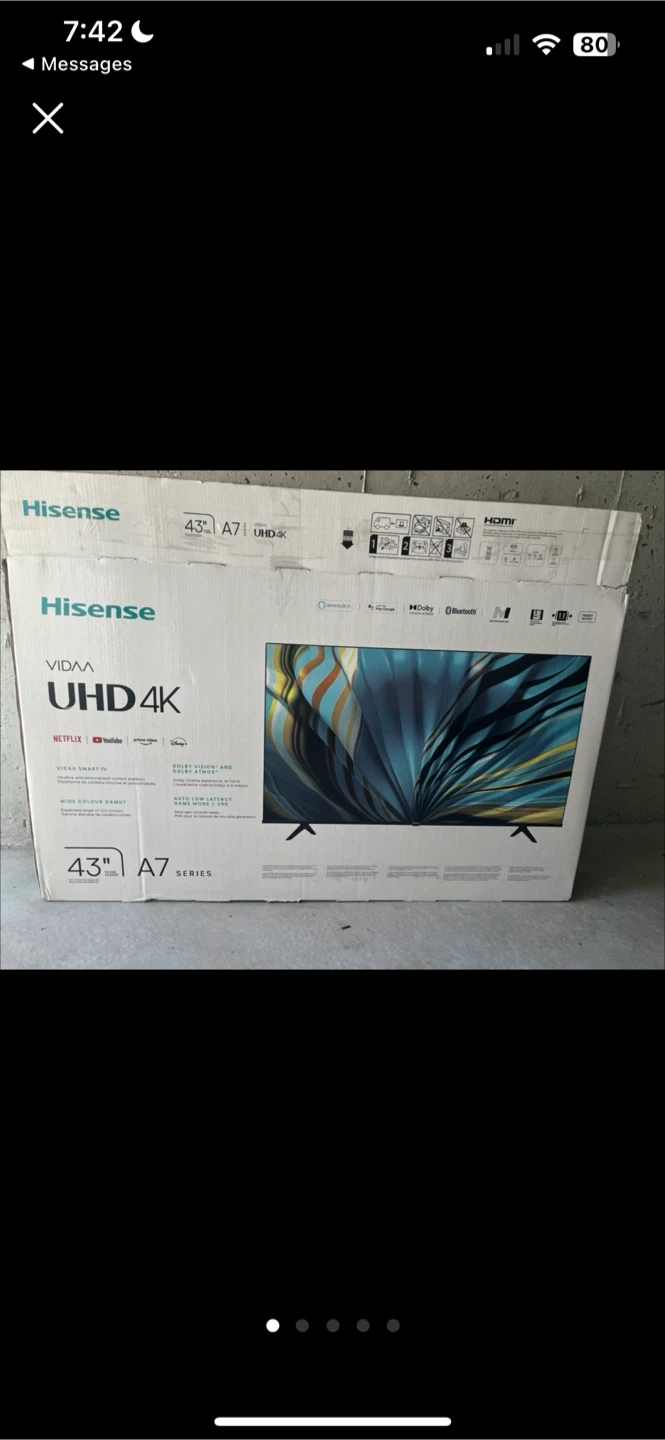 Selling a Hisense 43" A7 Series VIDAA UHD 4K Smart TV. It comes with a variety of apps such as Netflix, YouTube, Disney+, and Crave pre-installed. The TV is in great condition and the box is missing because i put it outside in the rain and it got wet