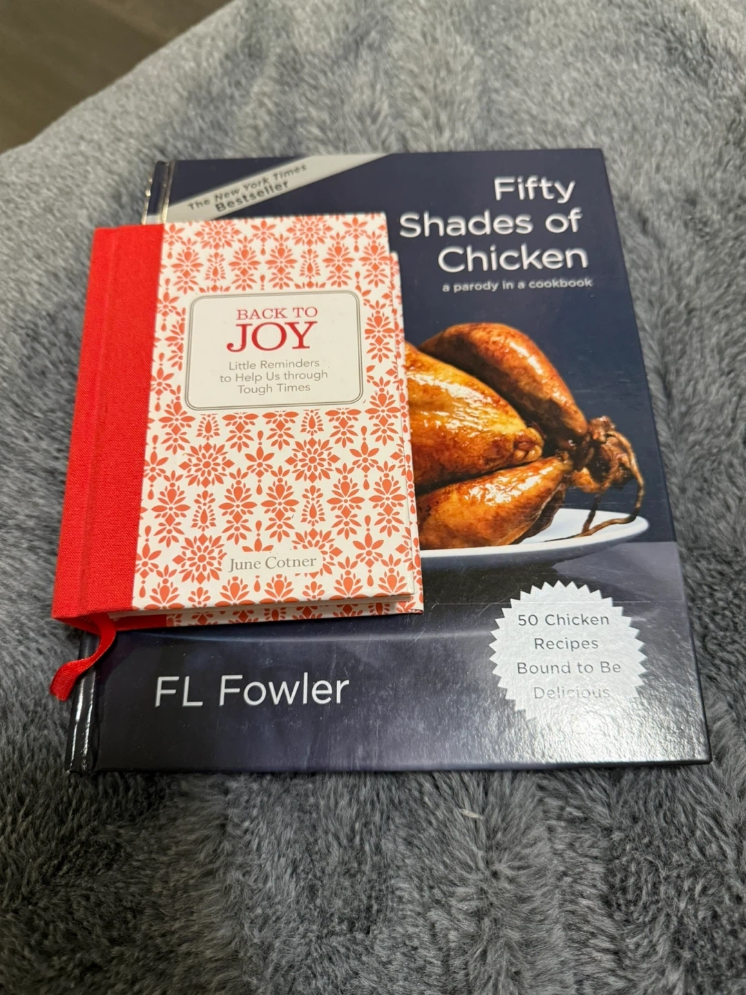 Giving away two books! One is "Fifty Shades of Chicken: A parody in a cookbook" by F.L. Fowler, a New York Times Bestseller. The other is "Back to Joy: Little Reminders to Help Us through Tough Times" by June Cotner. Both are in great condition! Take one or take both!