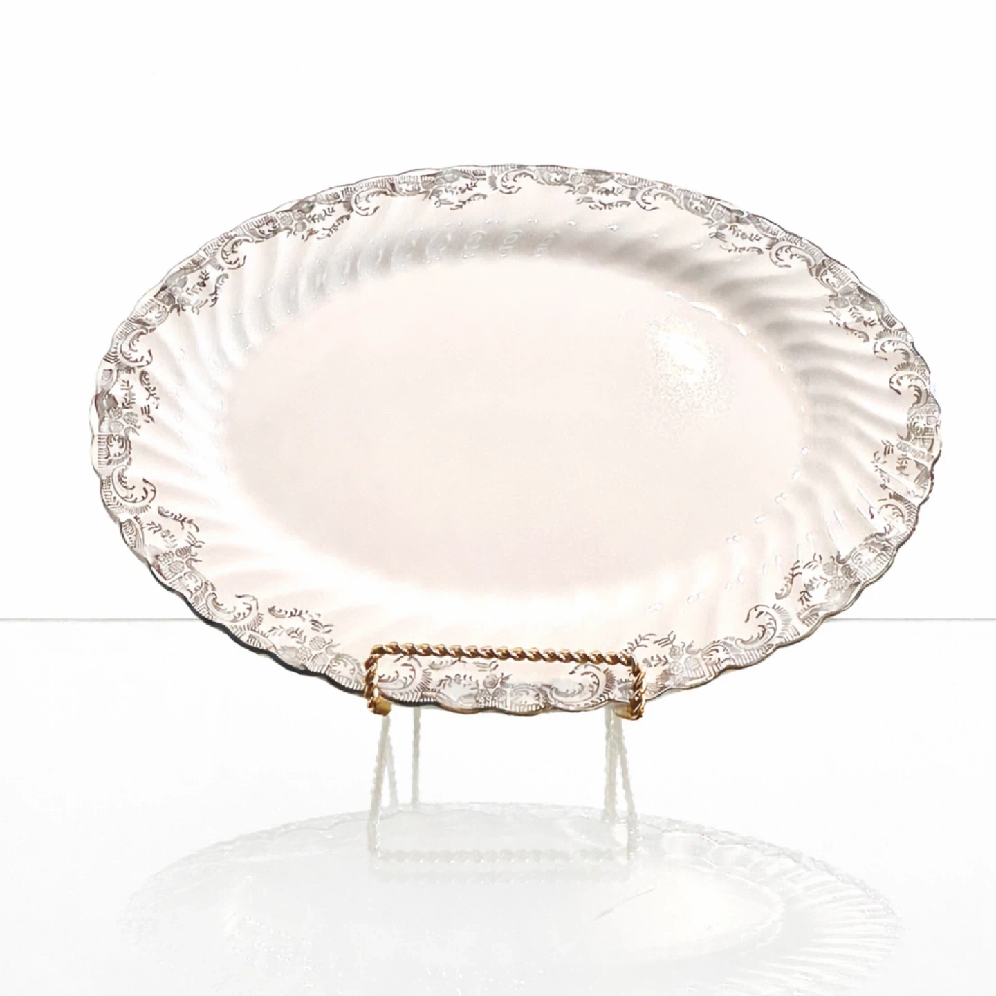 An exceptionally clean Johnson Bros “Snowhite Regency” oval Ironstone serving platter, Made in England, presented in collector-grade condition with crisp monochrome border work and a refined scalloped rim. The piece reads as a classic mid-century English tableware form—quietly luxurious, highly usable, and increasingly difficult to source in this level of preservation.