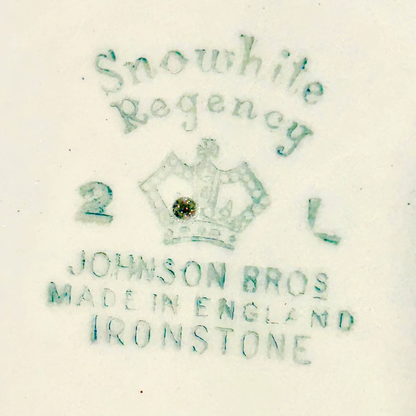 • Mark: Green backstamp reading “Snowhite Regency / Johnson Bros / Made in England / Ironstone” with a crown device, as photographed.