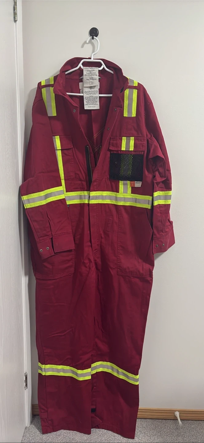Selling a Carhartt flame-resistant coverall in size 50 regular. It's a great piece for workwear, featuring reflective stripes for enhanced visibility. Perfect for staying safe and comfortable on the job! Pick up cash only