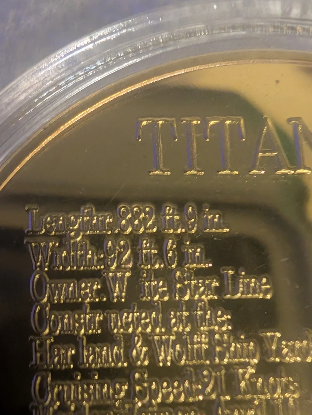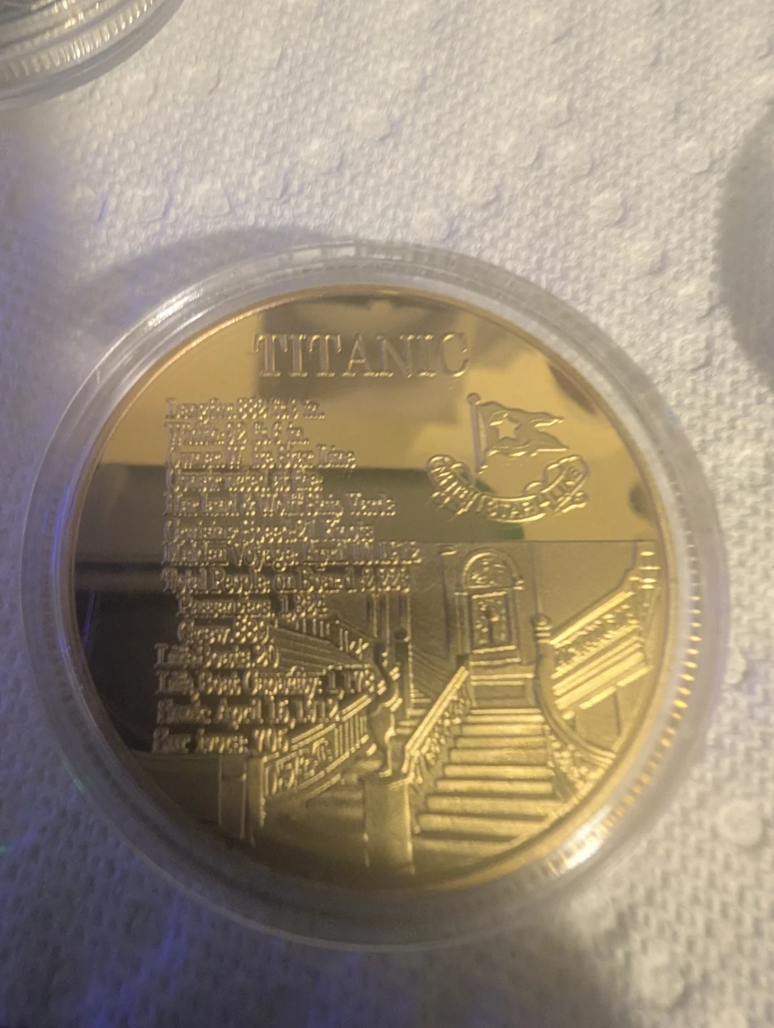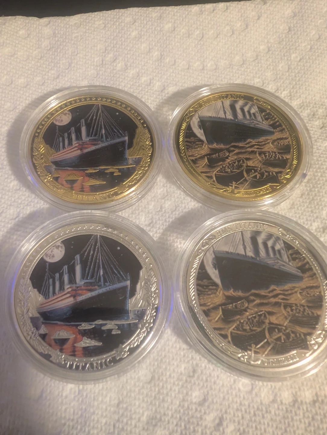 Selling a set of commemorative coins featuring the RMS Titanic. The coins are in protective cases. One coin is gold-toned and the other is silver-toned. The coins have details such as the ship's length (882 ft 9 in) and width (92 ft 6 in) etched on them