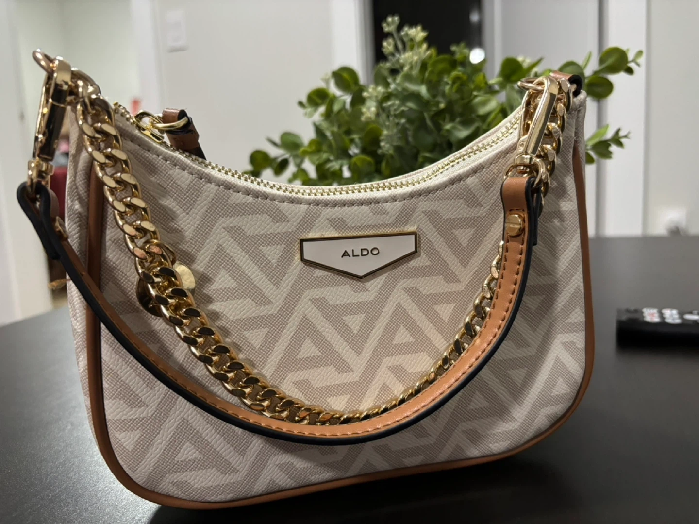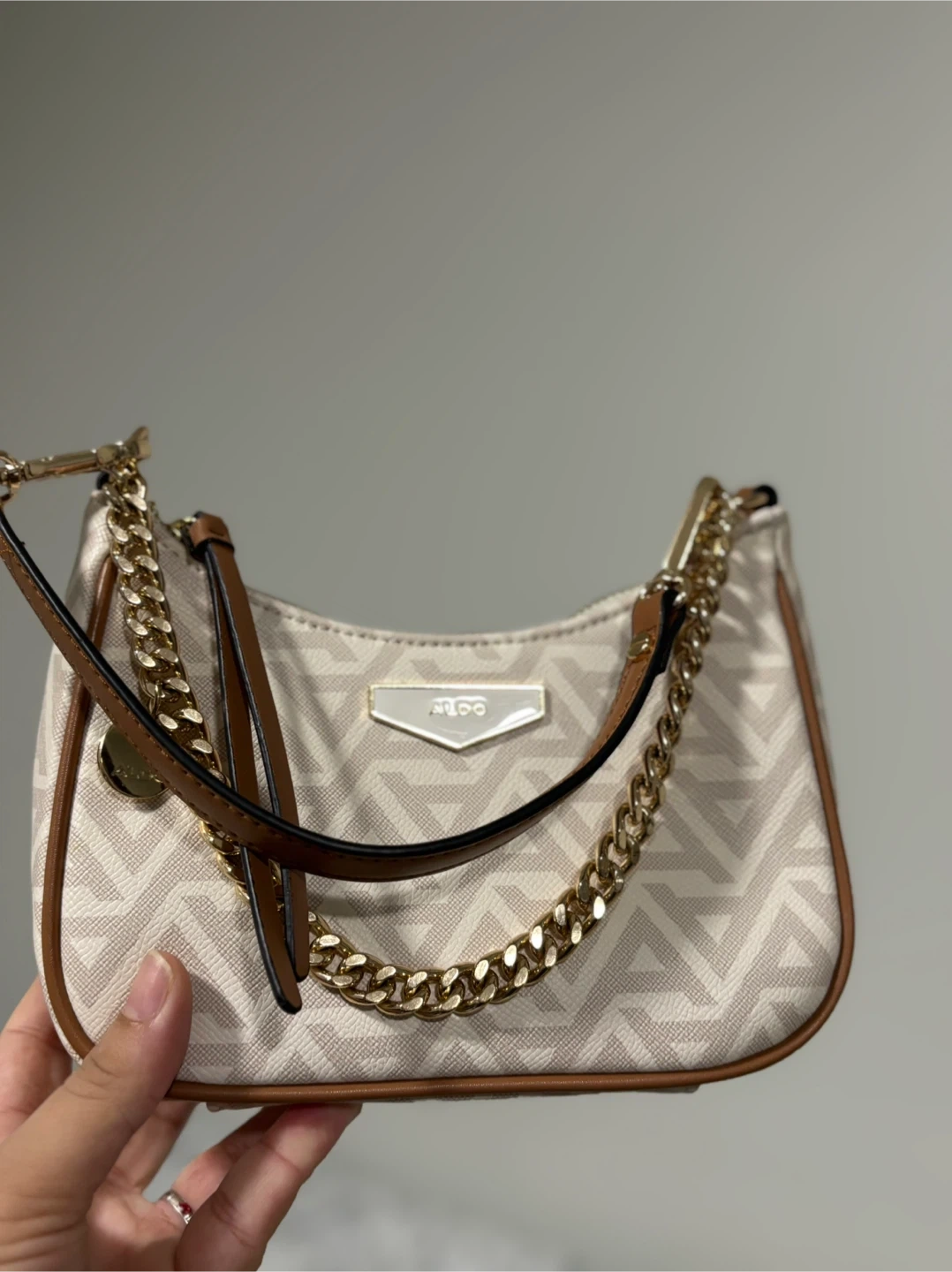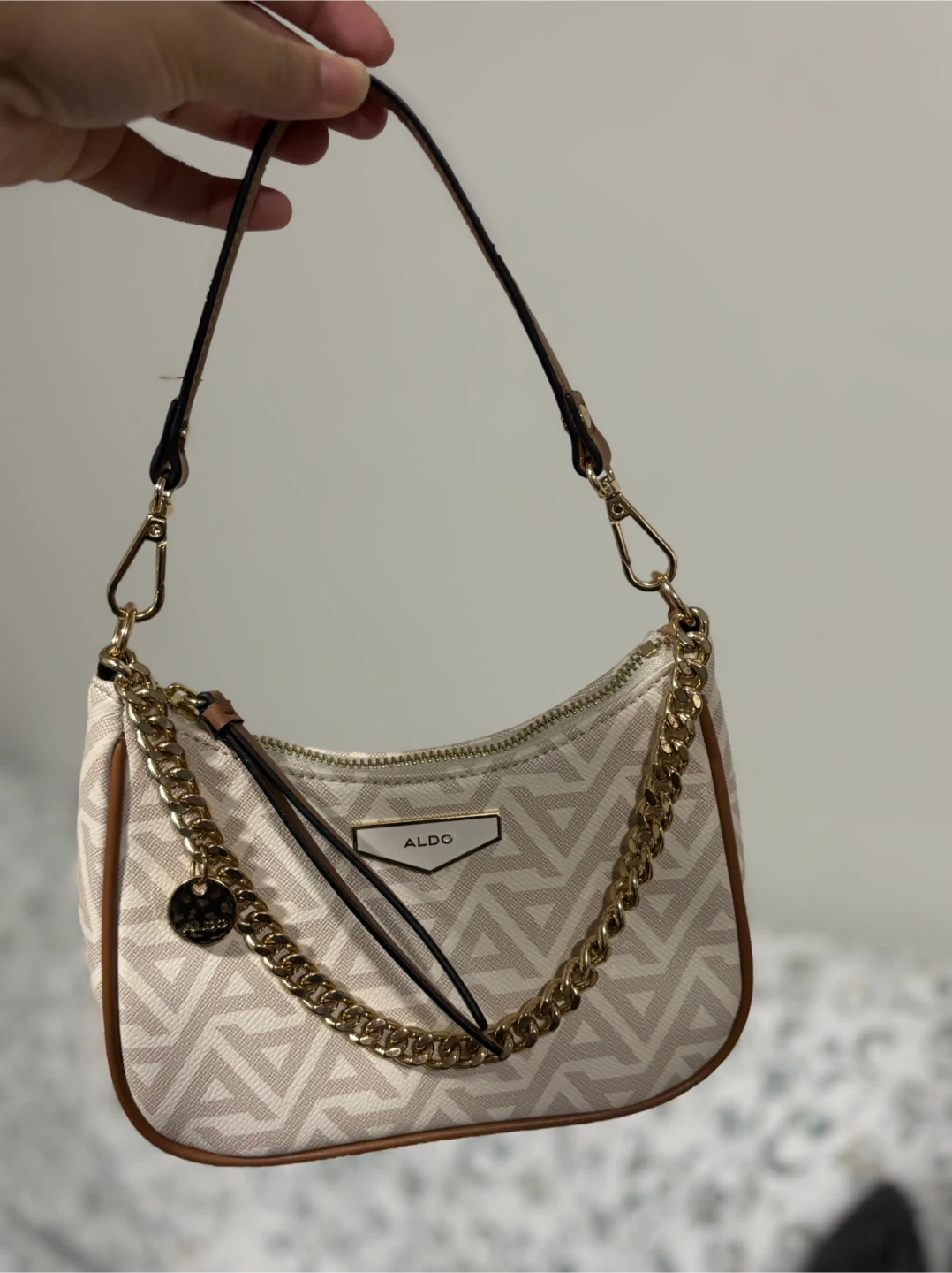 Gently used ALDO shoulder bag in great condition. Features a stylish geometric pattern and gold chain detail. Perfect for adding a touch of elegance to any outfit!