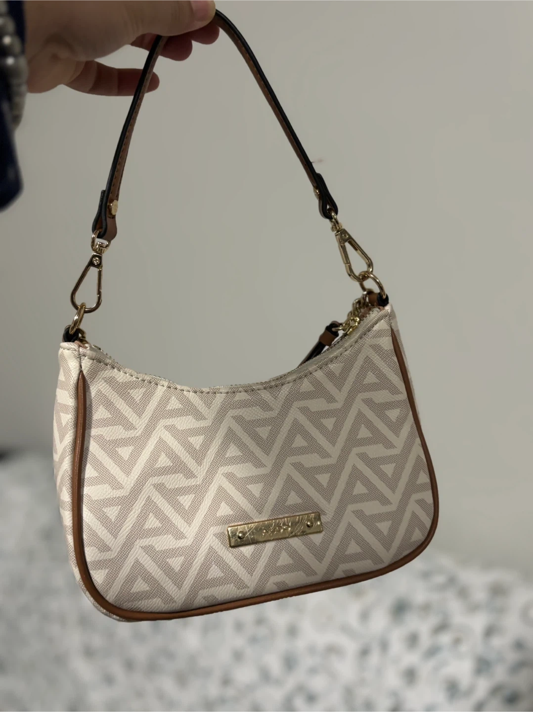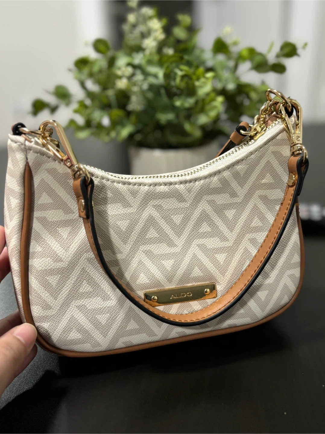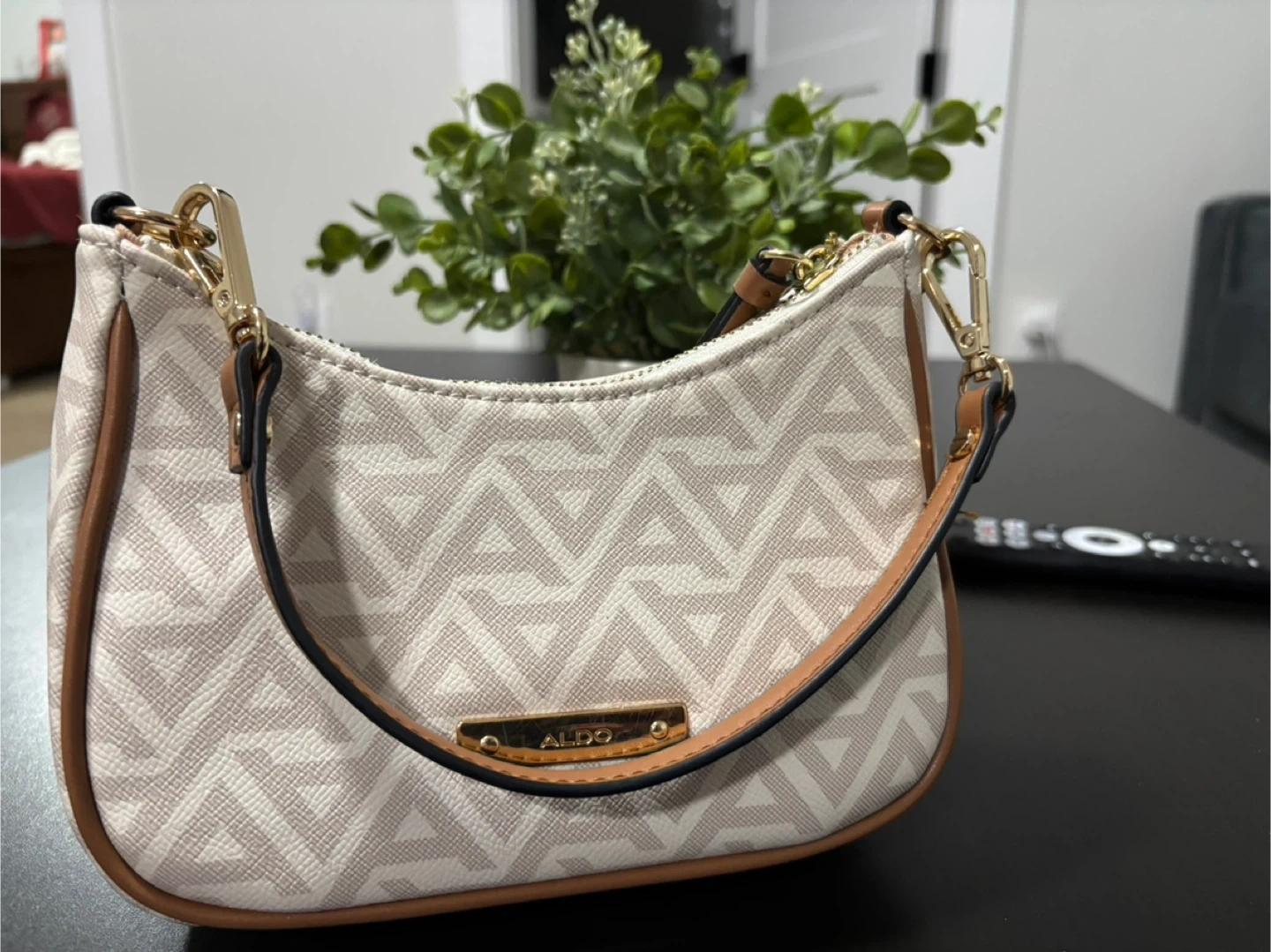 Gently used ALDO shoulder bag in great condition. Features a stylish geometric pattern and gold chain detail. Perfect for adding a touch of elegance to any outfit!