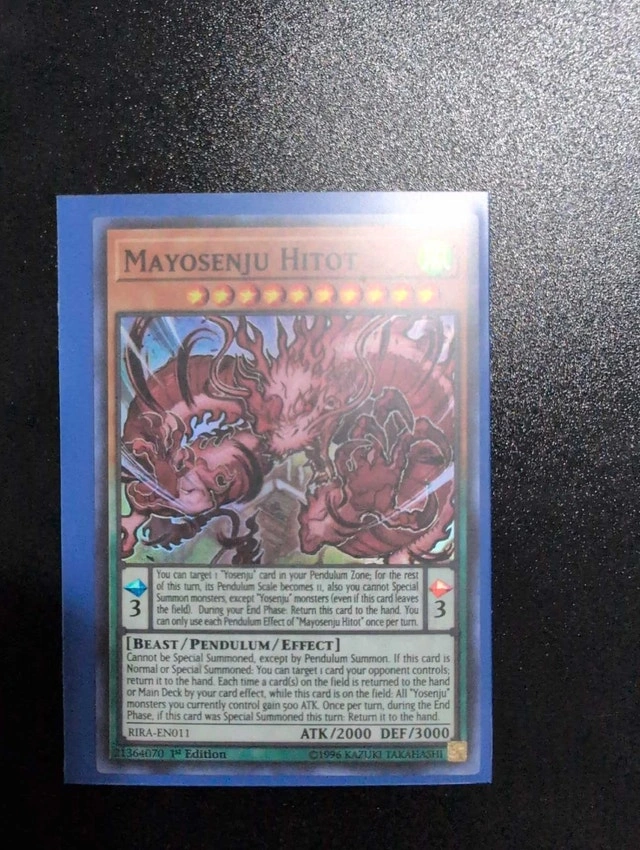 Offering a used Mayosenju Hitot Yu-Gi-Oh! card, a powerful addition to any duelist's arsenal with 2000 ATK and 3000 DEF. This card is in Mint condition. This is the super rare original Holo version from 1996. Asking $20, but I estimate the value to be around $10 CAD based on similar listings. If this ad is still up, the card is still available. Serious collectors only. Pick up only. Text or message me here.
