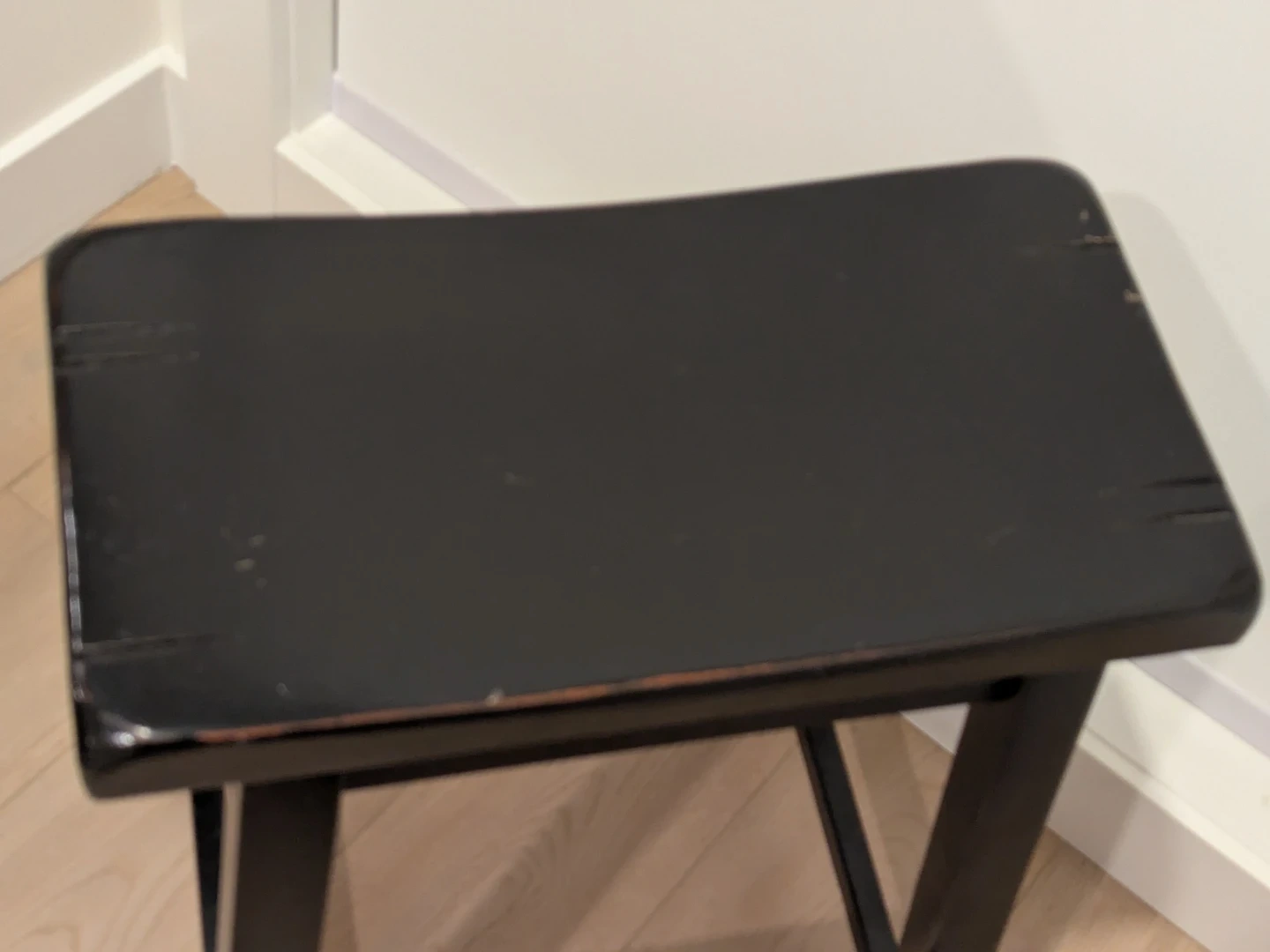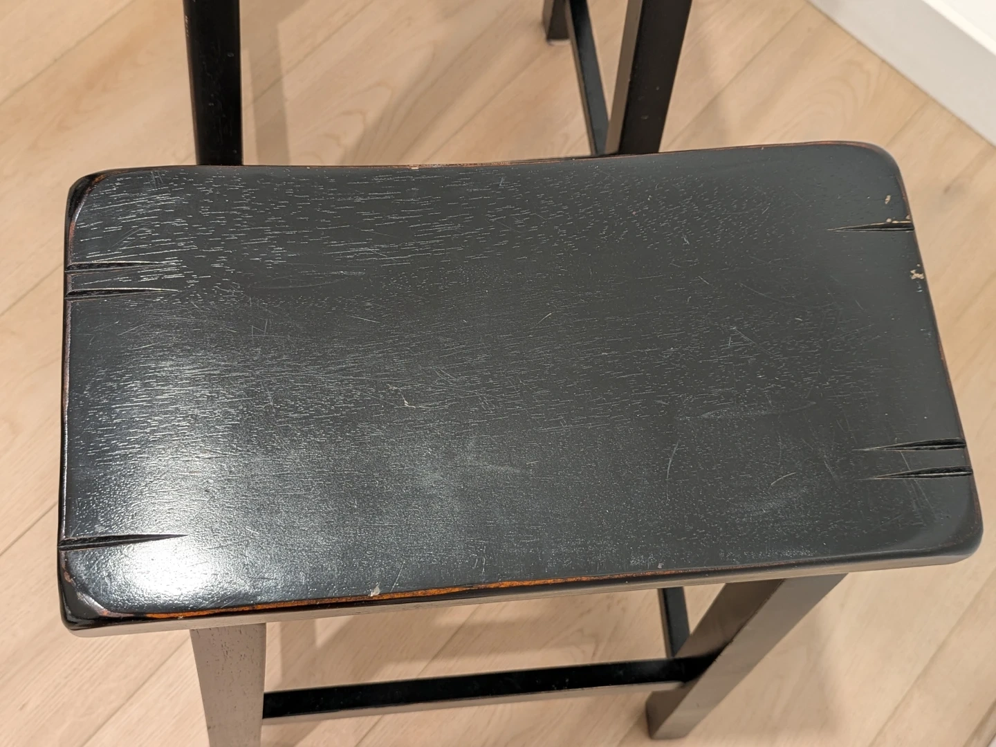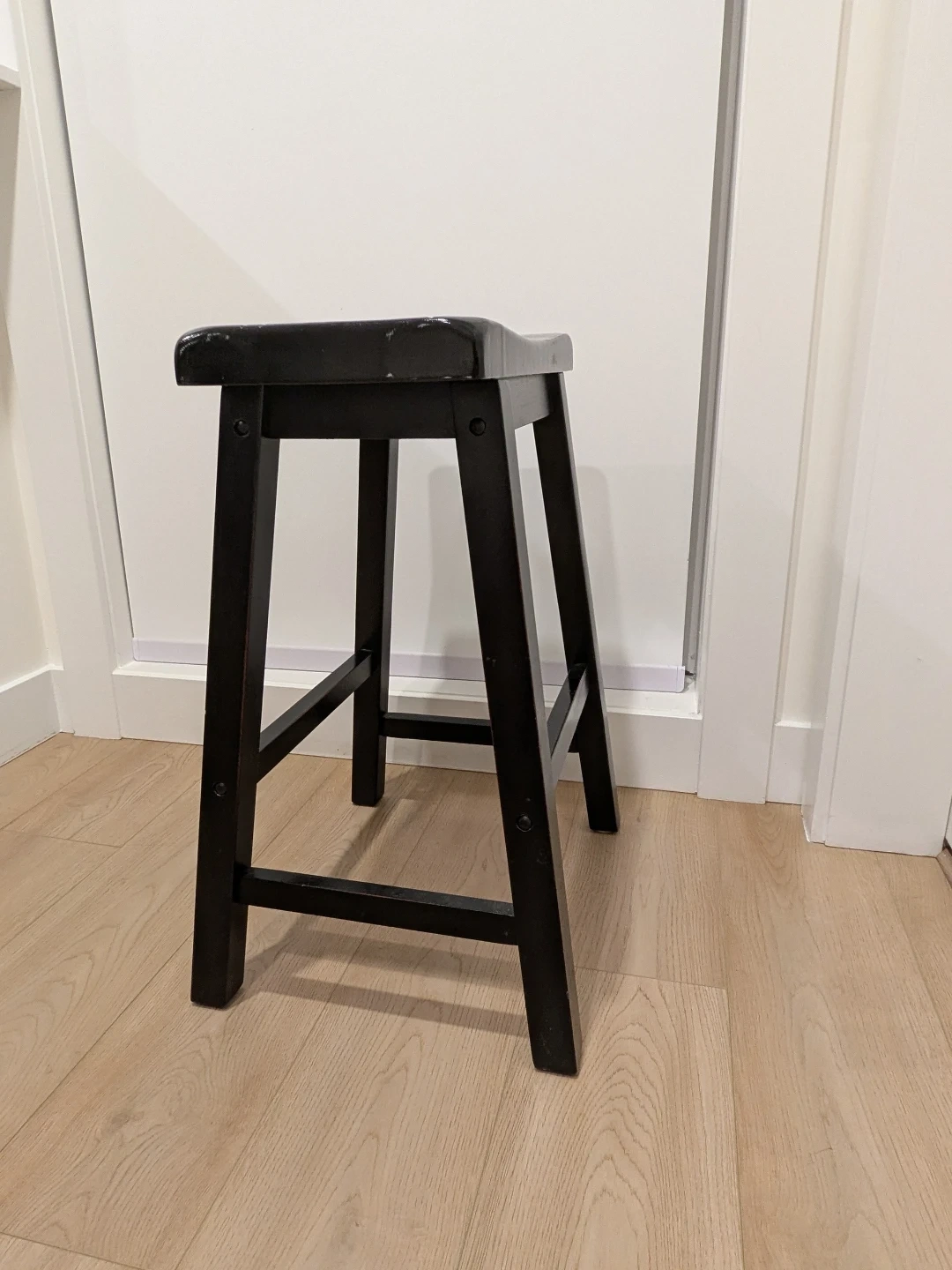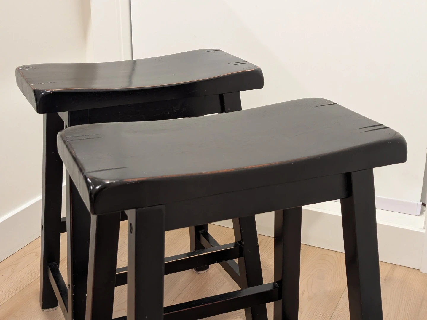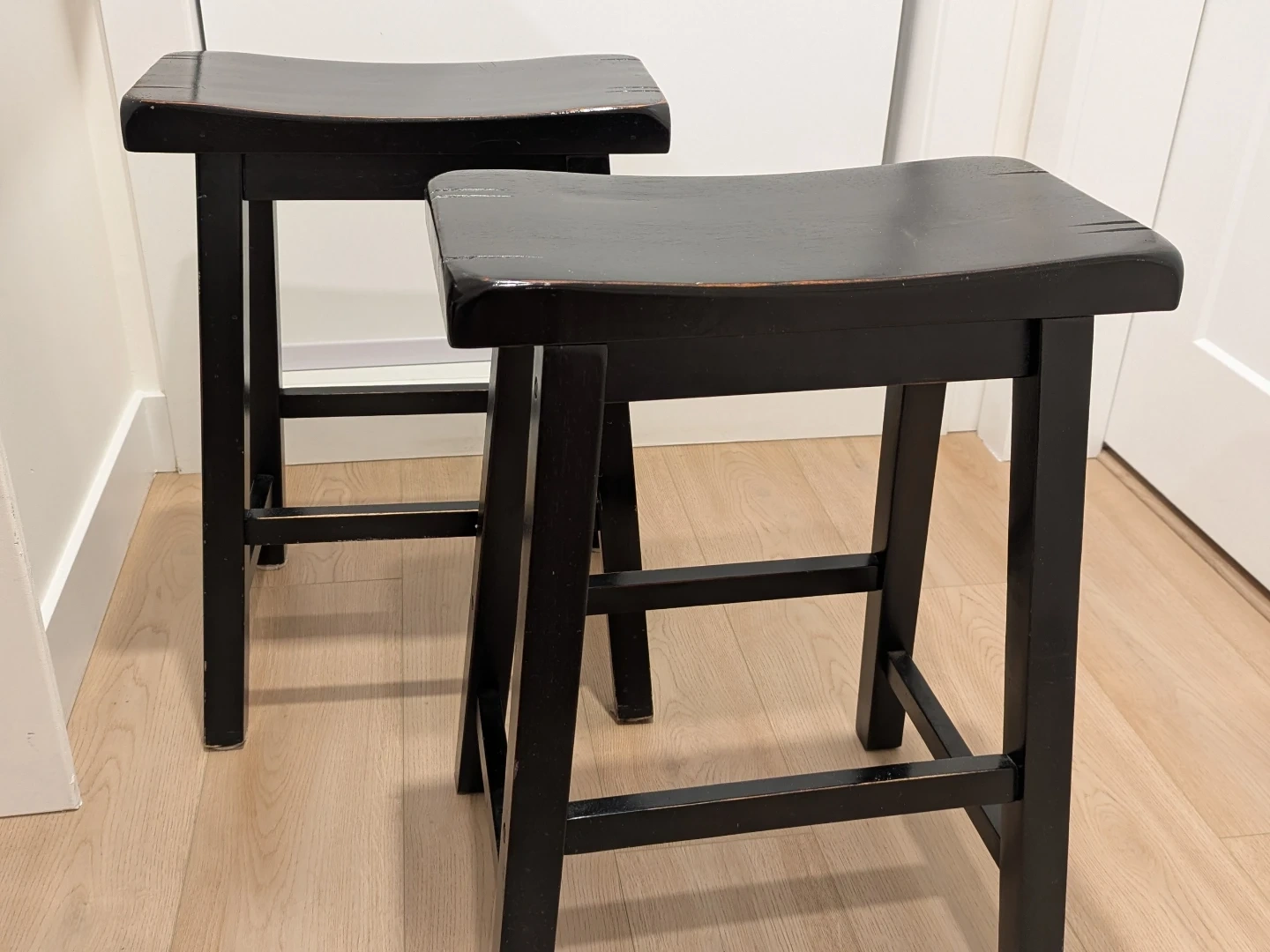 Selling a pair of black wooden bar stools. They've got a classic look and are sturdy enough for everyday use. There are some signs of wear and tear, but they're still in good condition and ready for a new home!