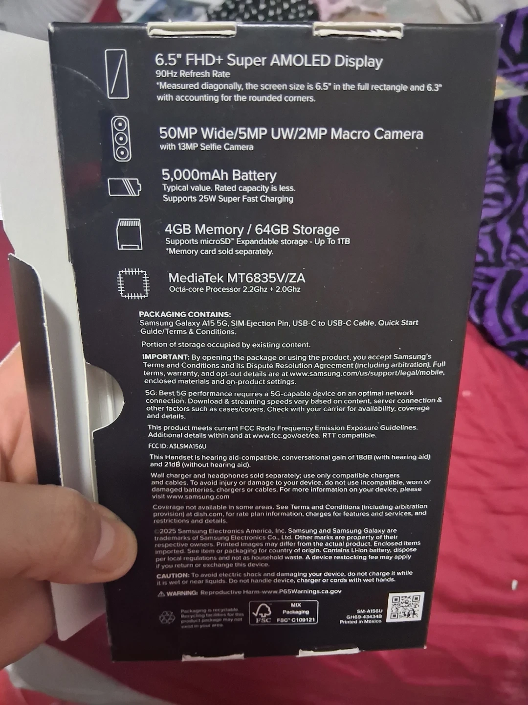 Selling a like new Samsung Galaxy A15 5G with 64GB of storage. The phone comes with its original box and SIM ejection pin as well as a charger