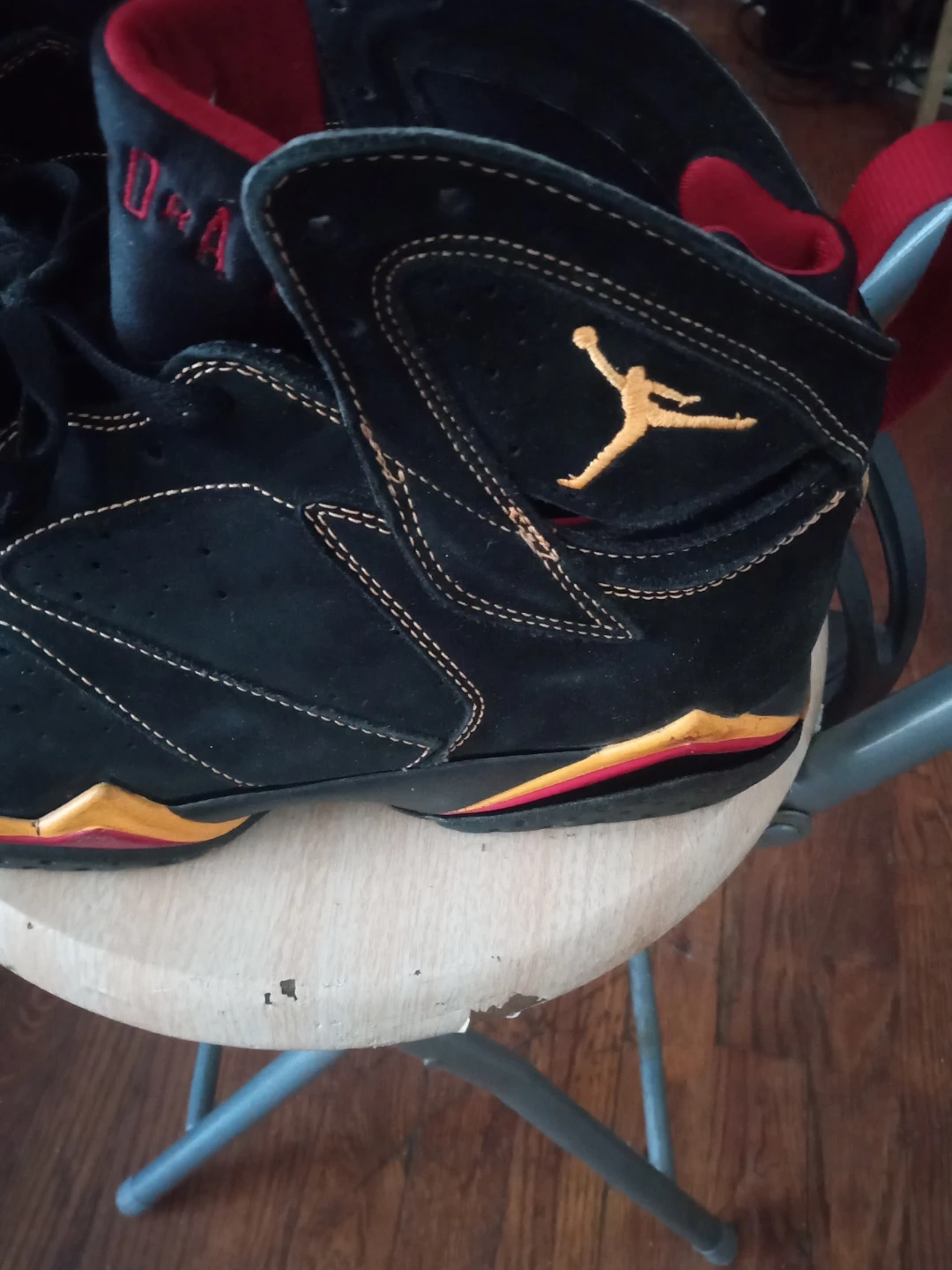 Selling a pair of Air Jordan 7 Citrus Retro sneakers.Needs to be taken to shoe repair to be reglued. They are black with red and gold accents. Overall, they are in great condition.