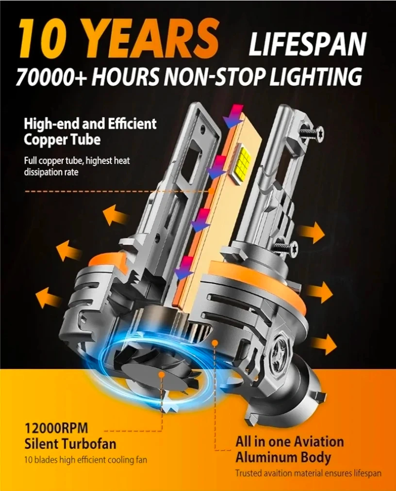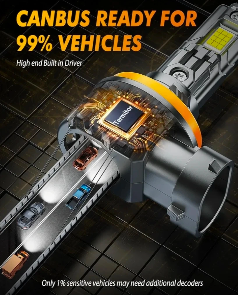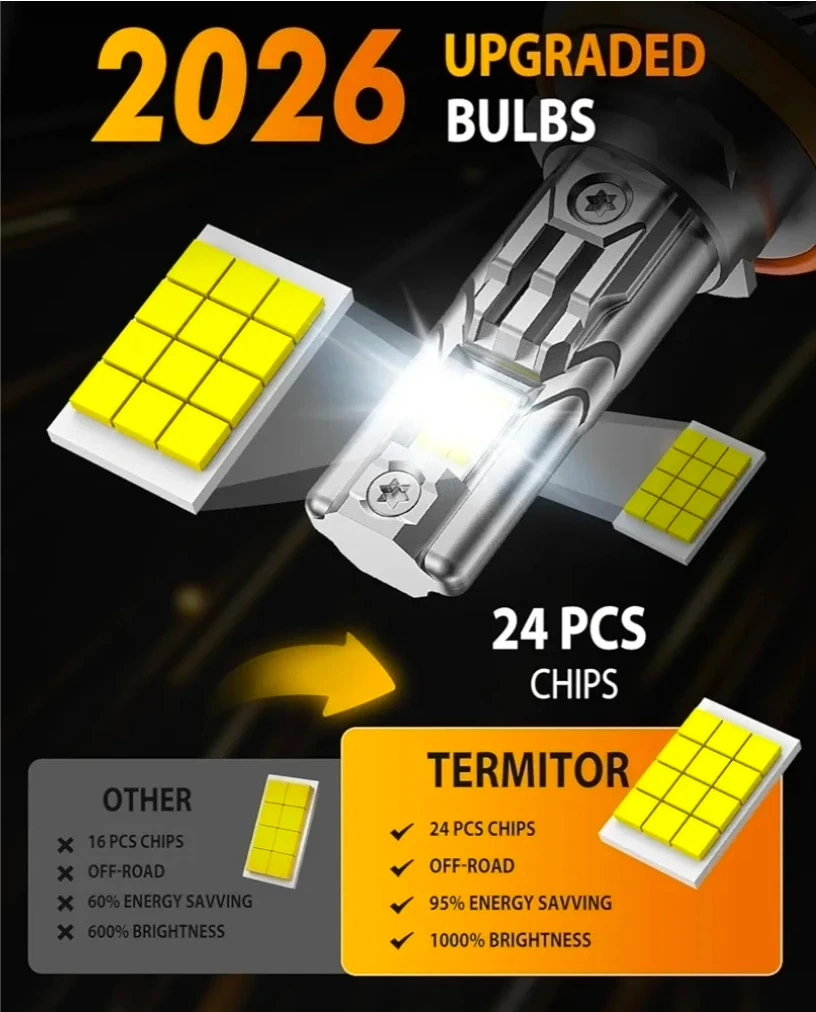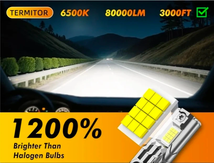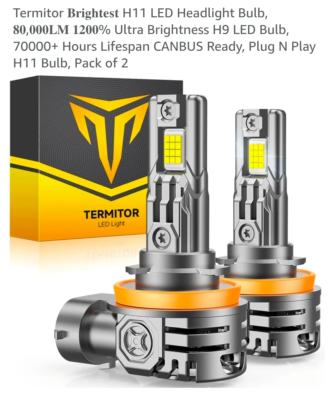 Selling a pack of two Termitor H11 LED headlight bulbs. These bulbs boast 80,000LM and 1200% ultra brightness. They're designed for easy plug-and-play installation and are CANBUS ready, with a lifespan of over 70,000 hours. The bulbs feature a silent turbofan with 12000RPM and an aviation aluminum body for efficient cooling and durability. They also offer a perfect 1:1 beam pattern compared to halogen bulbs.