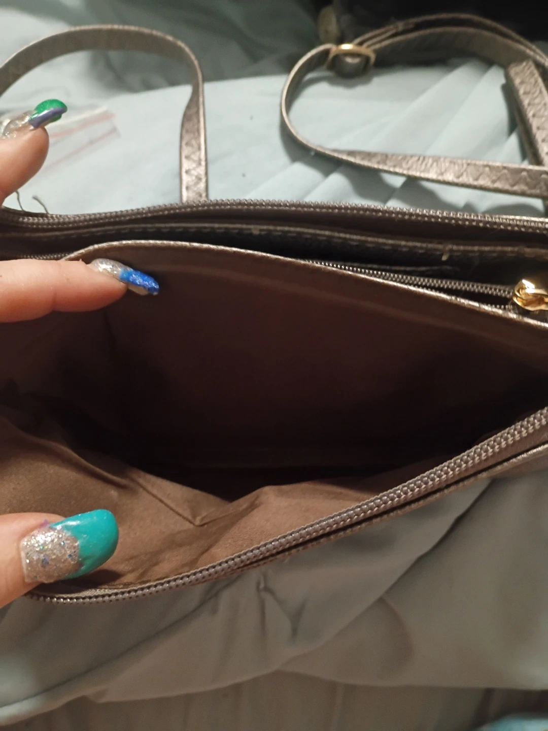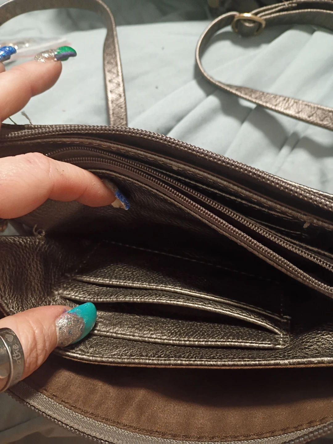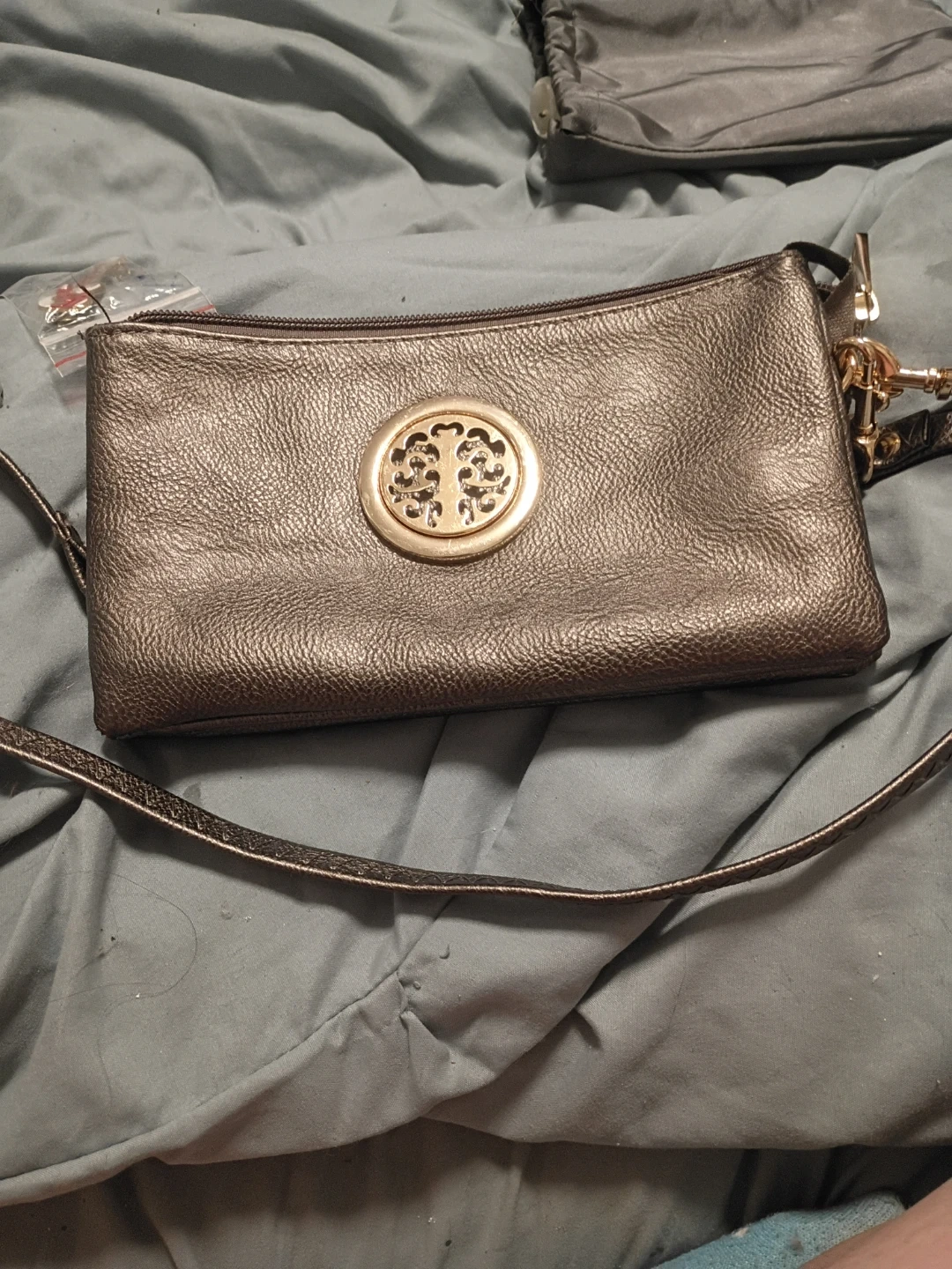 A stylish metallic crossbody bag, perfect for carrying your essentials. It features multiple compartments to keep your belongings organized. The bag is in good condition and ready for a new home