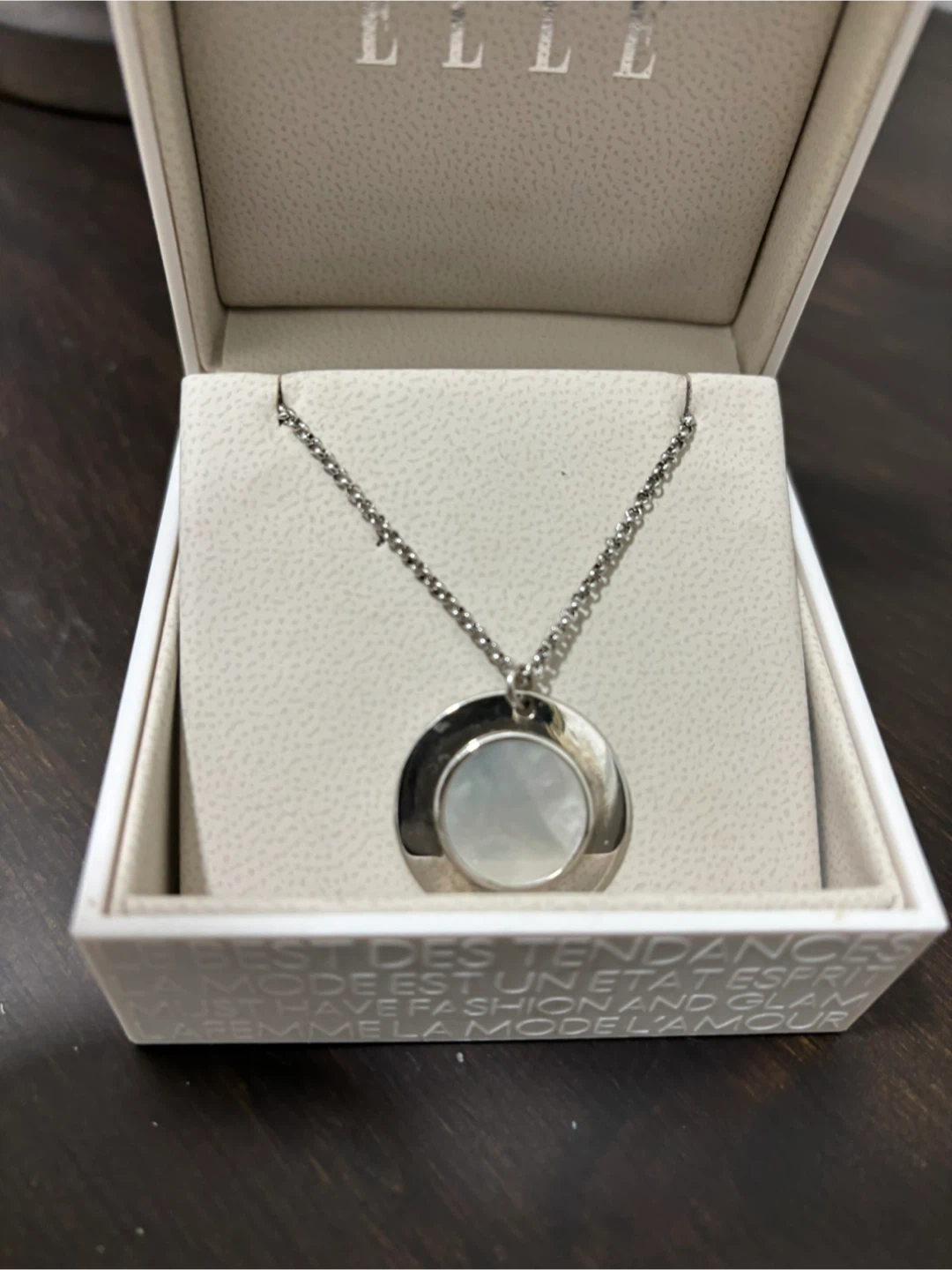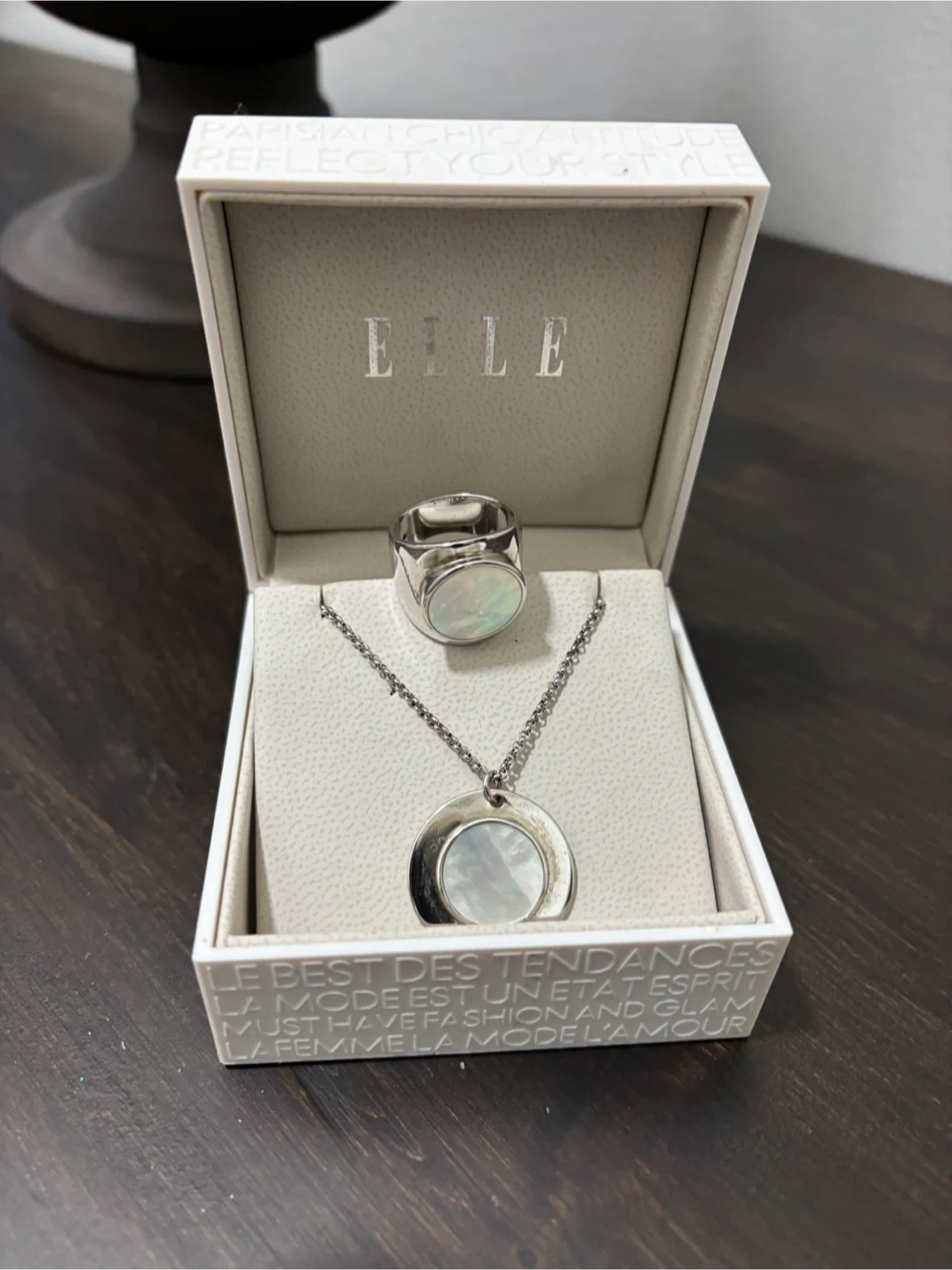Selling a lovely ELLE necklace and ring set in silver. The set comes in its original box, making it perfect for gifting or treating yourself! The design features a chic, modern look with a round pendant and matching ring. A stylish addition to any jewellery collection