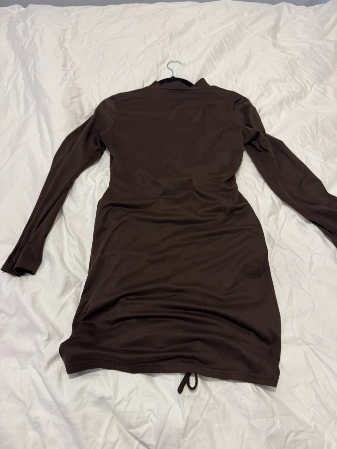 Here's a stylish brown long-sleeve ruched dress! The ruching detail adds a flattering touch to the silhouette. It's perfect for dressing up or down, depending on the occasion. Great for a night out or a casual gathering!