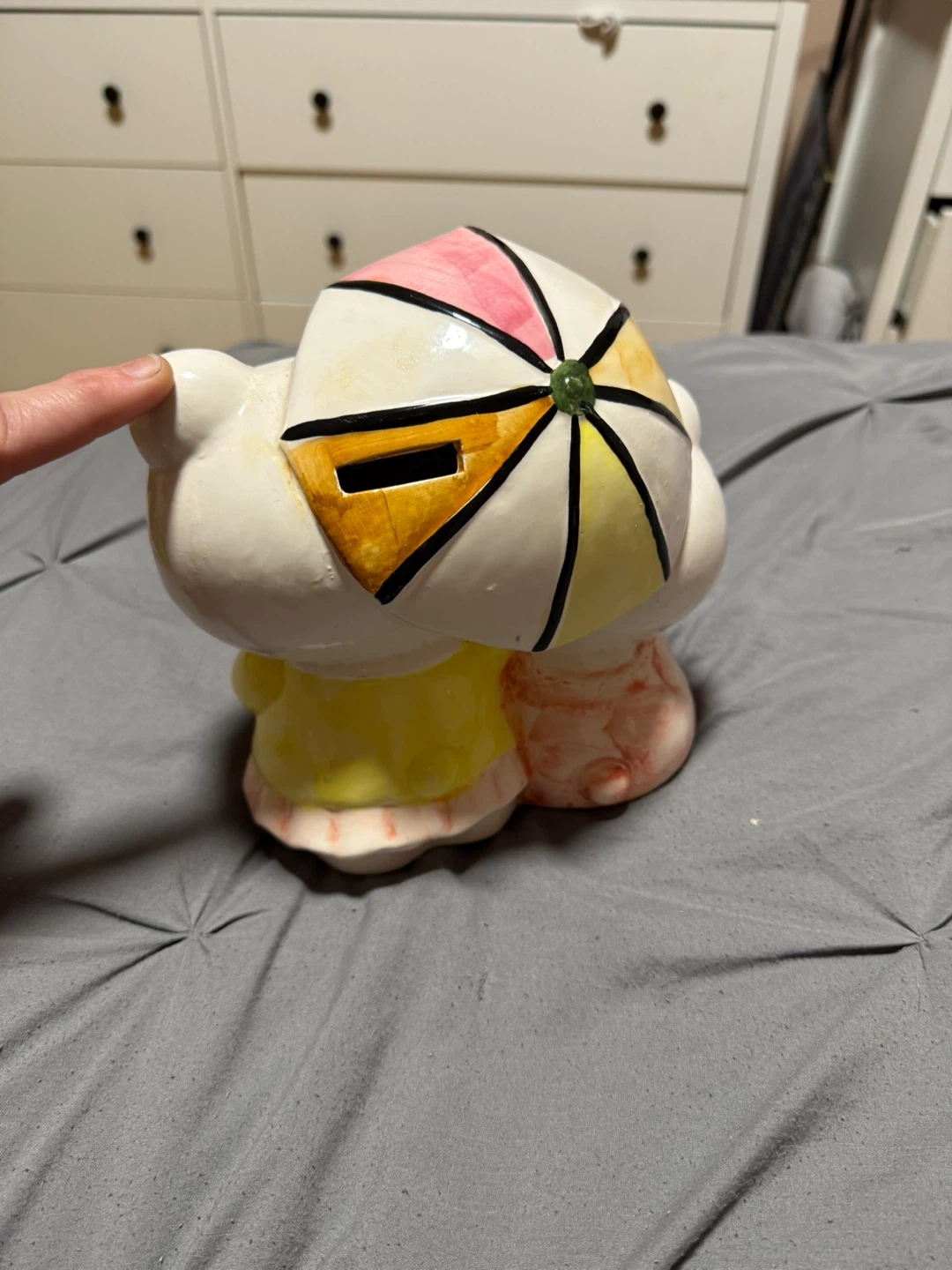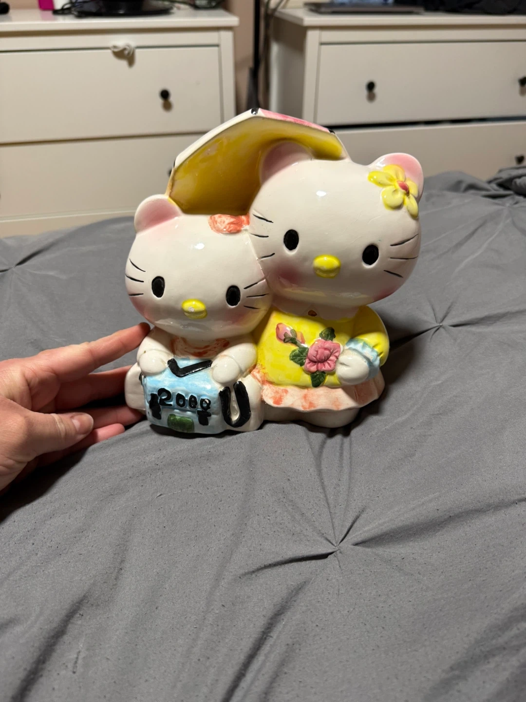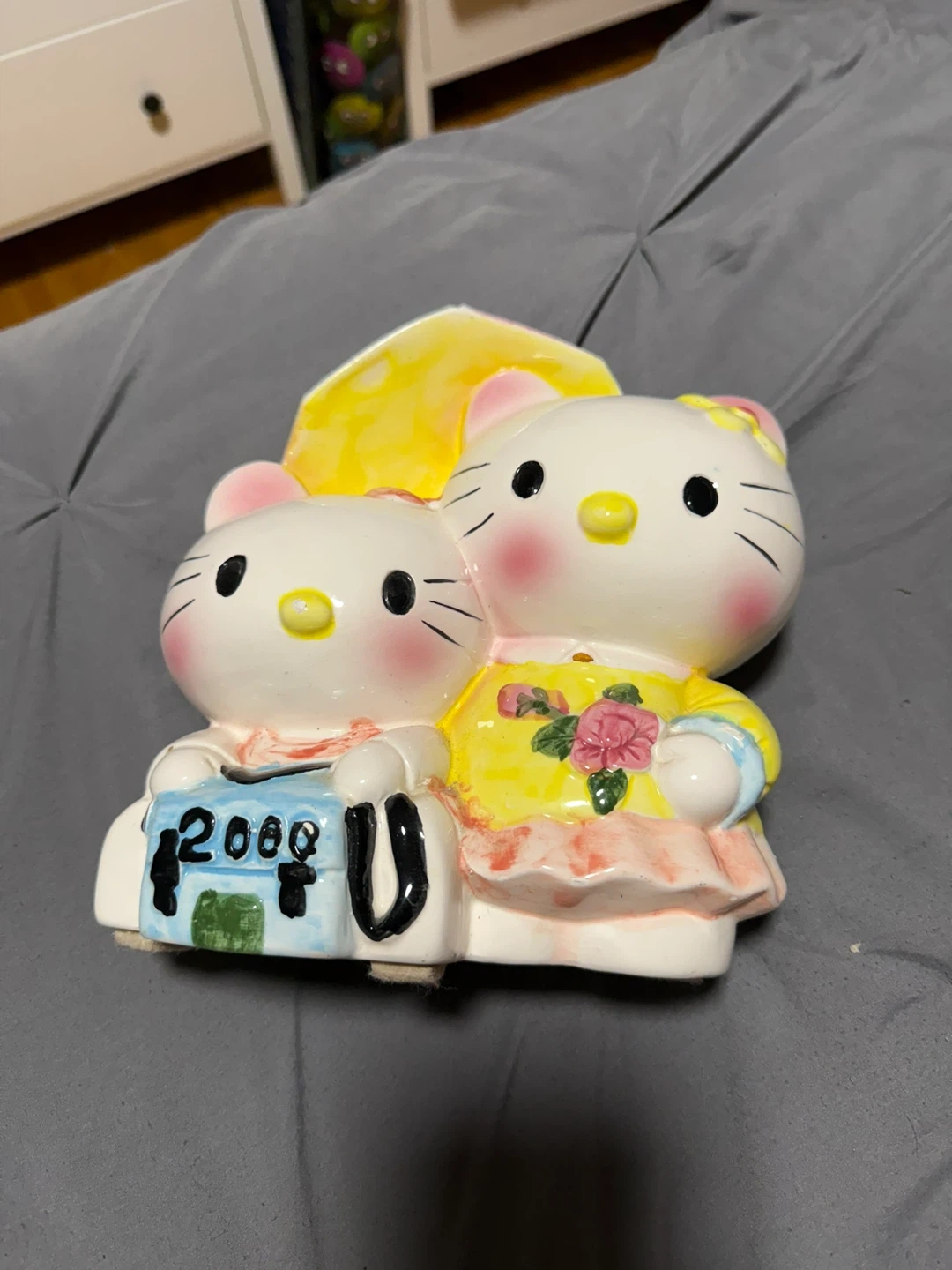 This is a cute Hello Kitty ceramic coin bank! It features two Hello Kitty figures under an umbrella. Great for kids or collectors!