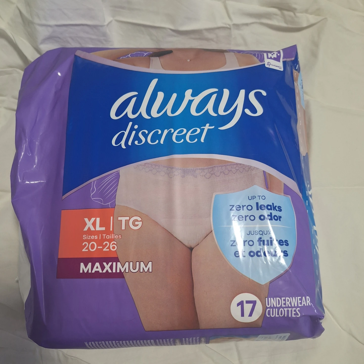 Selling a new pack of Always Discreet underwear. This is a size XL, fitting sizes 20-26. The pack contains 17 underwear culottes. Provides up to zero leaks and zero odor. Perfect for maximum protection!