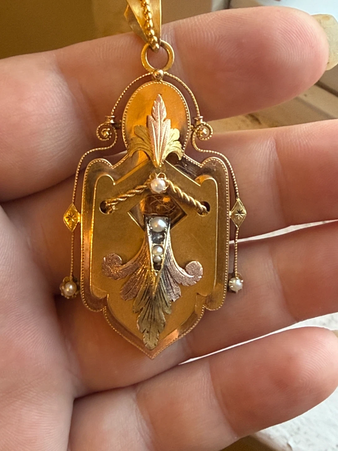 Beautiful Victorian 14KT yellow and rose gold hand assembled custom made locket pendant. The pendant features a floral design and has dimensions of approximately 53.50 x 30.00mm.