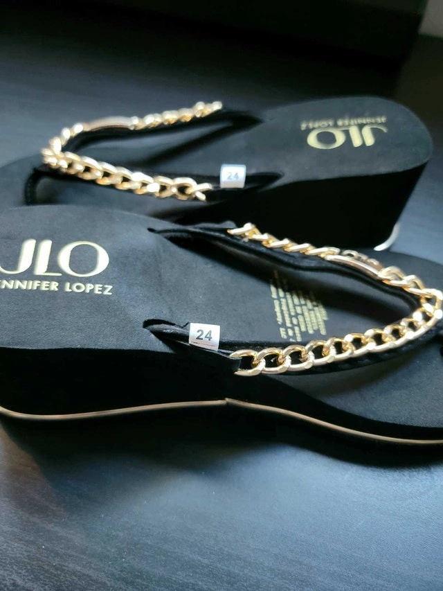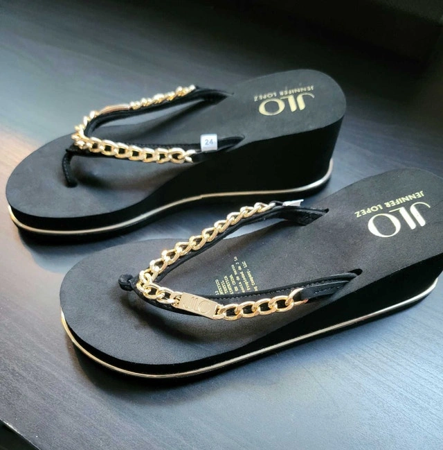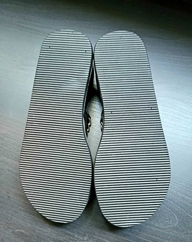 Brand new stylish black platform wedge flip flops with a chic gold chain detail. Perfect for casual wear. Size 7.5 - 8. Pickup in Bridgeland area. Cashless payment or cash accepted.