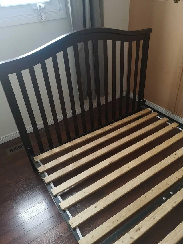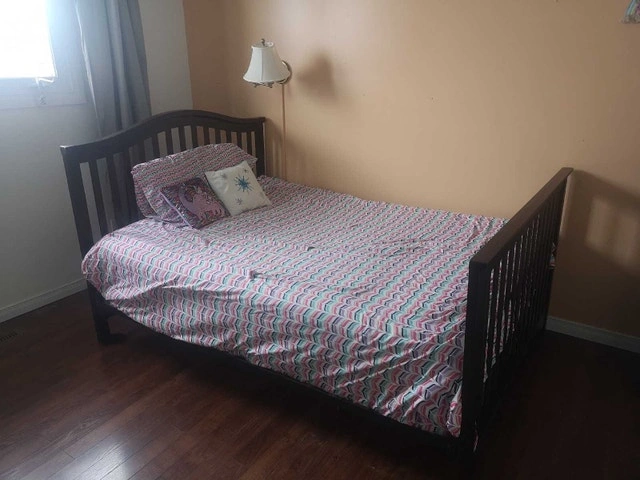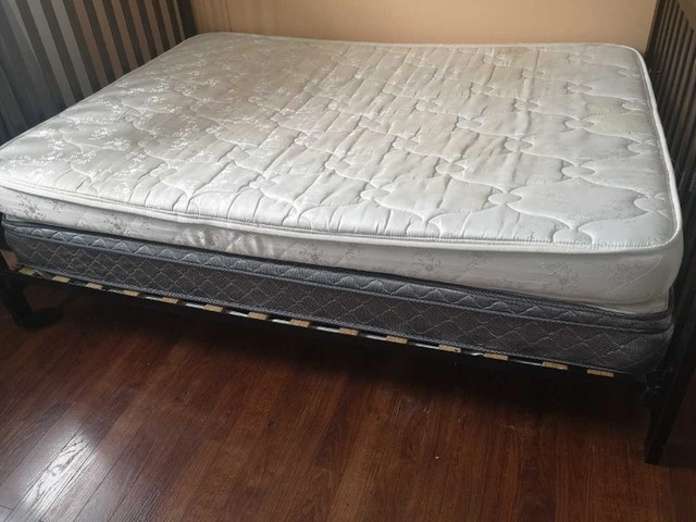 Used double bed frame, perfect for a guest room or a starter bed. It's sturdy and in good condition with a dark brown finish. Two mattresses are also available for free if interested. Priced to go!