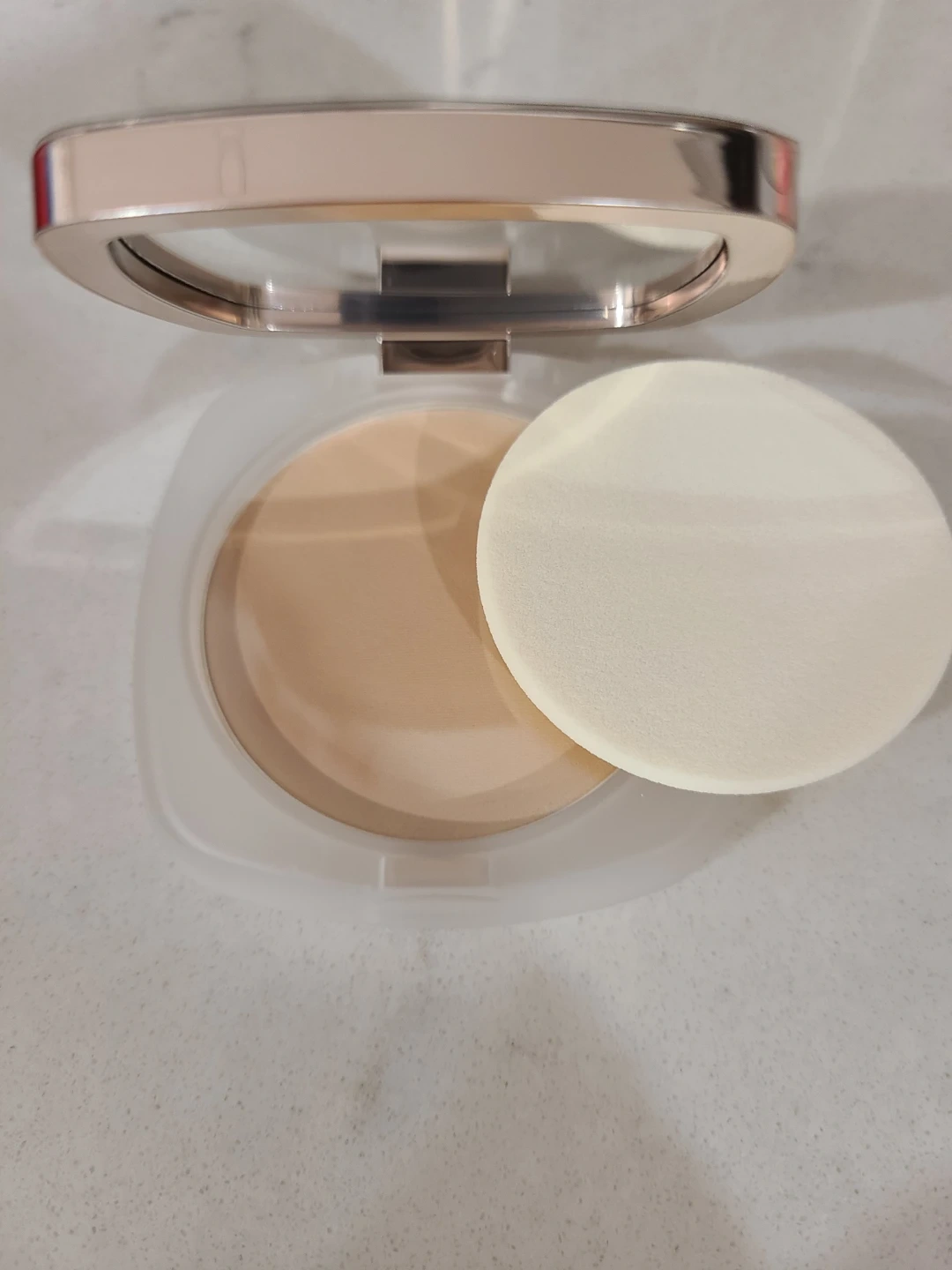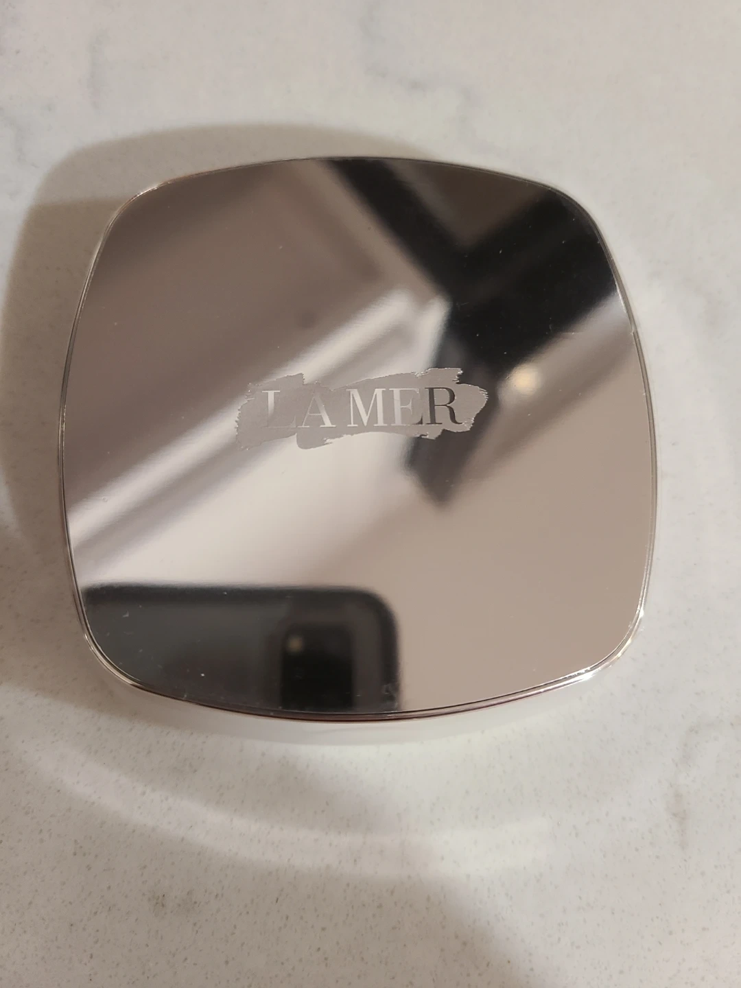La Mer The Sheer Pressed Powder in Light 12. It comes with the original sponge applicator. The powder is a light shade and provides a sheer finish.