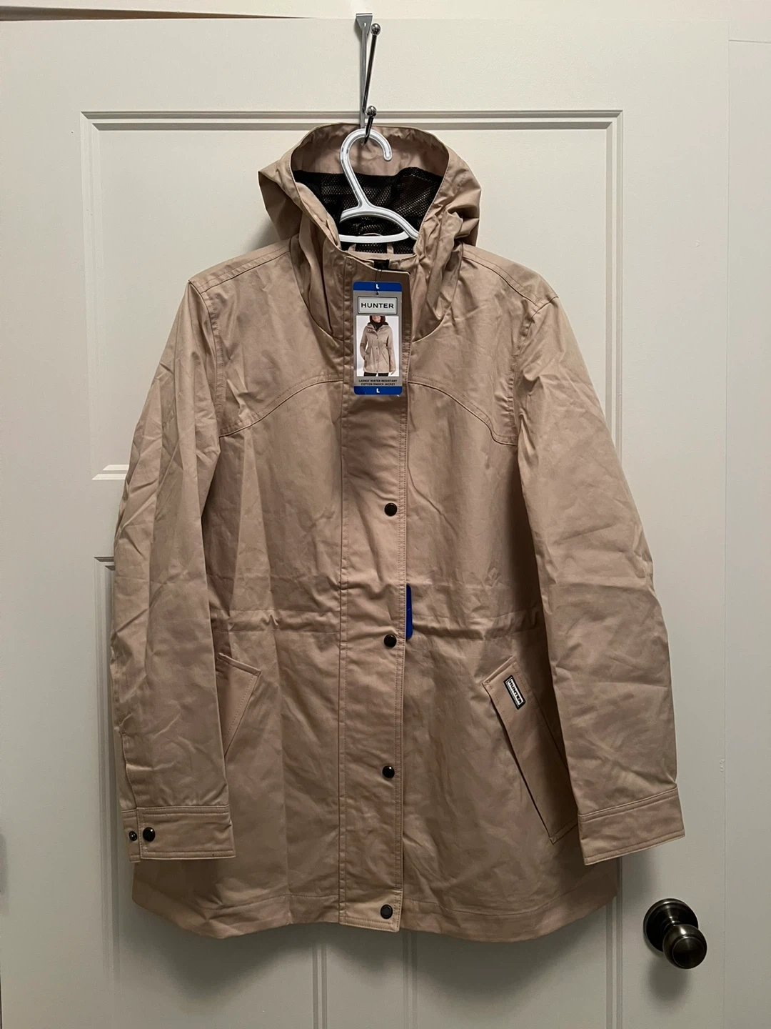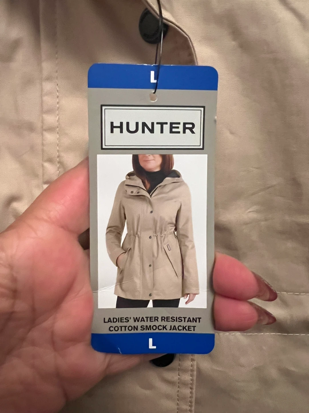 Selling a Hunter Ladies' Water Resistant Cotton Smock Jacket in size Large! This stylish jacket is perfect for those rainy days. It's in great condition and ready for a new home