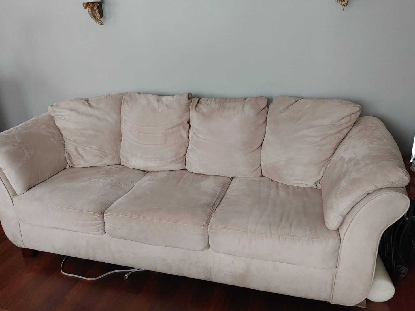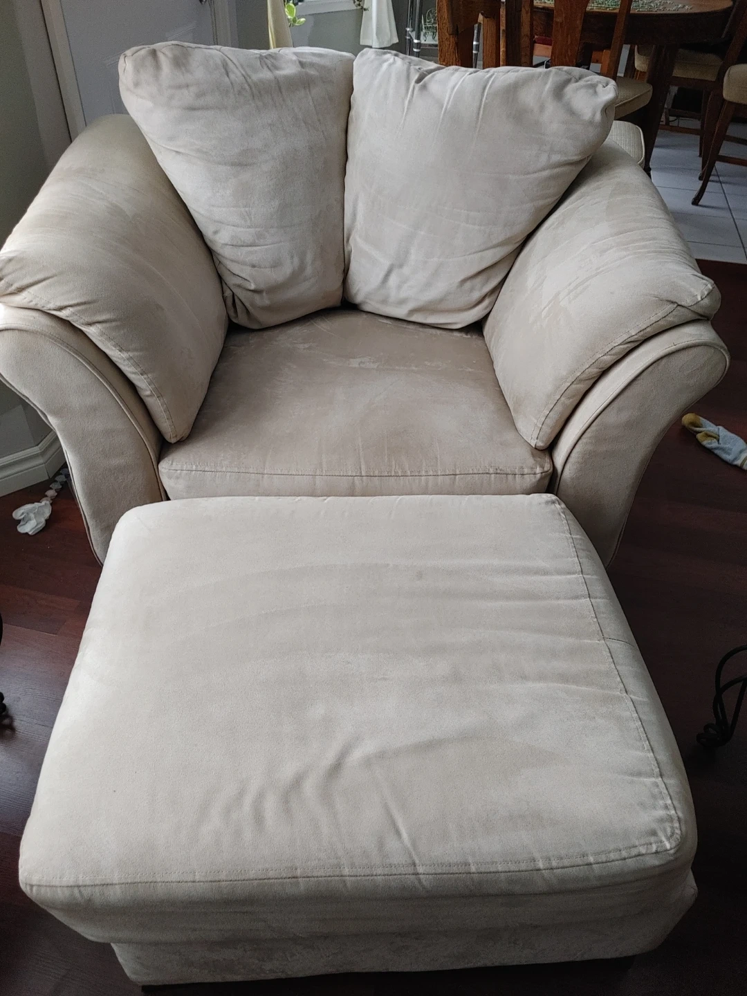 Selling a very clean comfy beige sofa, armchair, and ottoman set. Perfect for a living room or family room. The cushions are soft and comfortable. It's in excellent condition and ready for a new home!
