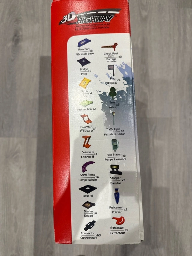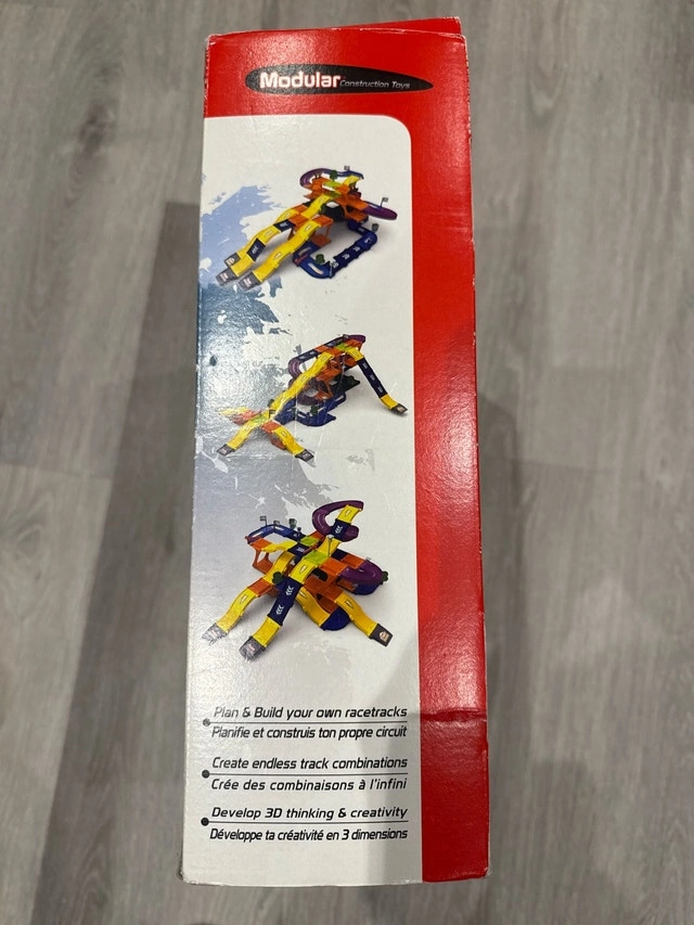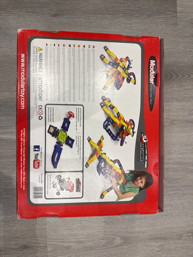 Unleash your child's inner engineer with this Modular 3D Highway construction toy! Featuring 72 pieces, this set allows for over 1,000,000 track combinations. It is in used condition with some wear and tear on the box but is otherwise in great condition. * 72 Construction Pieces * Create Endless Track Combinations * Develop 3D Thinking & Creativity