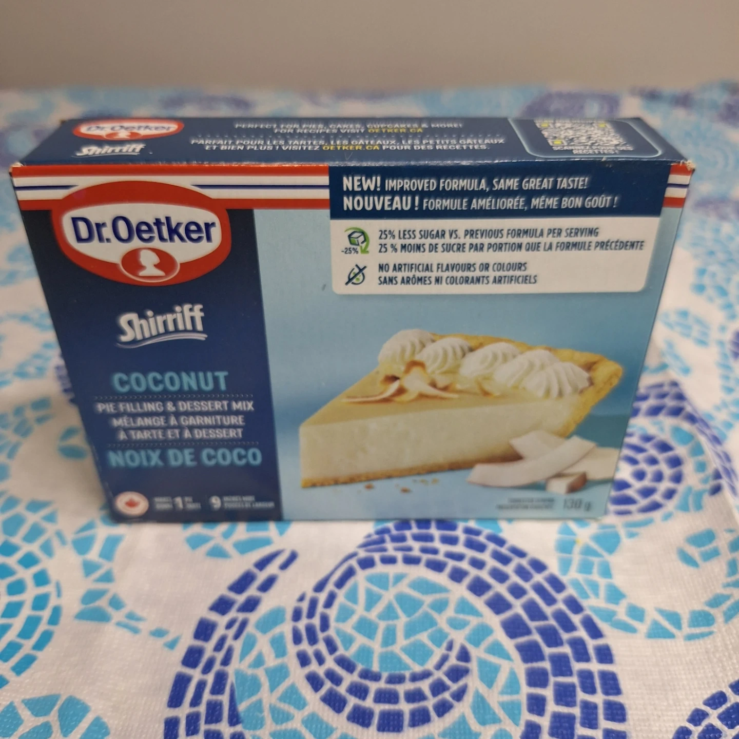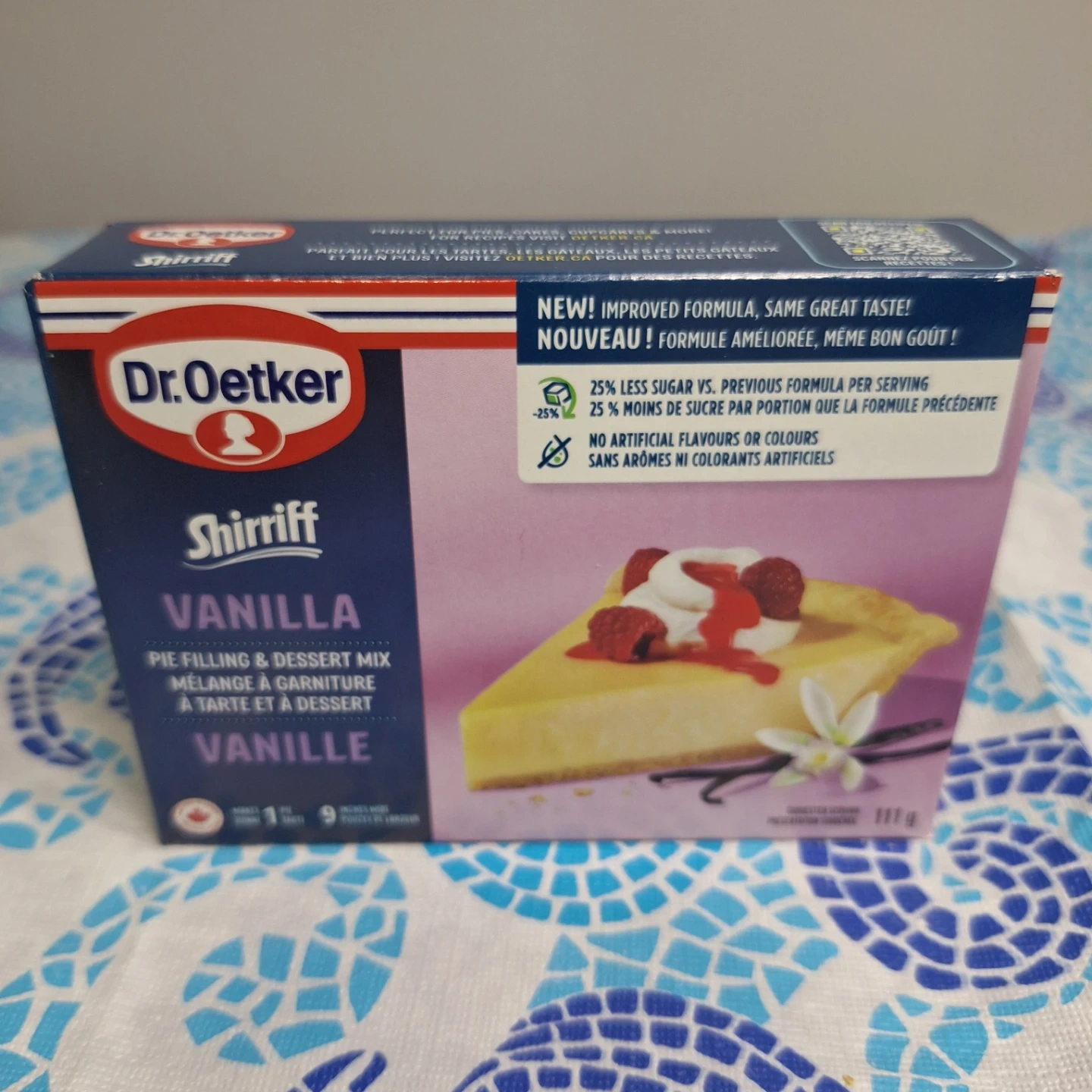 Selling Dr. Oetker Shirriff Vanilla Pie Filling & Dessert Mix. It's perfect for pies, cakes, cupcakes and more! The best before date is 2026 June 03. It has a new and improved formula with the same great taste! It also has 25% less sugar vs the previous formula per serving, and has no artificial flavours or colours