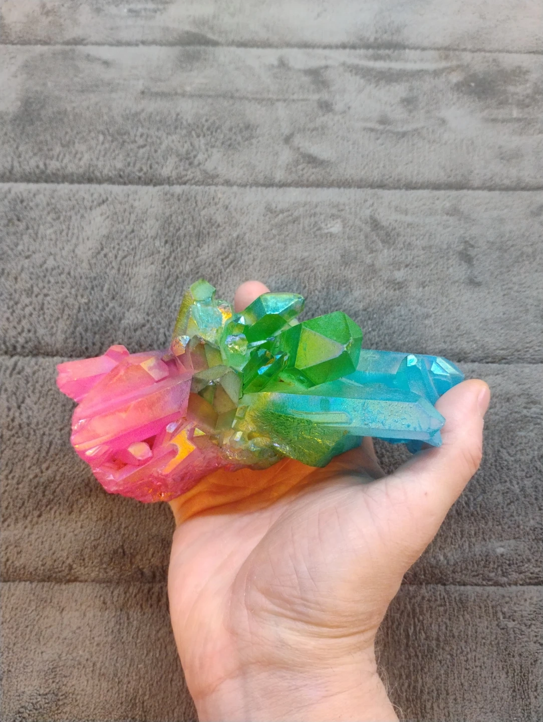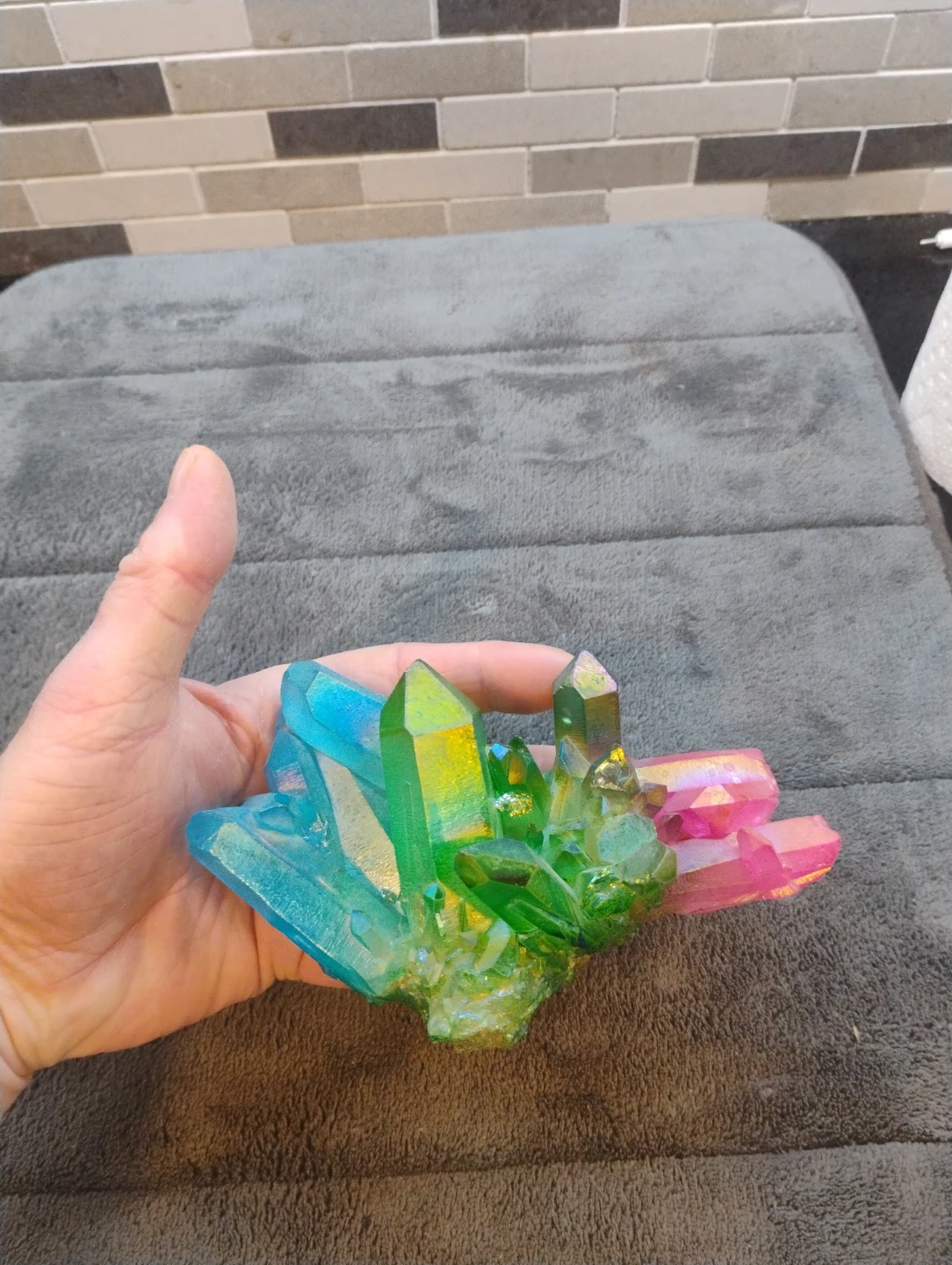 Selling a beautiful aura quartz crystal cluster with vibrant colours! It features a mix of blue, green, and pink hues that shimmer in the light. This piece would make a great addition to any crystal collection or as a unique decorative item for your home