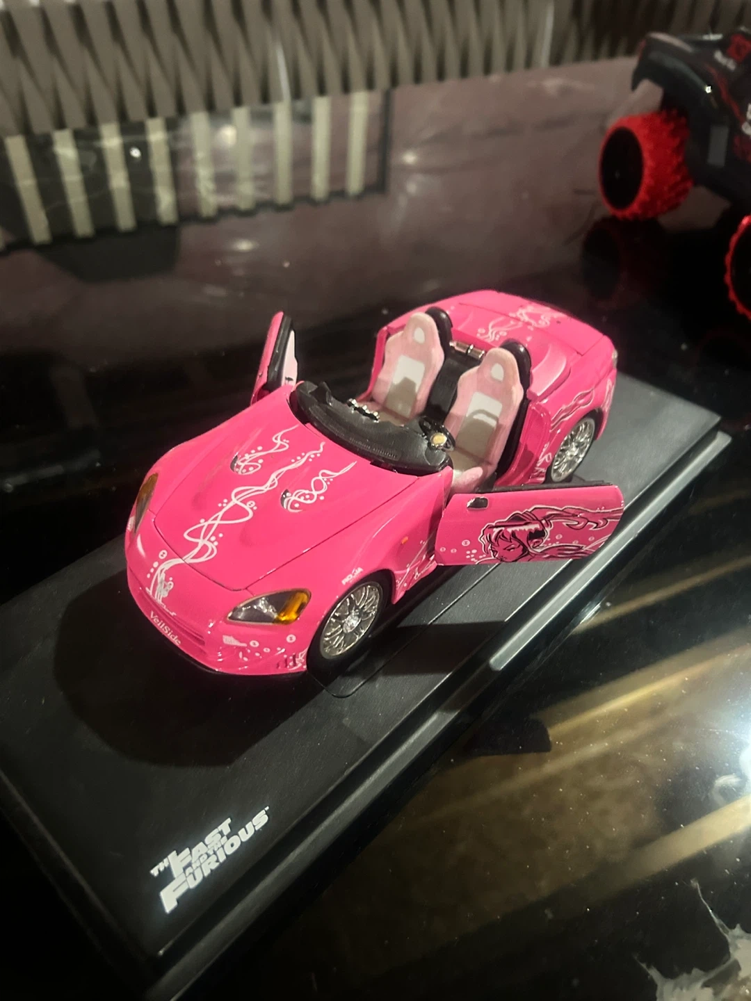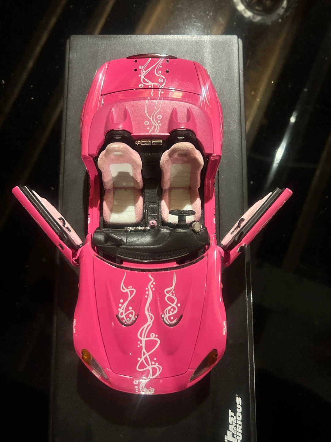Selling a diecast car from The Fast and the Furious movie franchise. It's a pink convertible with white interior and decorative designs on the exterior. Great for collectors or fans of the series!