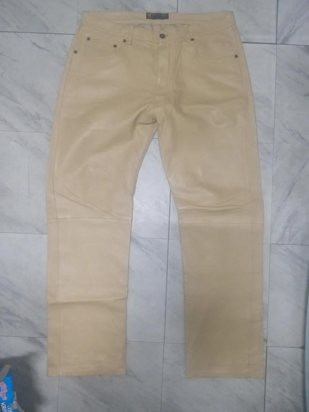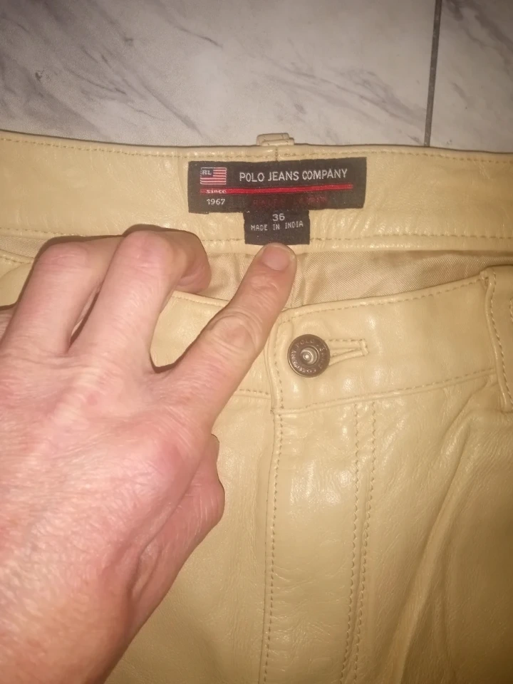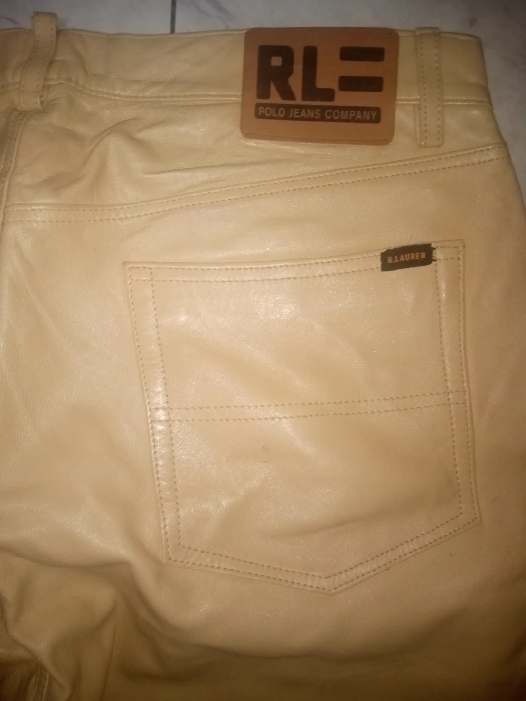 Selling a pair of Rare Polo Jeans Company leather pants in a light cream color. They are a size 36 and appear to be in good condition! The pants feature the RL logo on the back pocket.