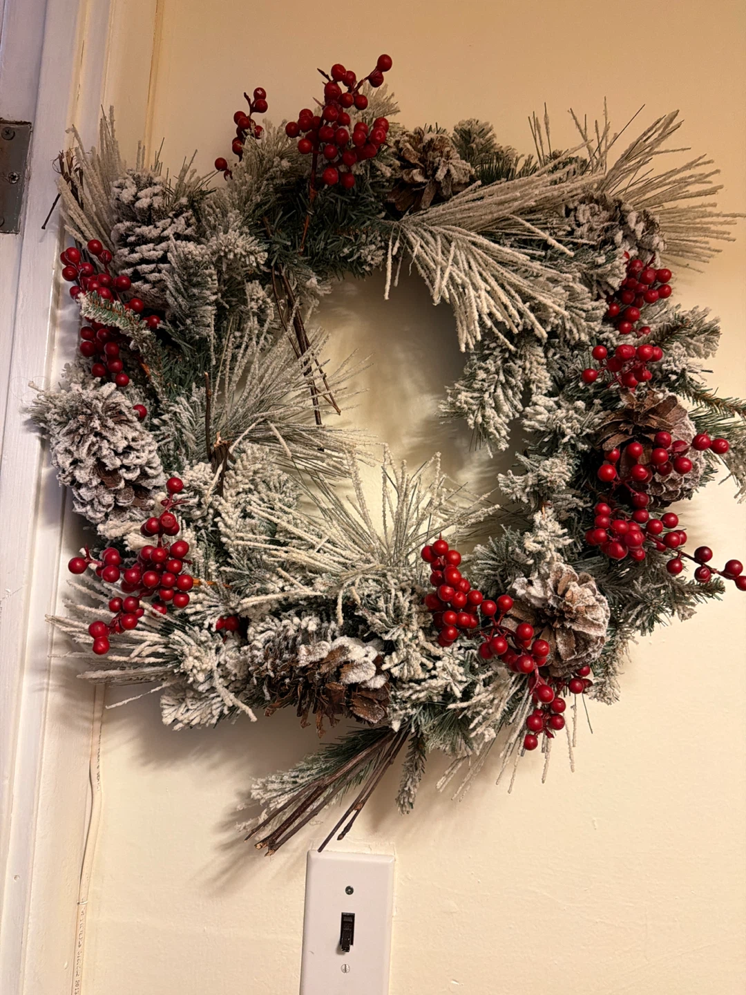 Here's a festive Christmas wreath ready to brighten up your home for the holidays! It features beautiful pine cones and bright red berries, all dusted with a touch of snow for that winter wonderland feel