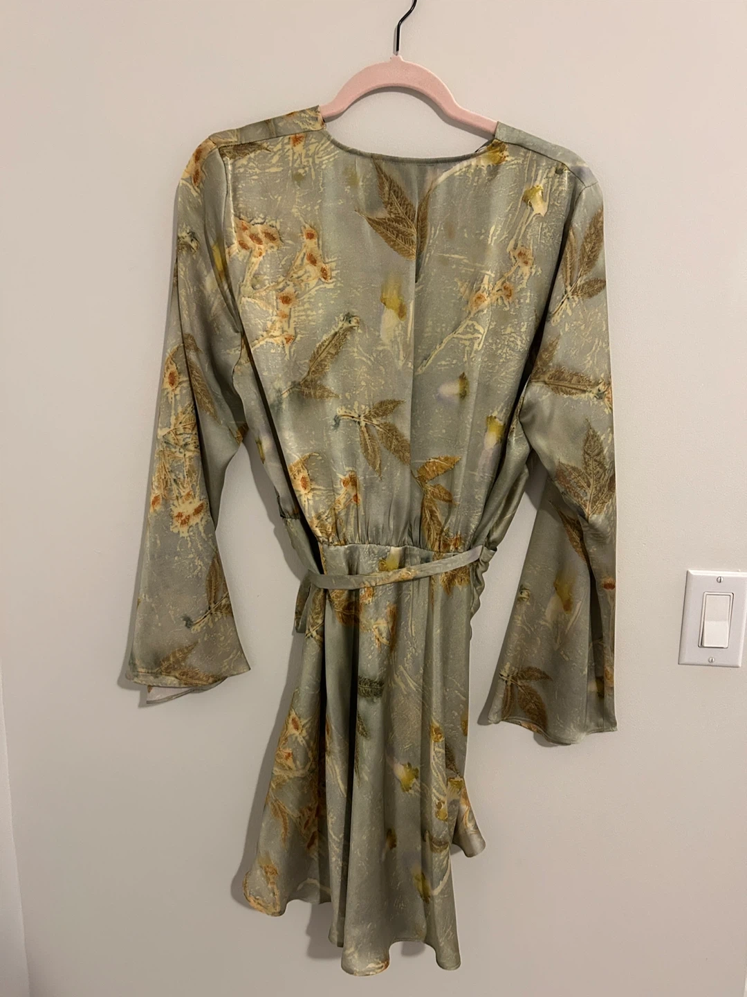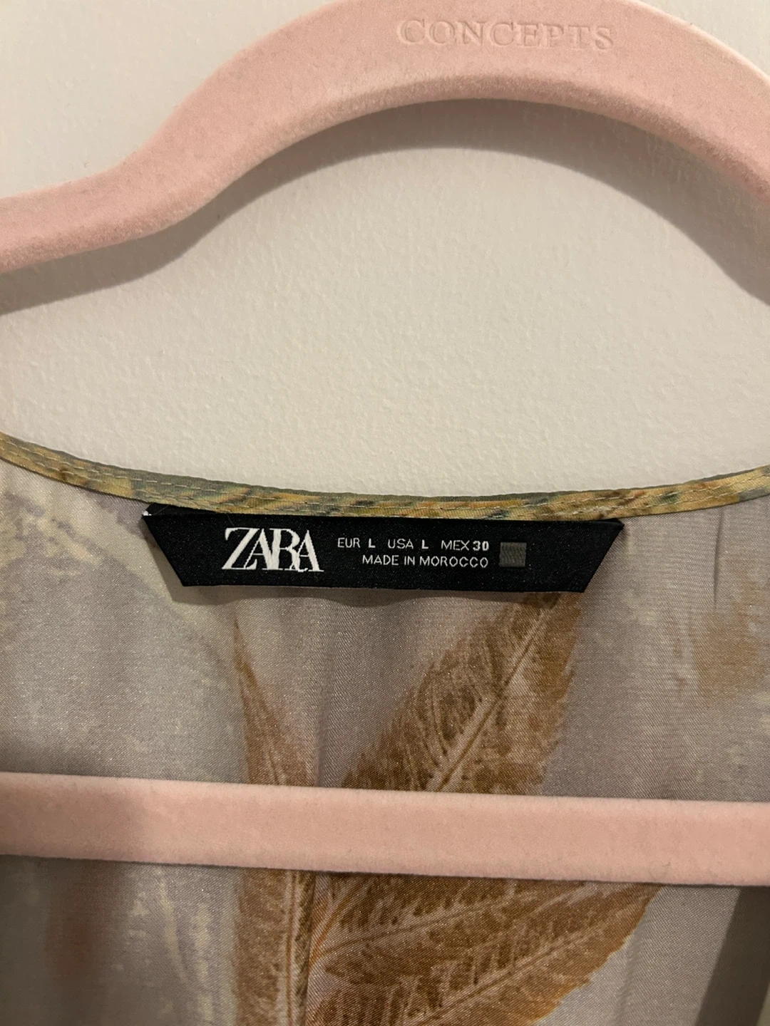 Selling a lovely Zara wrap dress with a unique floral print. It features long sleeves and a flattering wrap design. The dress is a size Large and is made. Perfect for a special occasion or a stylish everyday look!