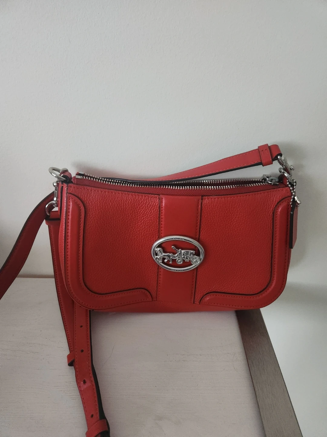 Check out this stylish Coach shoulder bag! It's a vibrant red colour and made of genuine leather. Perfect for adding a pop of colour to any outfit!
