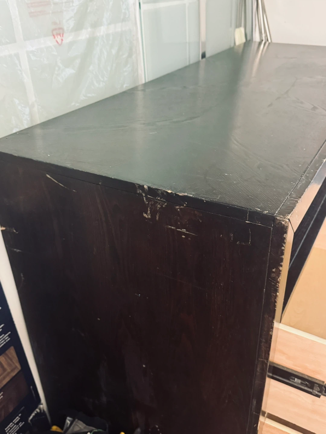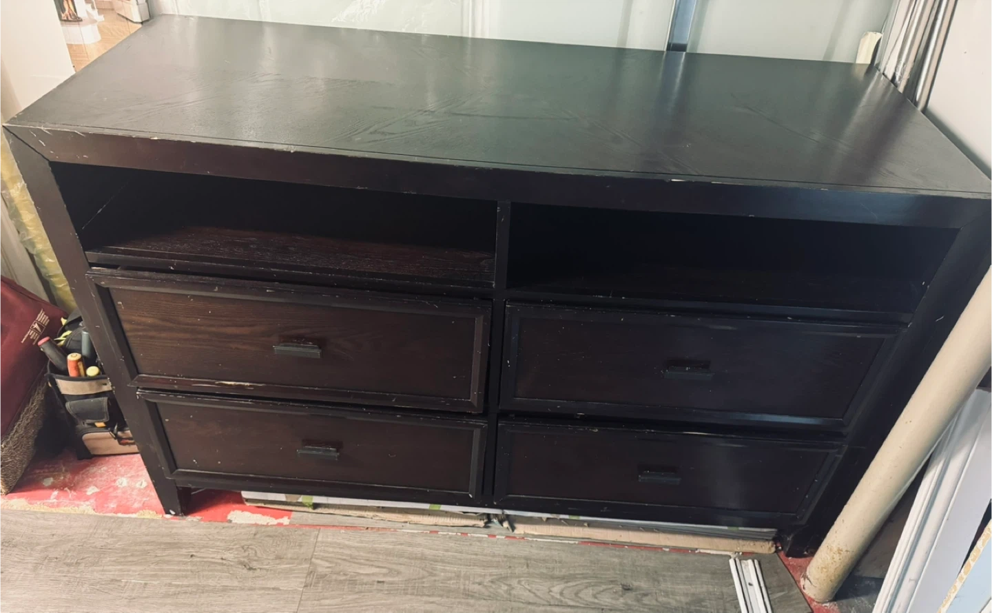 Selling a dark brown TV stand featuring 4 drawers and shelving.