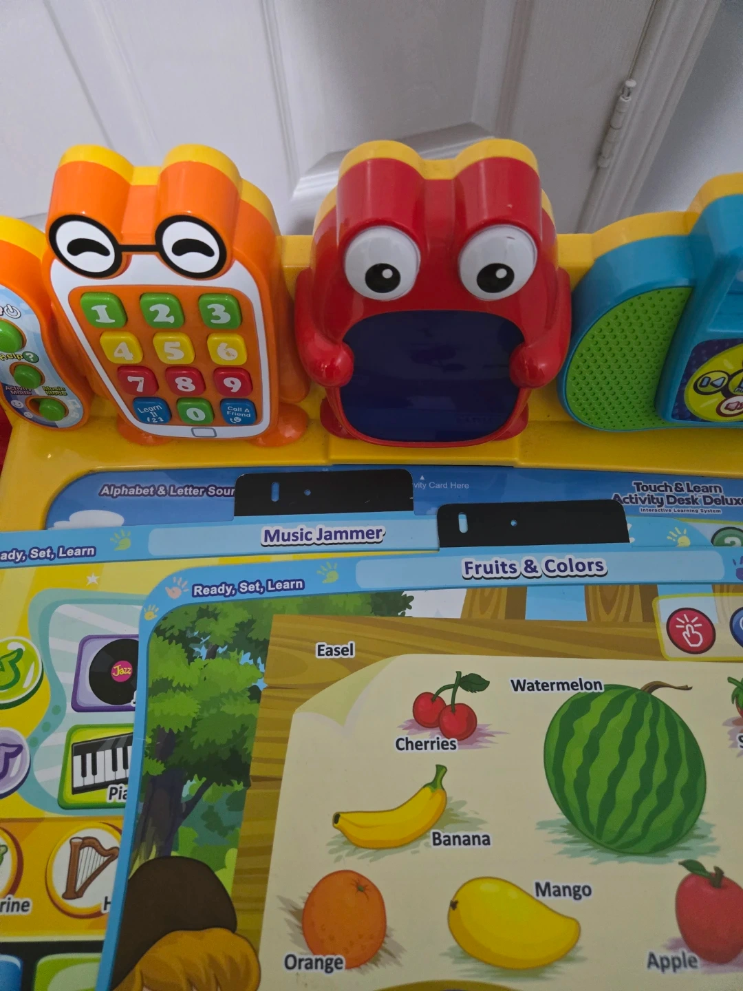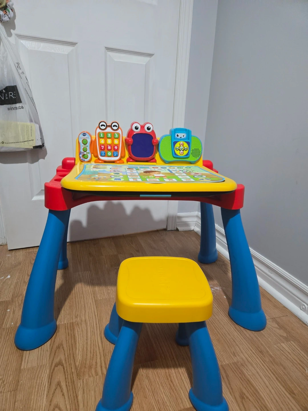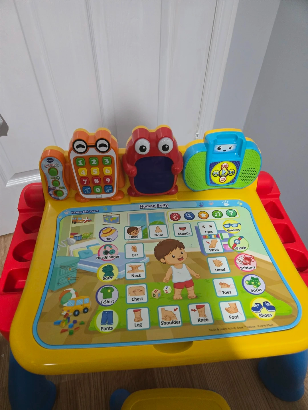 The VTech Touch & Learn Activity Desk Deluxe is perfect for little ones! It's got interactive learning cards that teach numbers, counting, the human body, music, fruits, and colours. It also includes a little stool for comfortable play. Hours of educational fun!