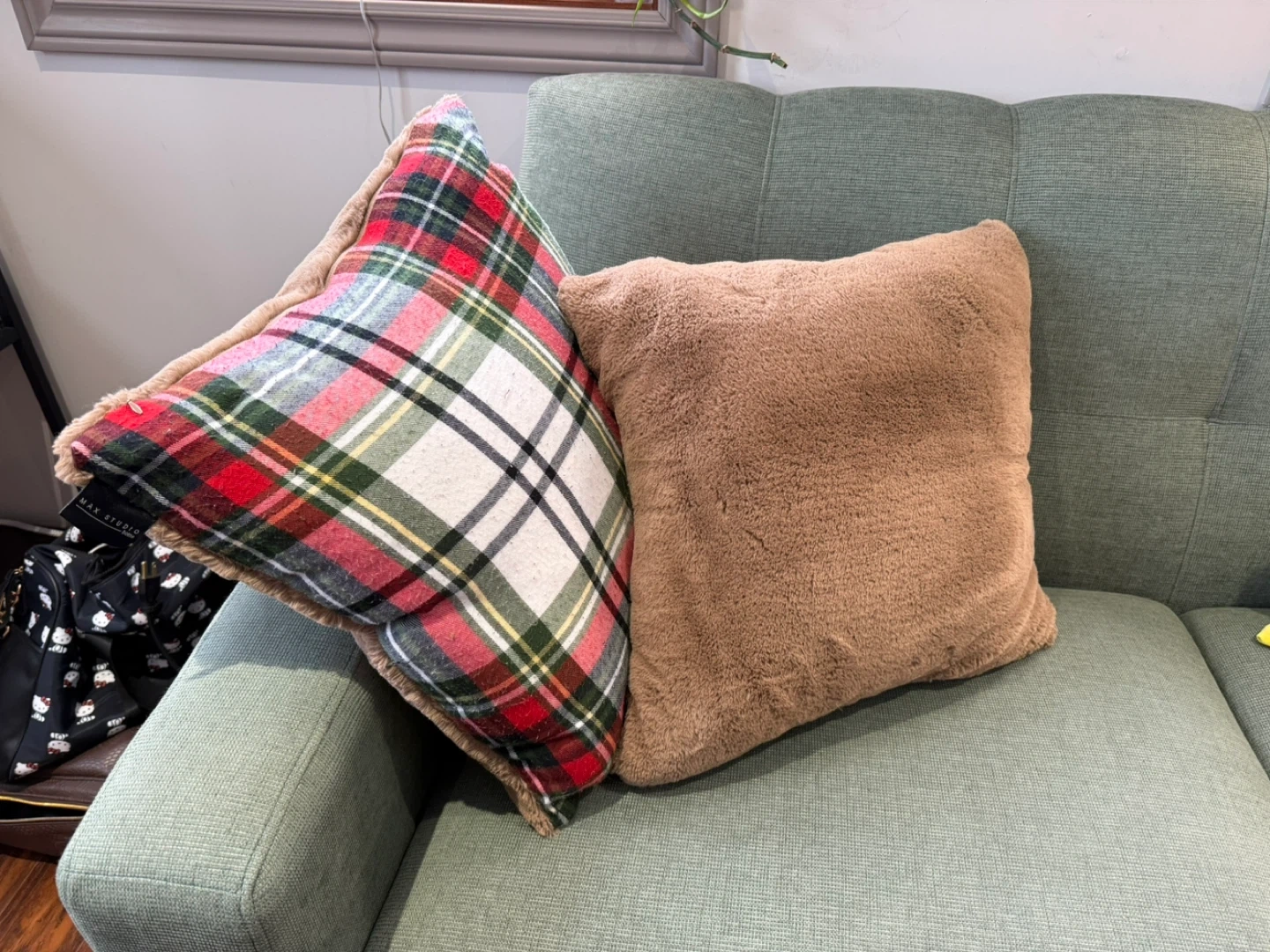 Two decorative throw pillows for sale! cozy brown, and the other side is a stylish plaid. Both are in great condition and would look lovely on a couch or bed. The brand is Max Studio