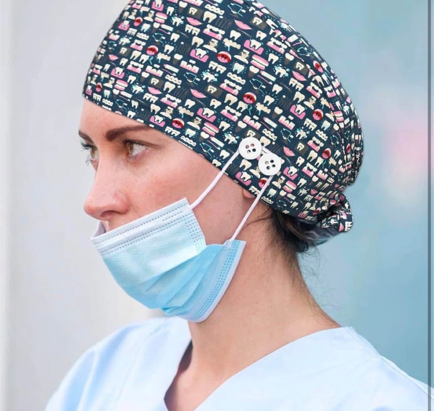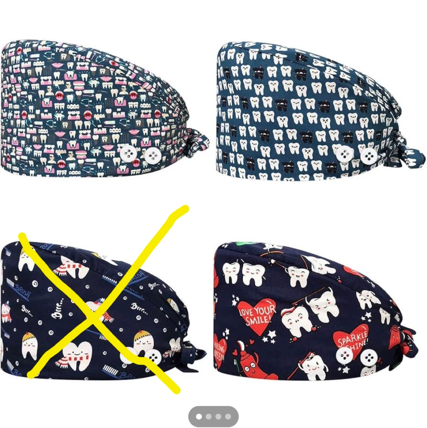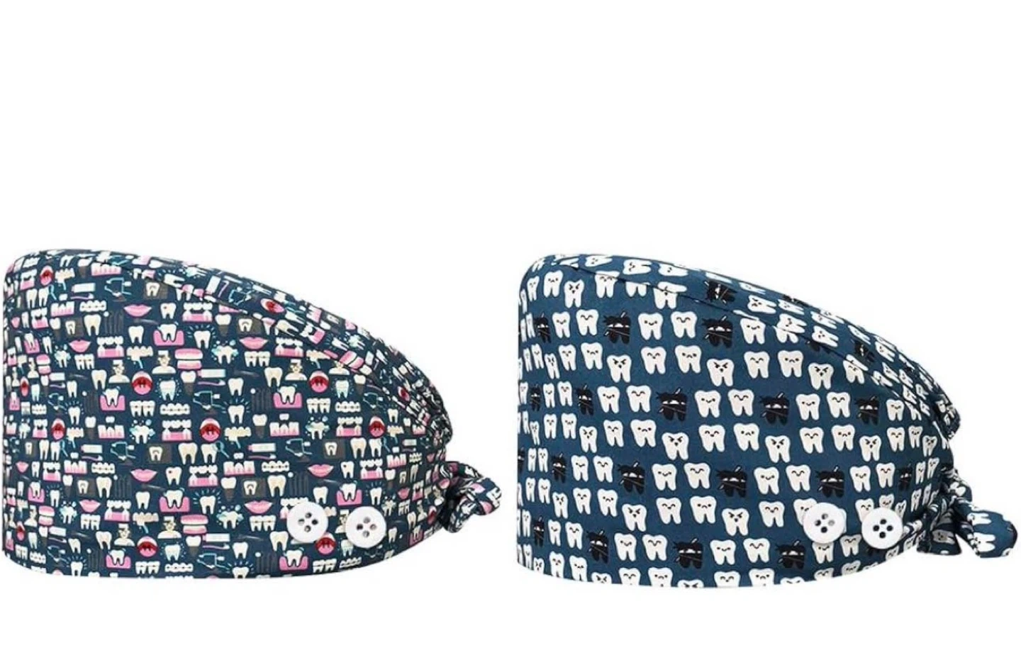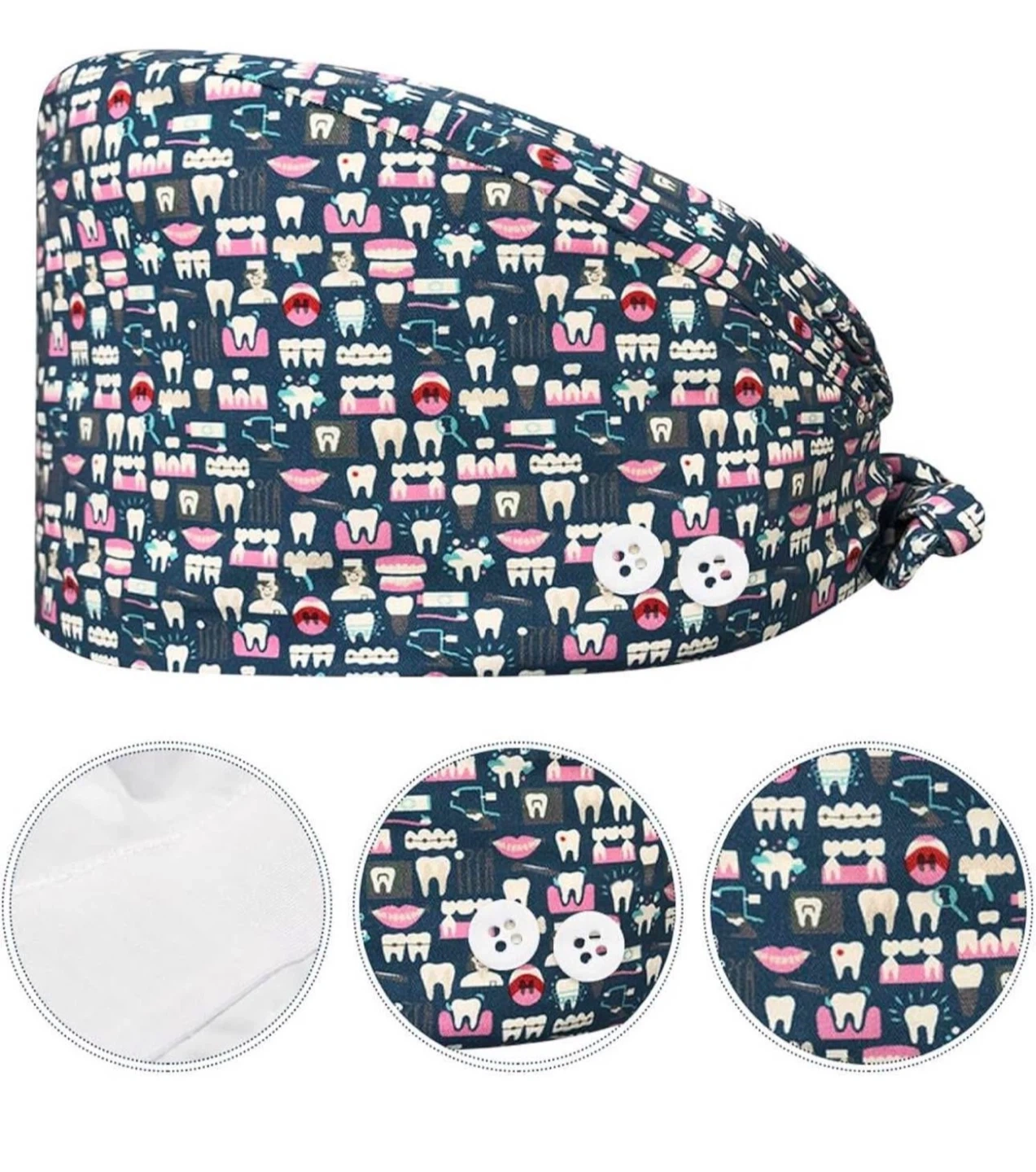 Cute dental scrub caps with fun patterns! Perfect for dentists, hygienists, or anyone in the dental field. They have a button and tie to keep it secure. Available in assorted patterns as shown in the picture
