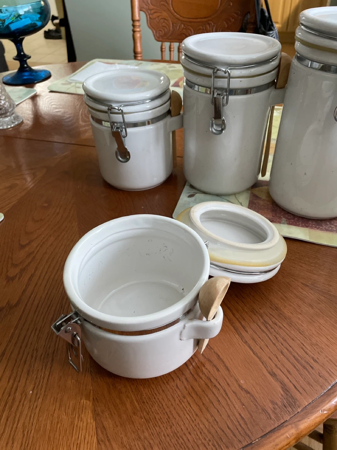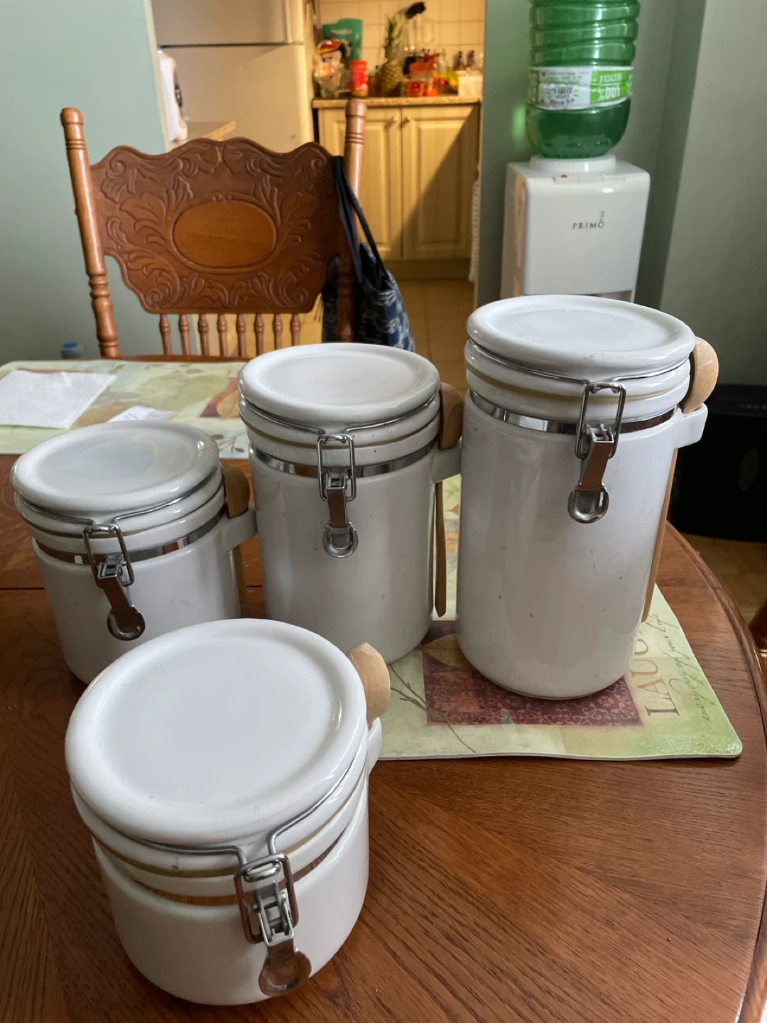 Selling a set of four ceramic kitchen canisters. They're in great shape and perfect for storing your dry goods. The canisters have a clean, white finish with metal clasps and wooden spoons attached to the side. A lovely addition to any kitchen! For pick up only