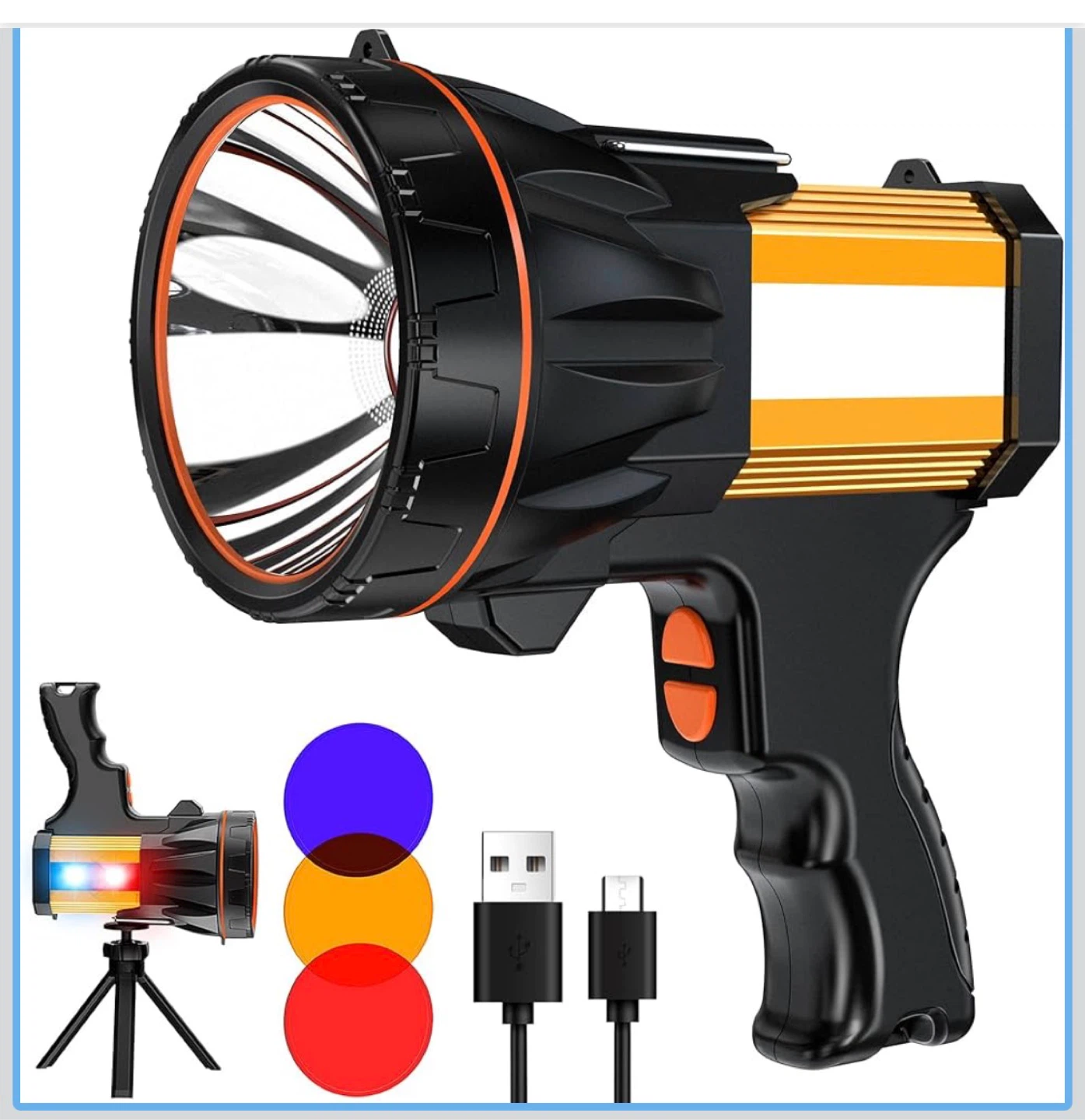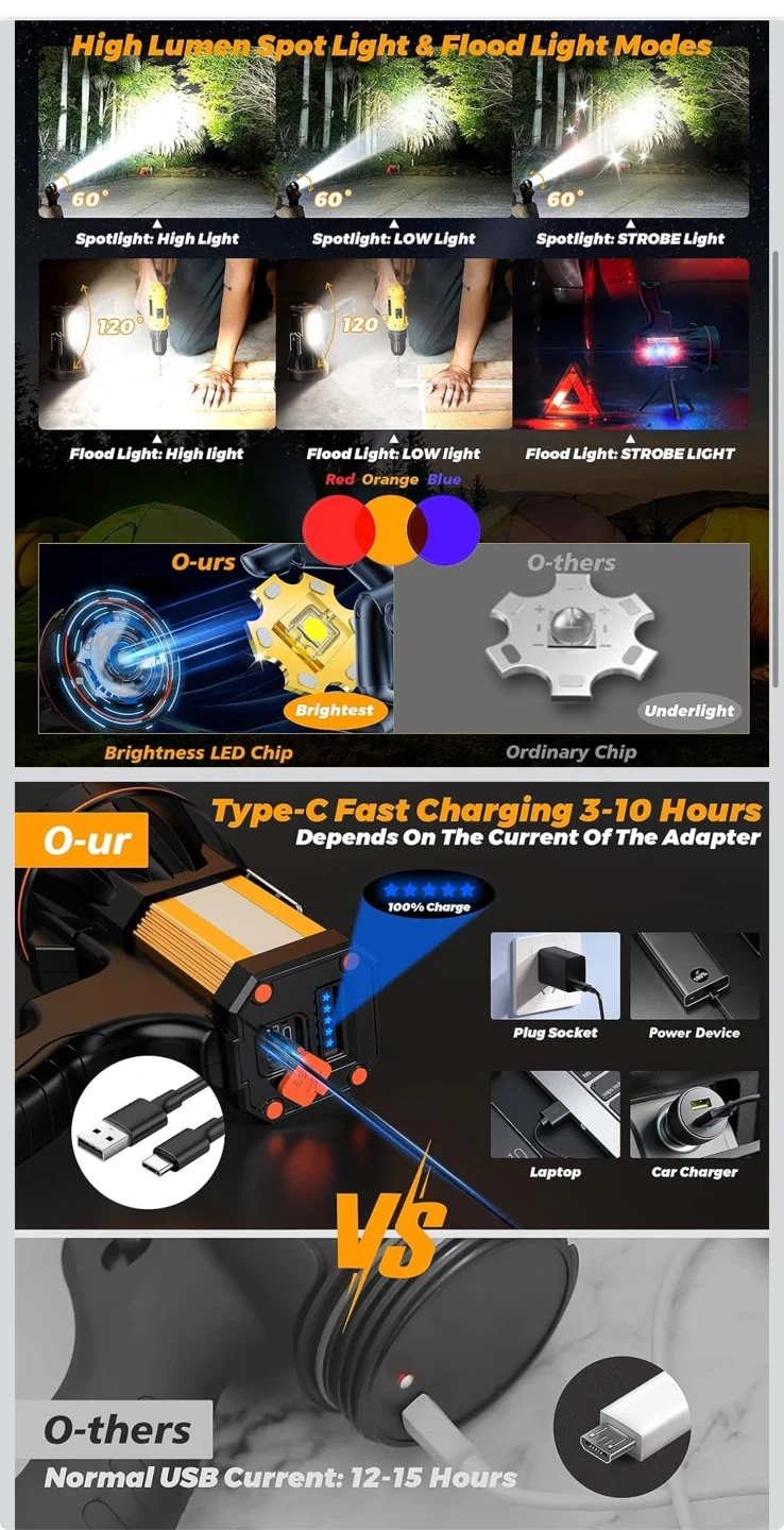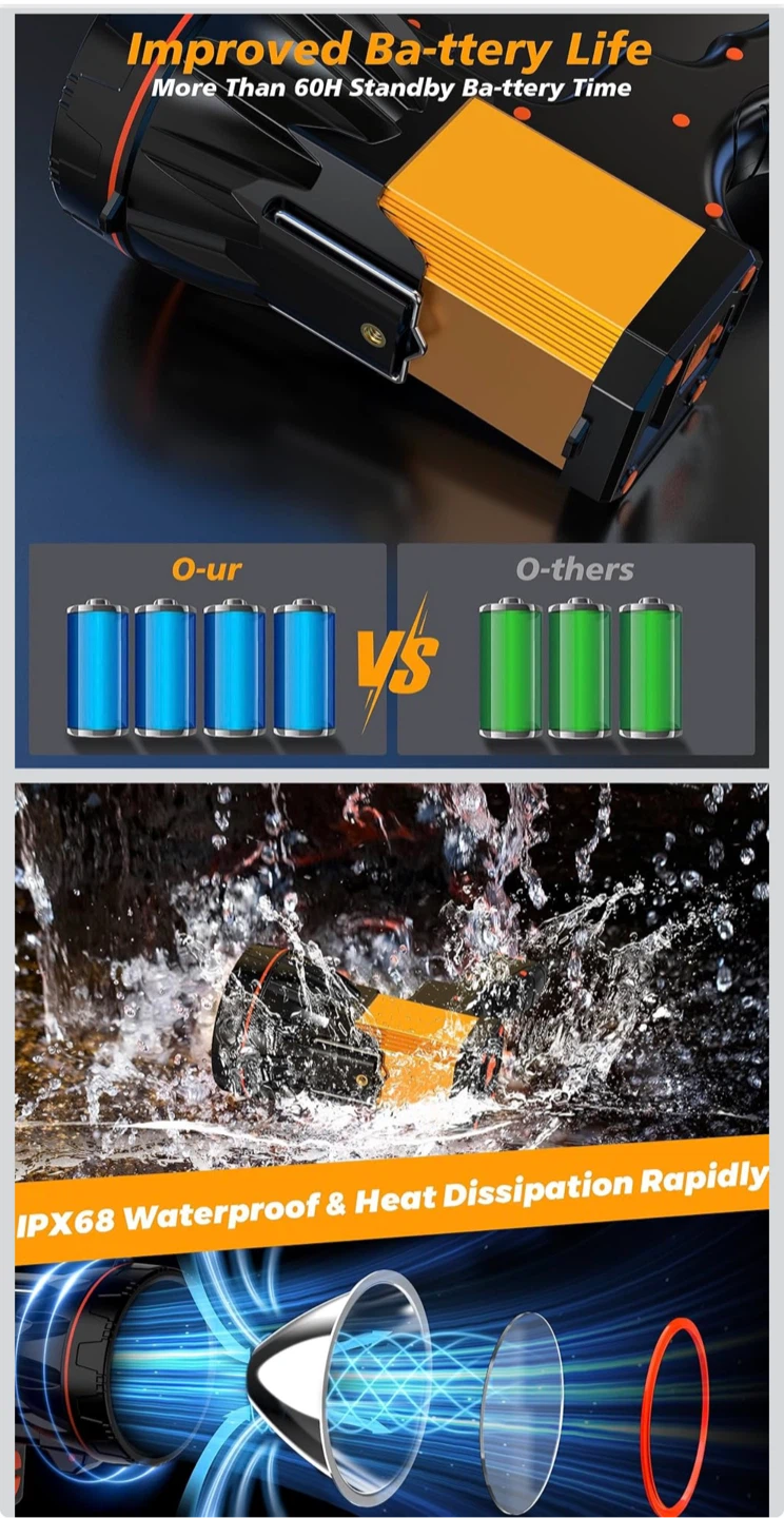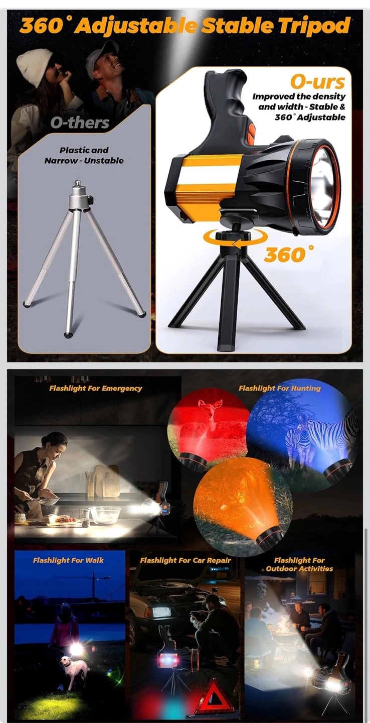 8 Modes 1000000 Spotlight Energy Saving Function, More Than 60 Hour Standby Time LED Flashlight, 360° Adjustable Tripod and IPX68 Waterproof for Camping Hunting Emergency Walking