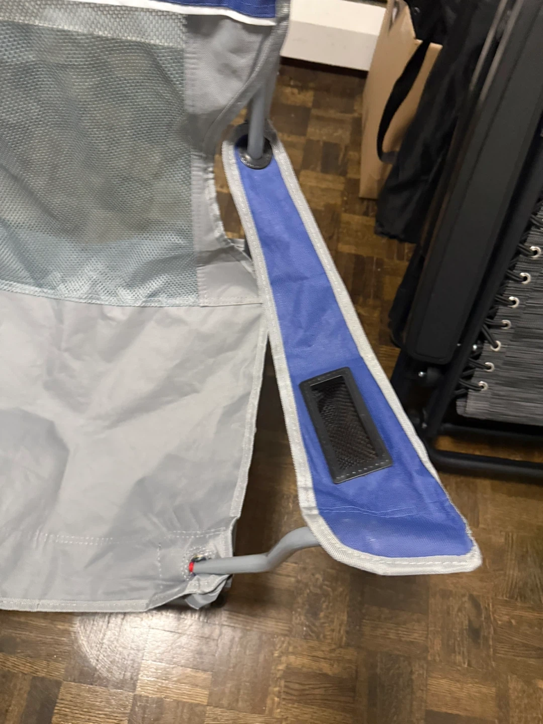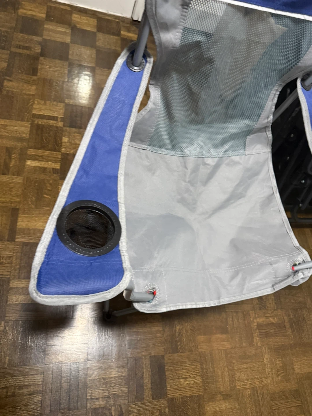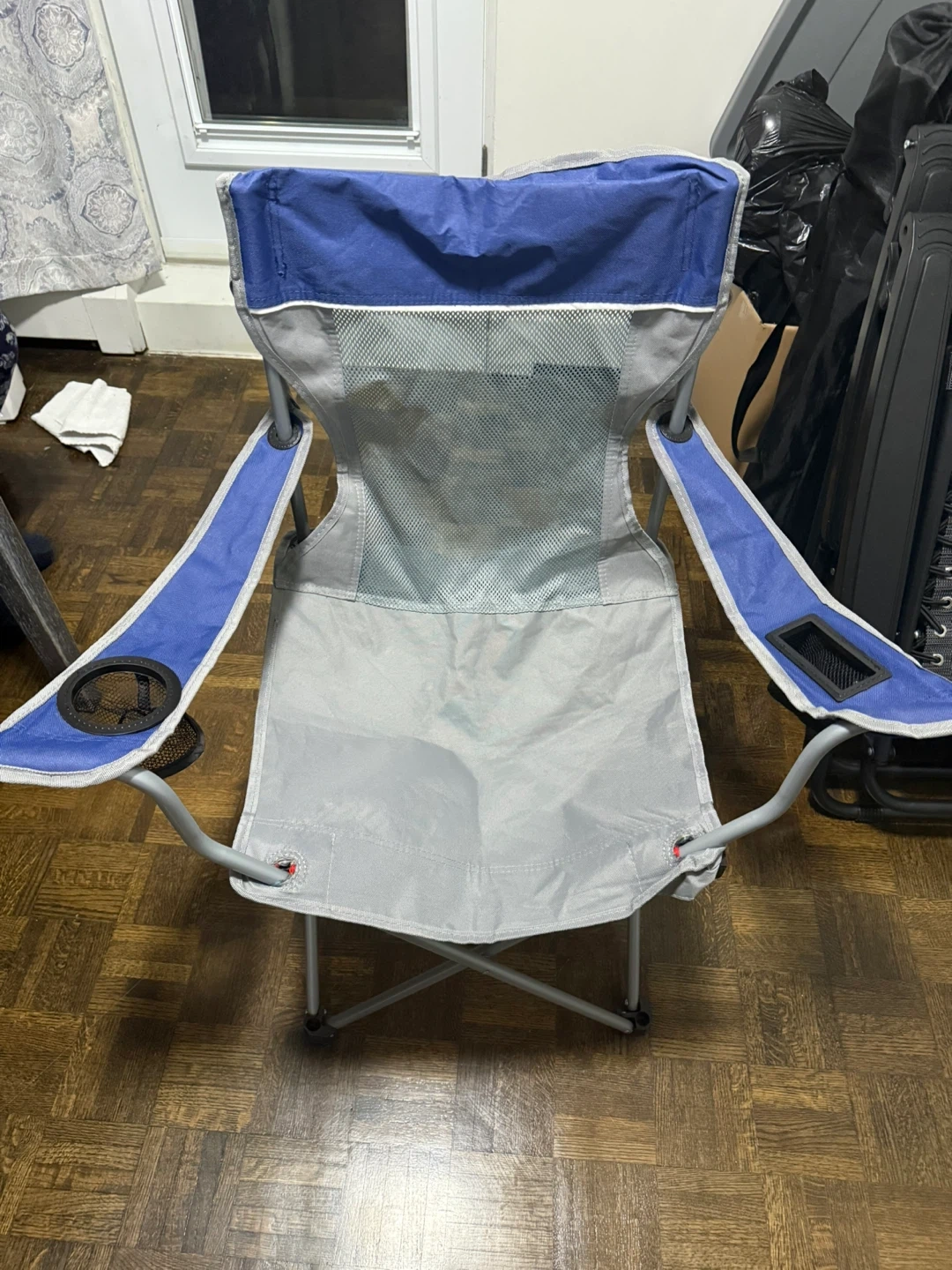 Selling a folding camping chair in blue and grey! It's lightweight and portable, perfect for camping trips or relaxing in the backyard. It also has a convenient cup holder on one of the arms