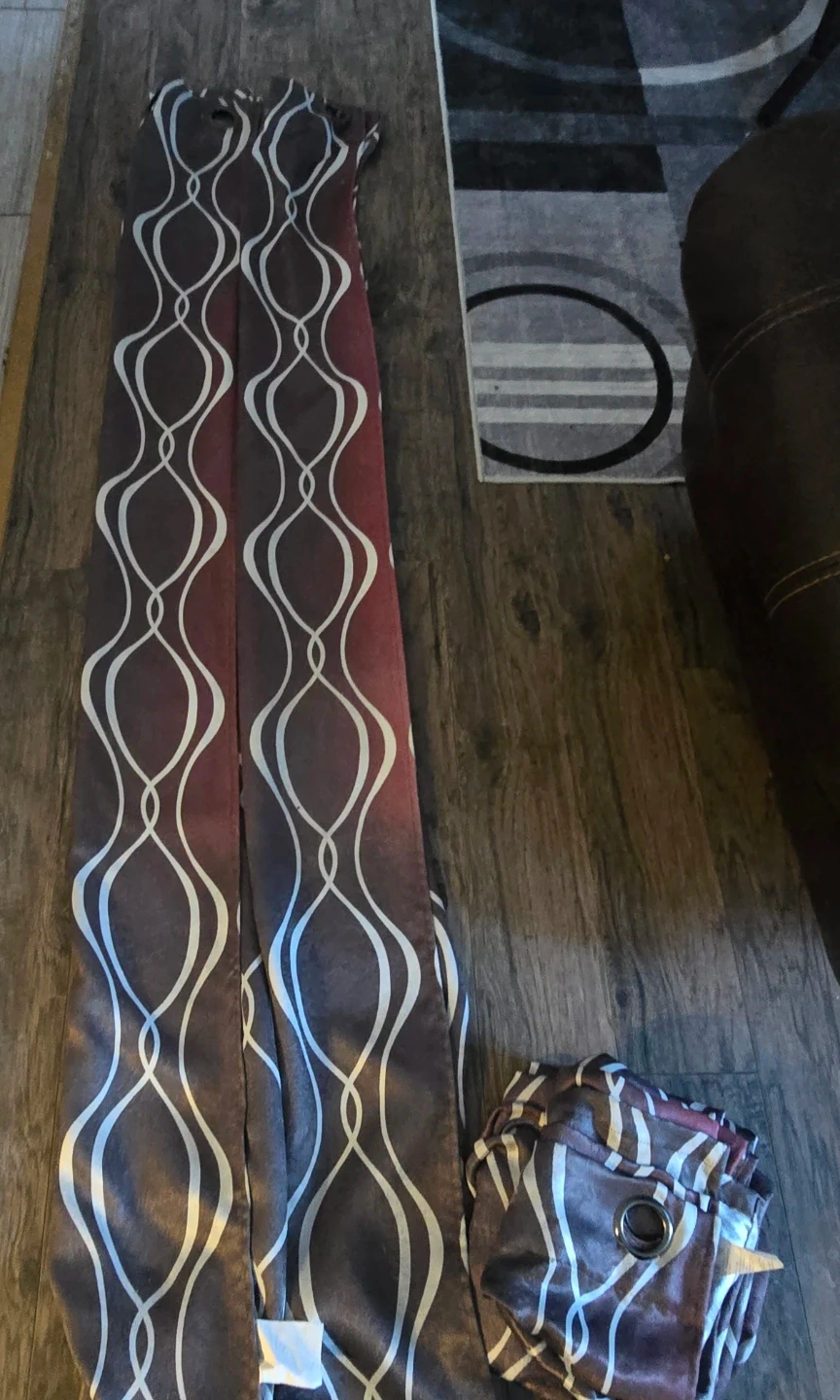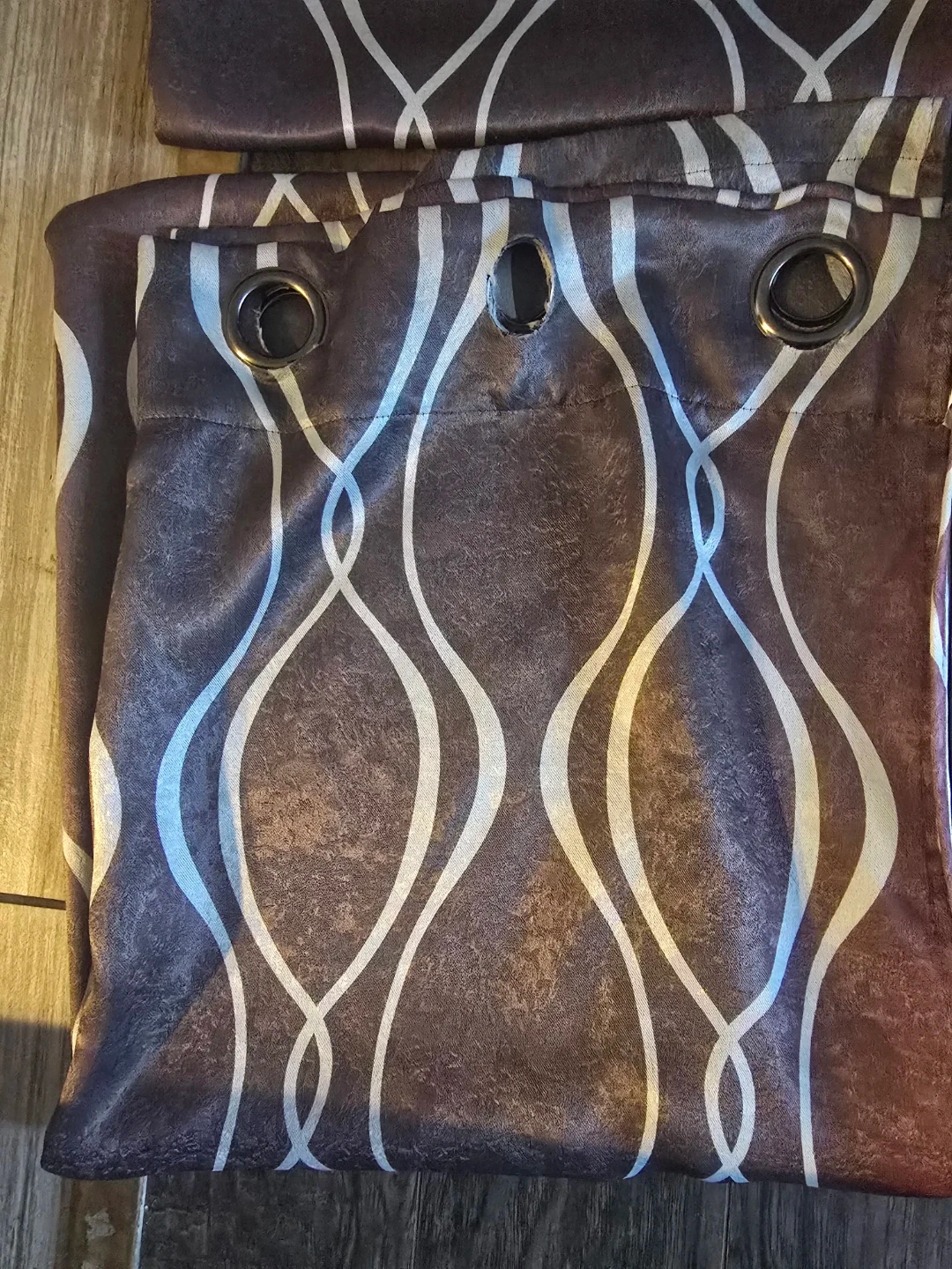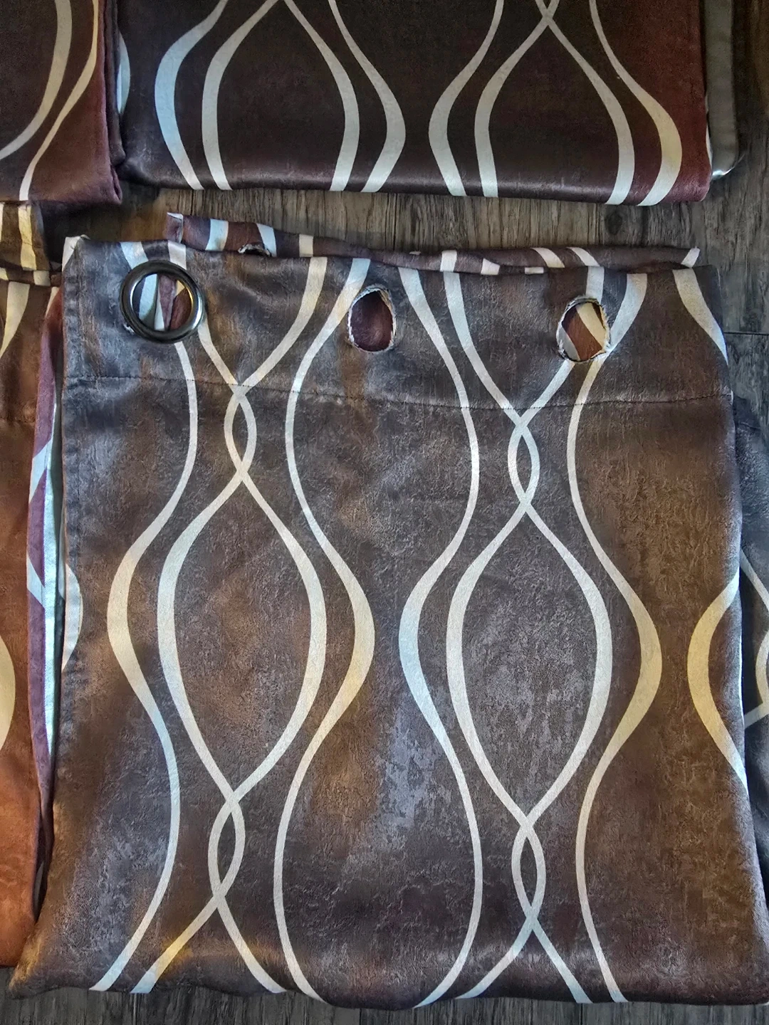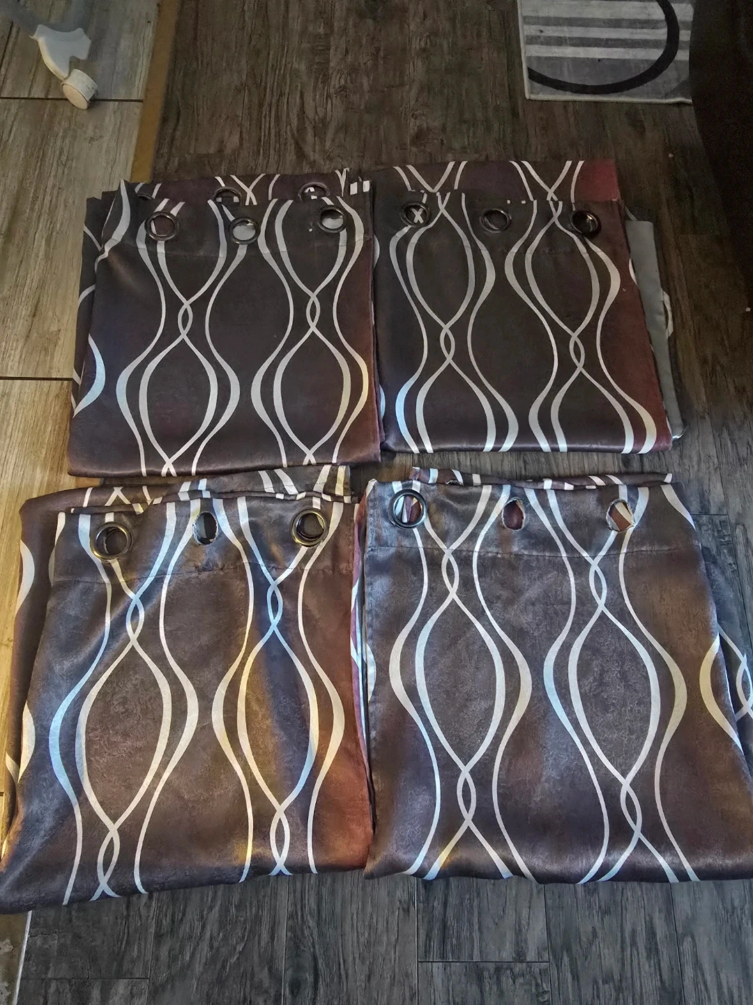 Here's a set of four curtains with a stylish brown and white wavy pattern! They have grommets at the top for easy hanging. These curtains are in good used condition and would be a nice addition to any room two of the 4 curtains the rings are fine but the other two curtains the rings are missing but they still hang fine. Asking $15