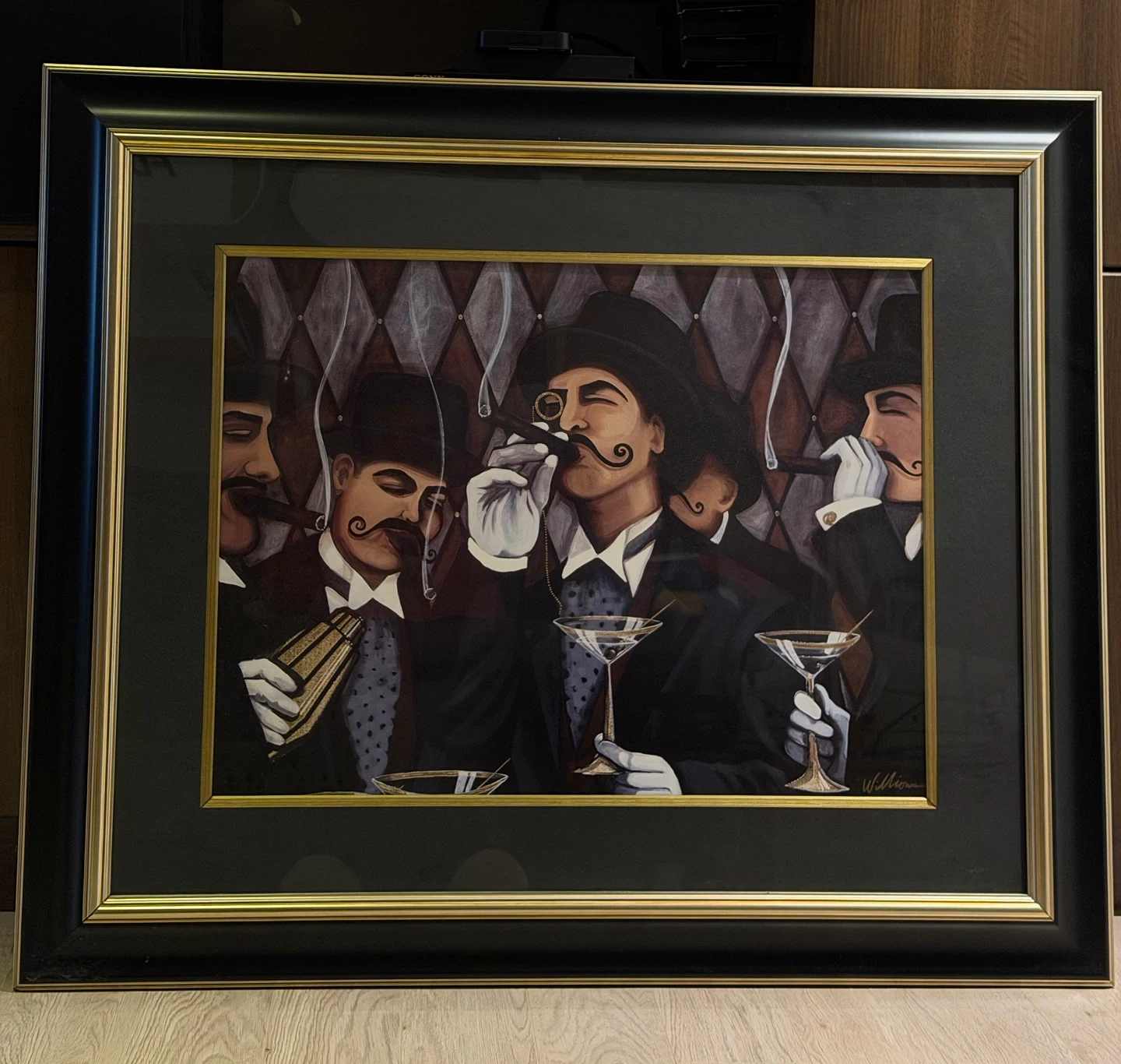 Here's a framed painting featuring men with cigars and martinis. It has a black frame. It's in excellent condition.