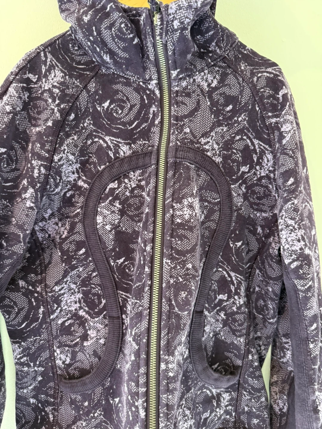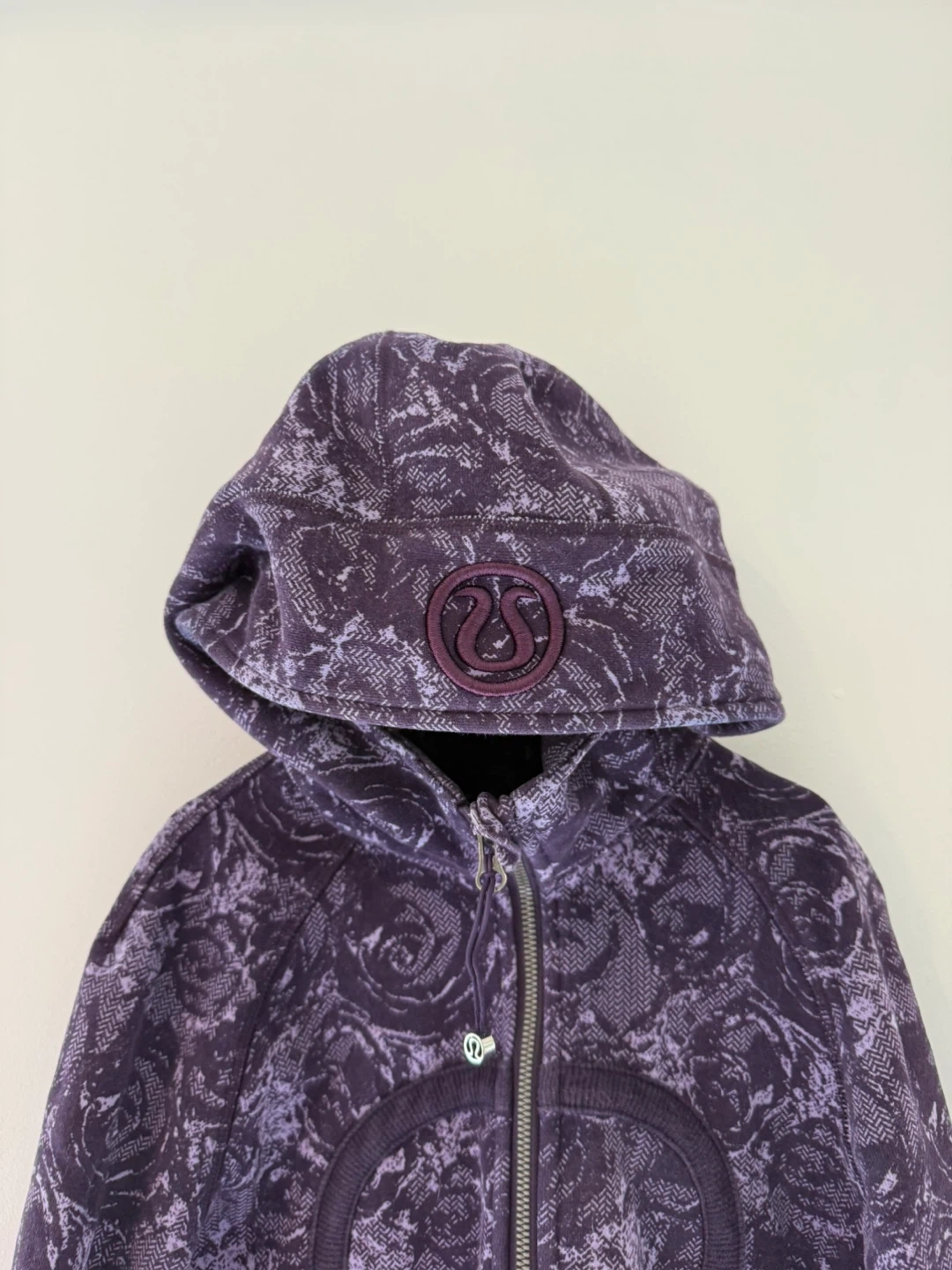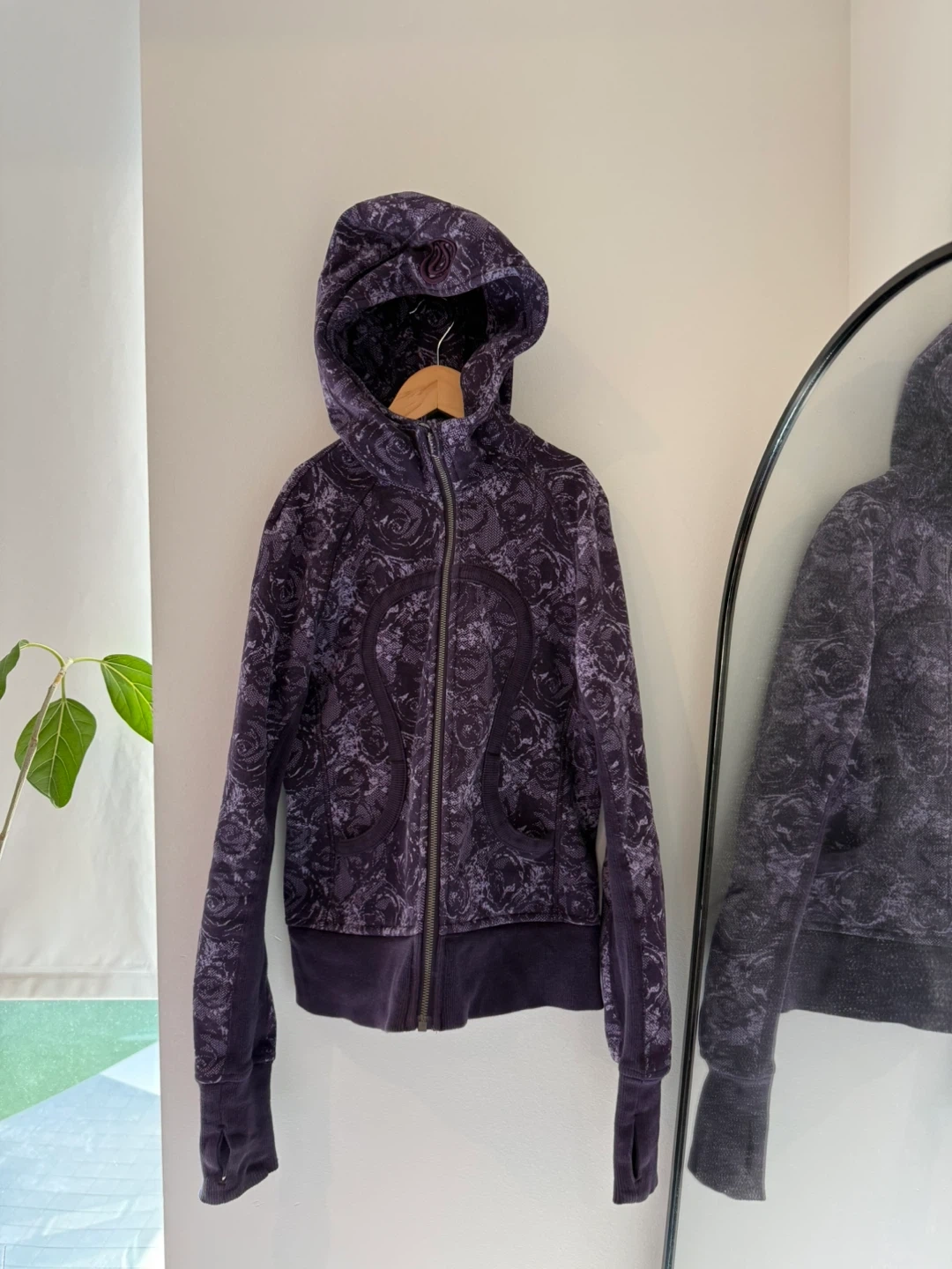 Selling a 2010s original Lululemon Zip Up Hoodie in a unique purple floral pattern. It's a full zip style with the signature Lululemon hair tie still on the zipper. Pockets are non zip and sleeves have thumb holes.