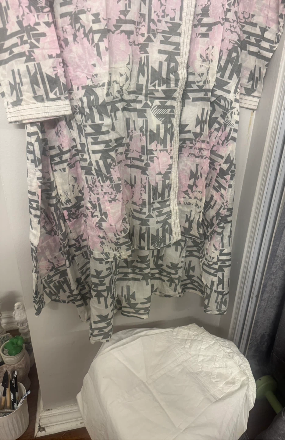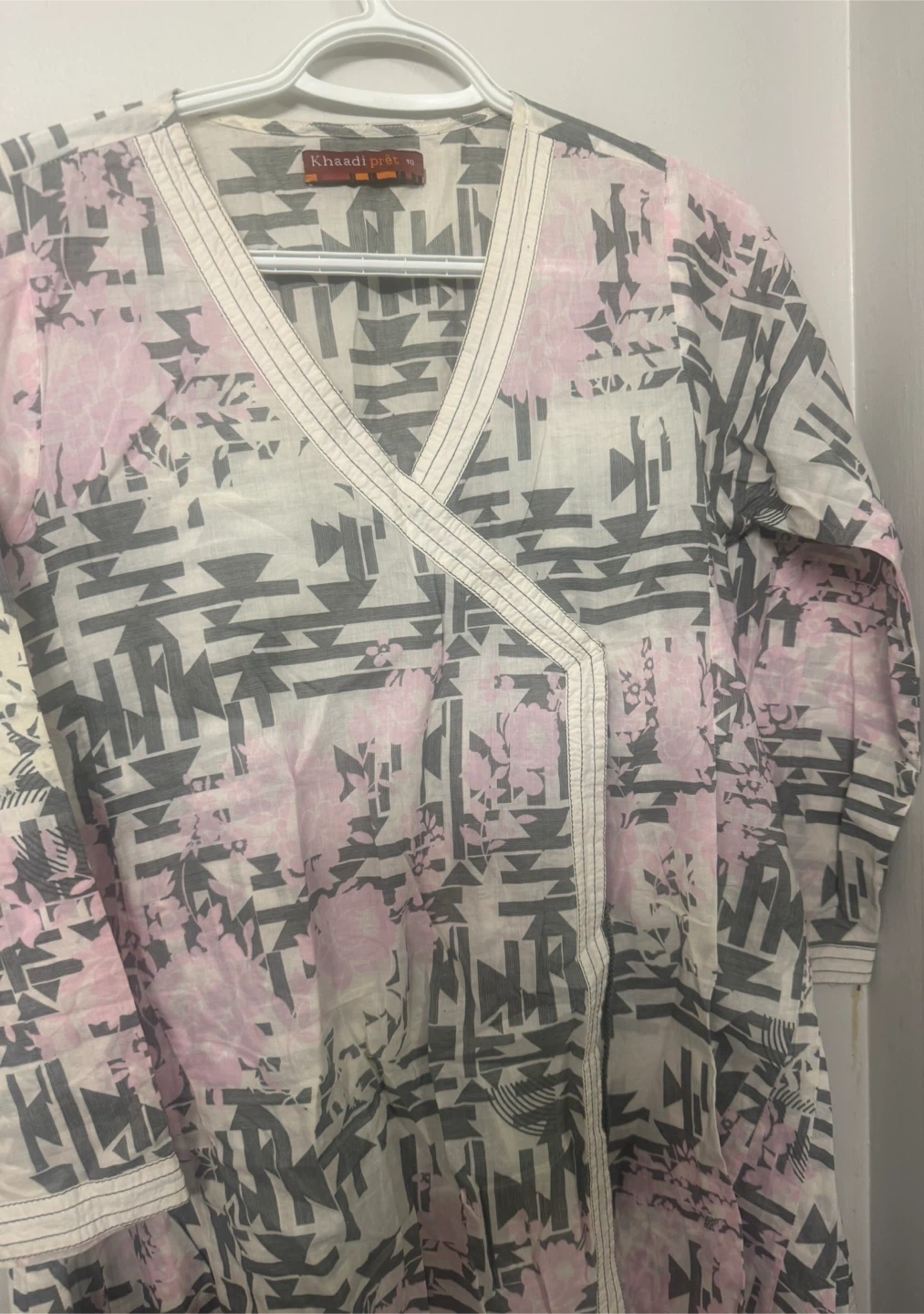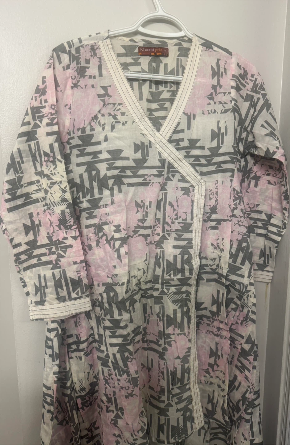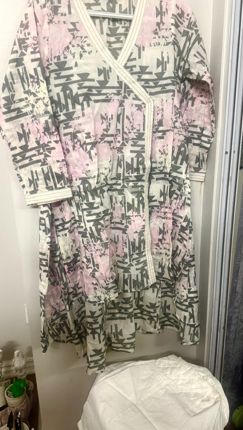This is a Khaadi brand kurti dress. It features a unique print with pink and grey tones angrakha. It is size medium and is in good condition. Perfect for casual wear!