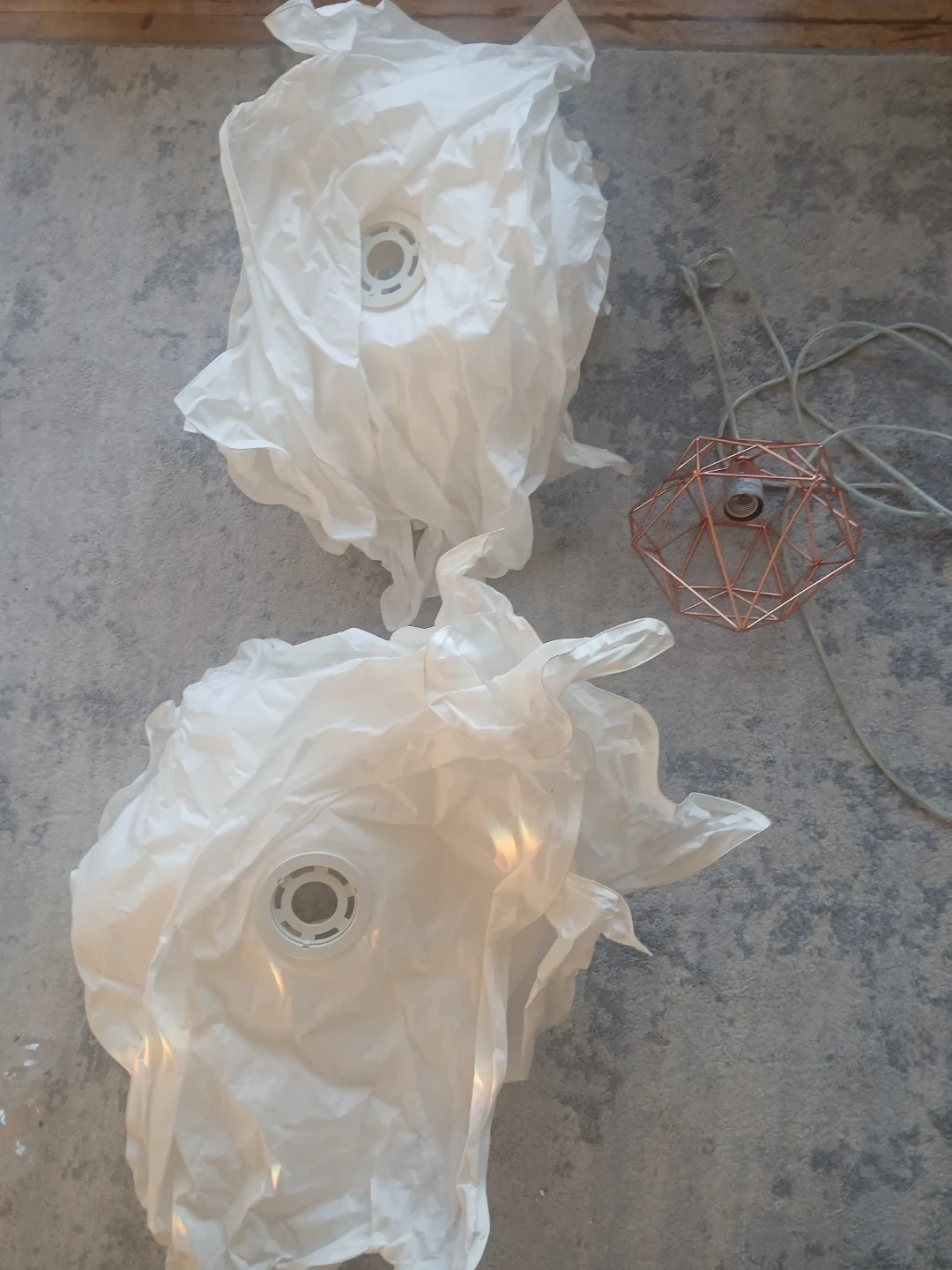Selling a stylish double paper lampshade ( Ikea KRUSNING) and a geometric pendant light with a rose gold frame. The KRUSNING shade is discontinued in Canada. It's has a wall plug in feature with on/off switch. It's fully functional. Looks very modern and stylish ( see photo of it hanging and lit in 3rd photo). It has a really nice soft glow. I am changing it to another lamp shade, so getting rid of this one.